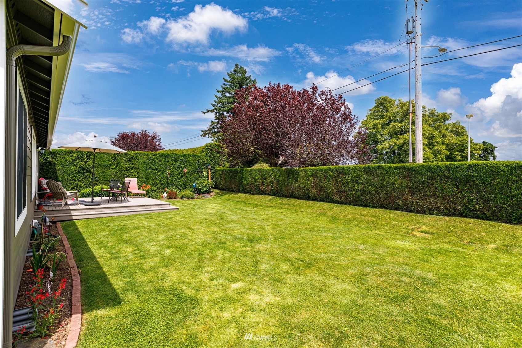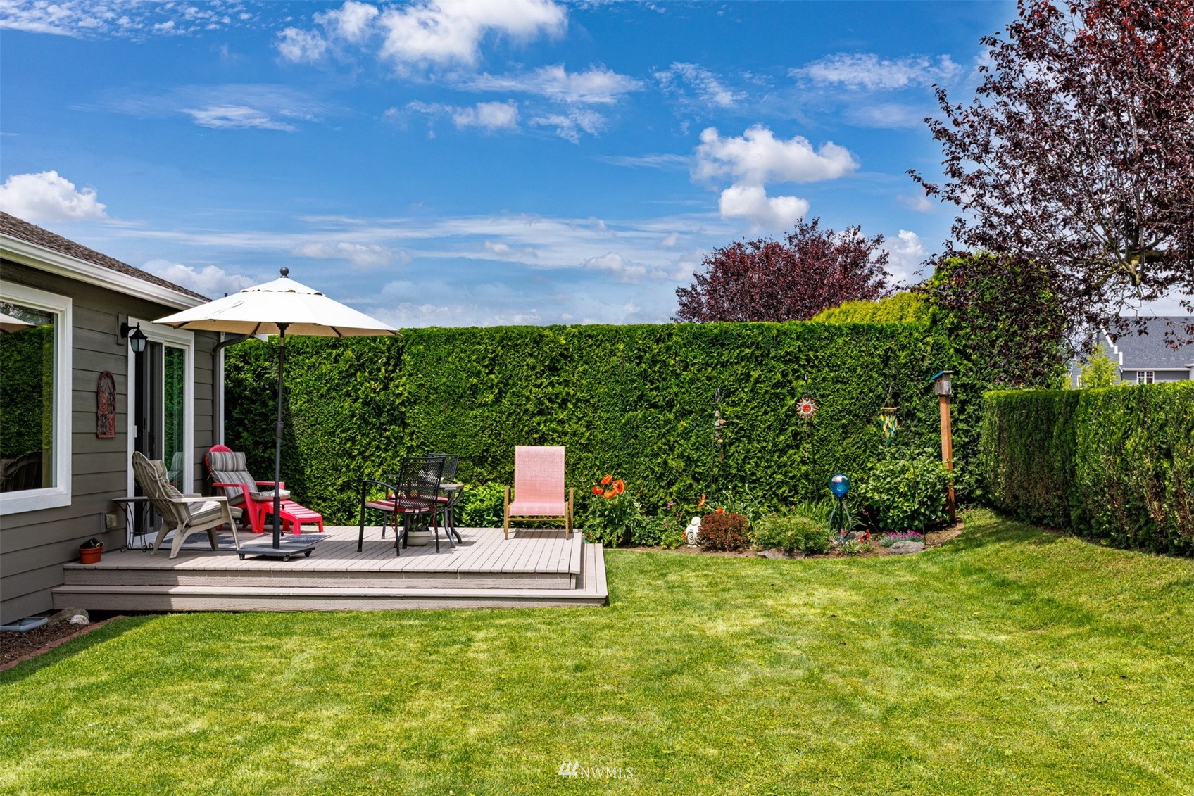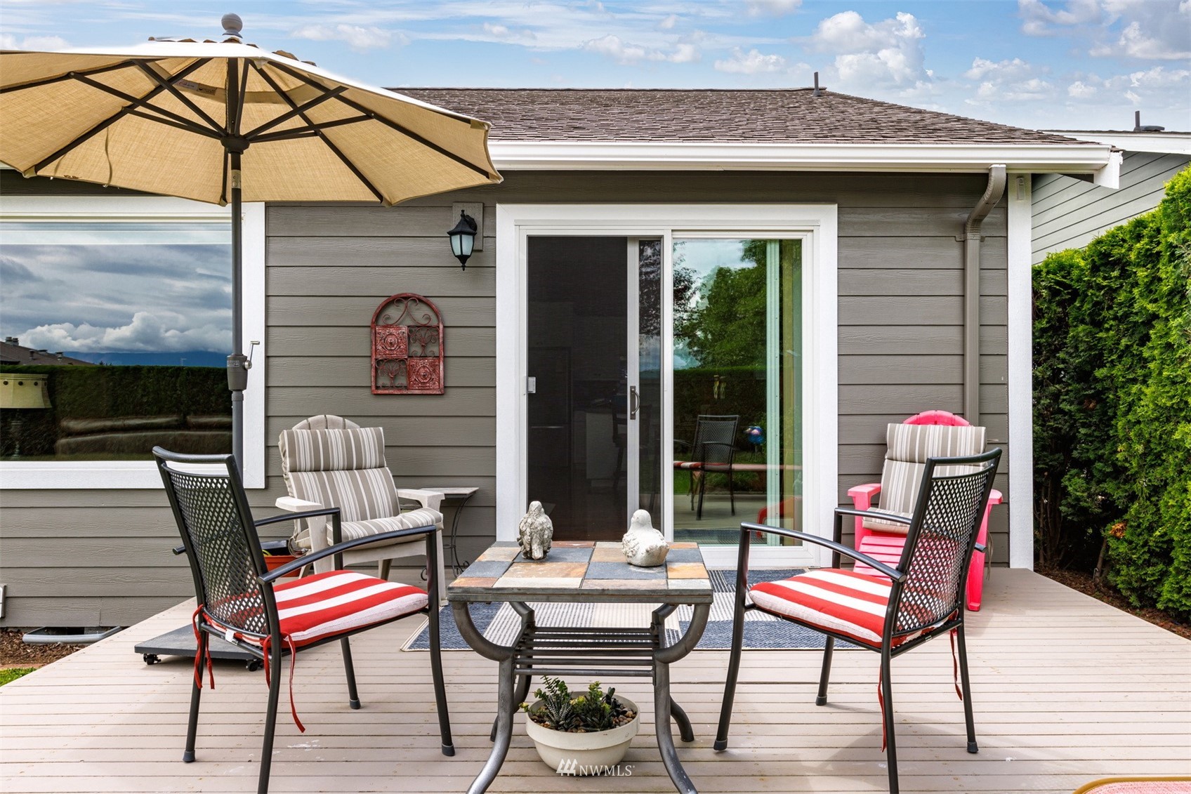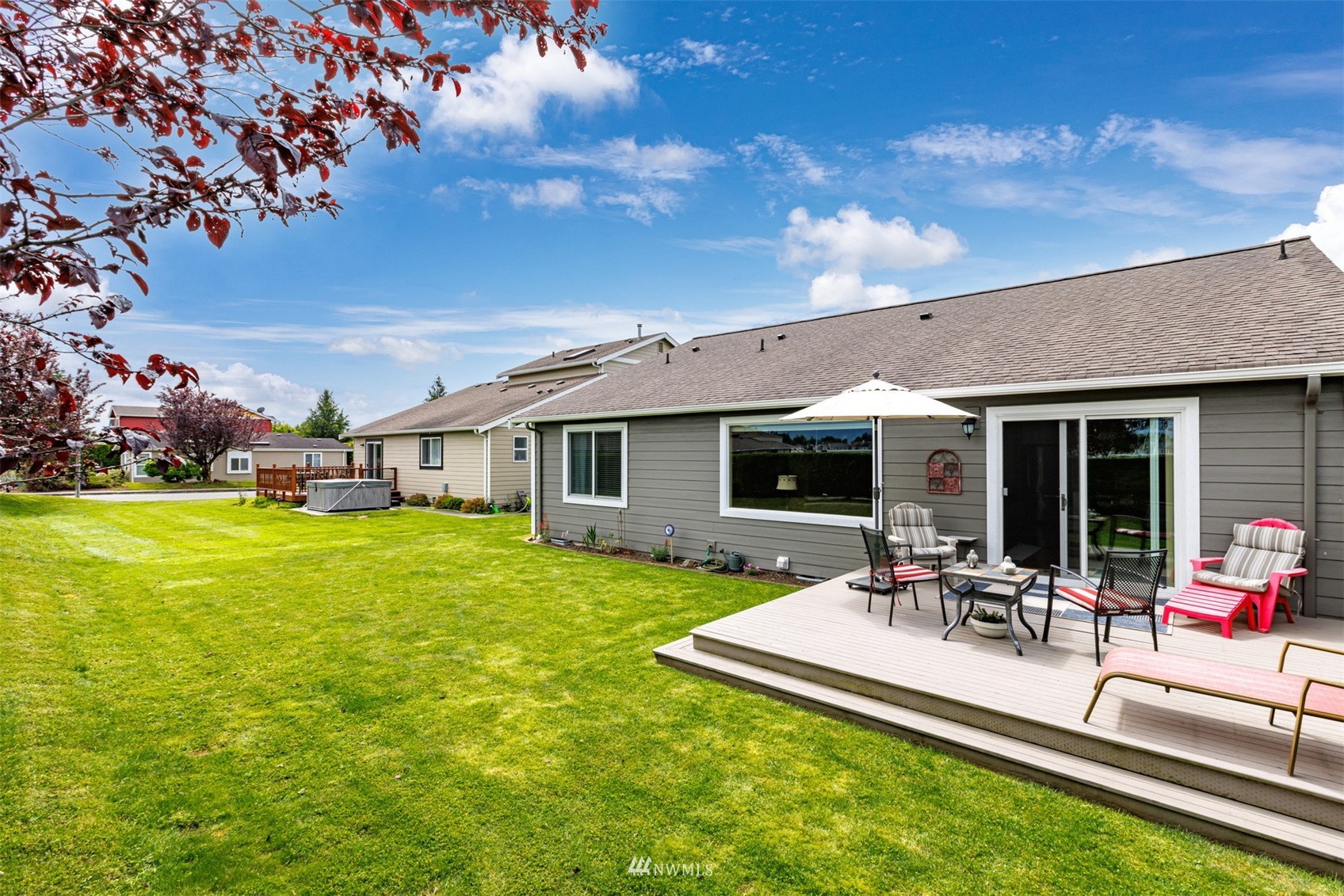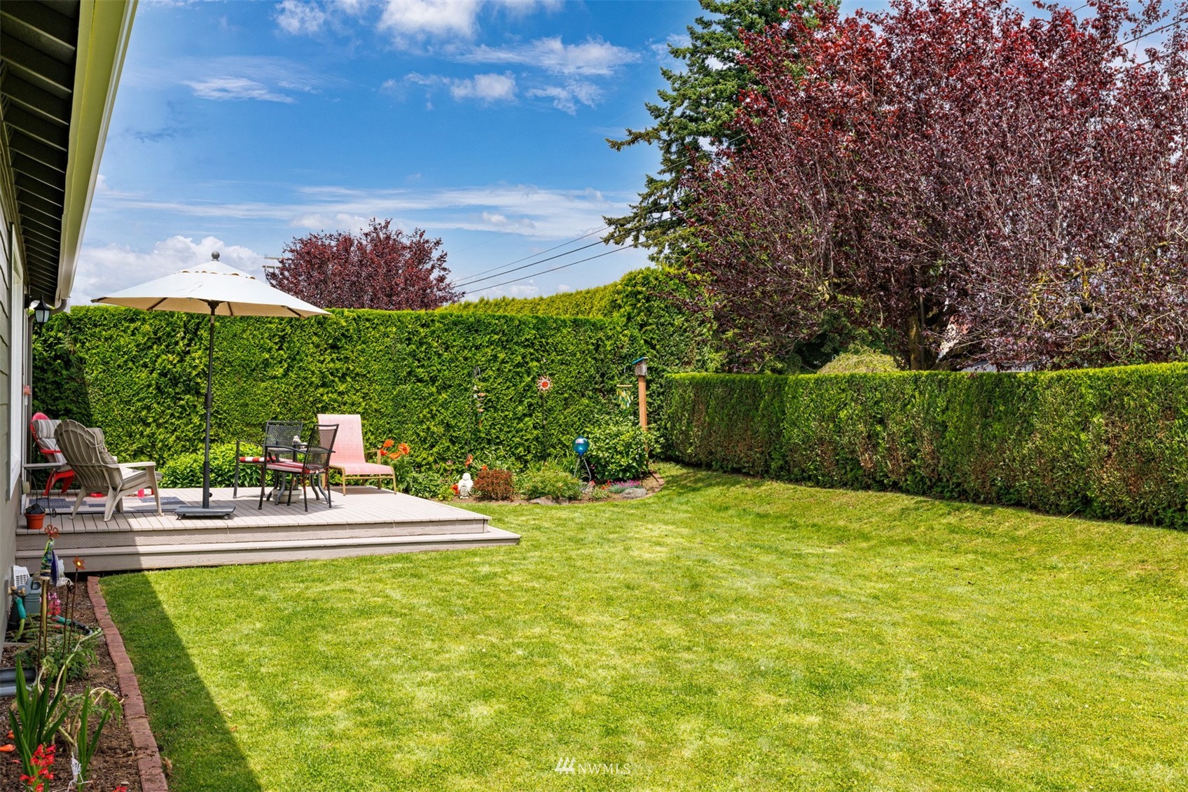 This pristine single level home has an open floor plan with magnificent Mount Baker views, and is on a large level lot with easily maintained landscaping surrounded by a private hedge. The living room is open to the dining and kitchen and has vaulted ceilings and large windows looking out to the views of Mt Baker and the Twin Sisters. The master is very spacious and also takes in those views, while the other two bedrooms are on the opposite side of the home giving privacy. There is an attached, oversized 2 car garage with pull-down stairs and attic storage. The kitchen has a large eating bar and an abundance of cabinets and counter space. This home has been meticulously maintained and there's secured RV parking available in this community.