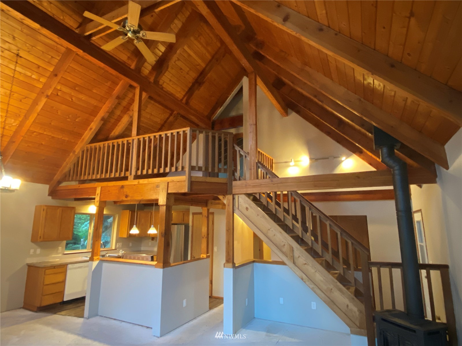 Rural Waterfront Property, close to Shopping, Recreation, restaurants & resort. Spacious open Floor Plan w/3 bedrooms, 2 baths. Loft has master bedroom and extra living area. 3.38 acres on Nelson Creek, dead end street. 4 car garage-shop with outside cement driveway for multiple parking. Nicely landscaped, with surround decking front and back. Fresh paint inside. Two French doors off upper deck and off dining area. Large yard for play and entertaining. Come to the Heart of the Cascades. Make appointment for showing time.