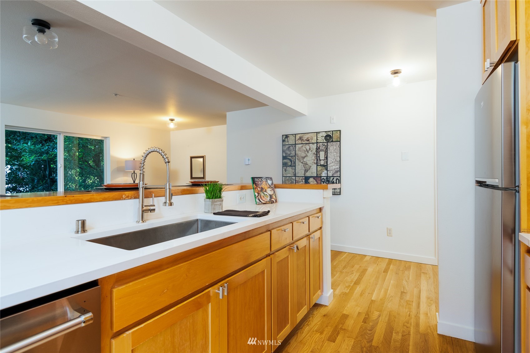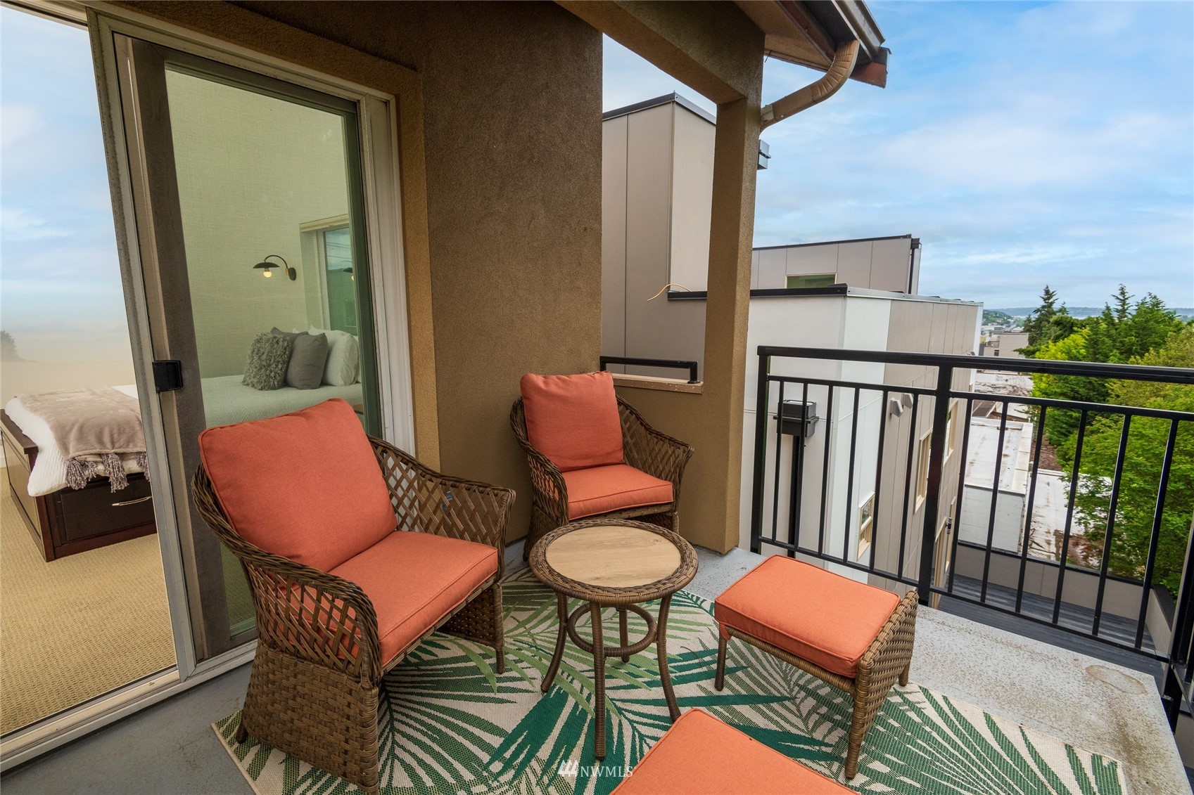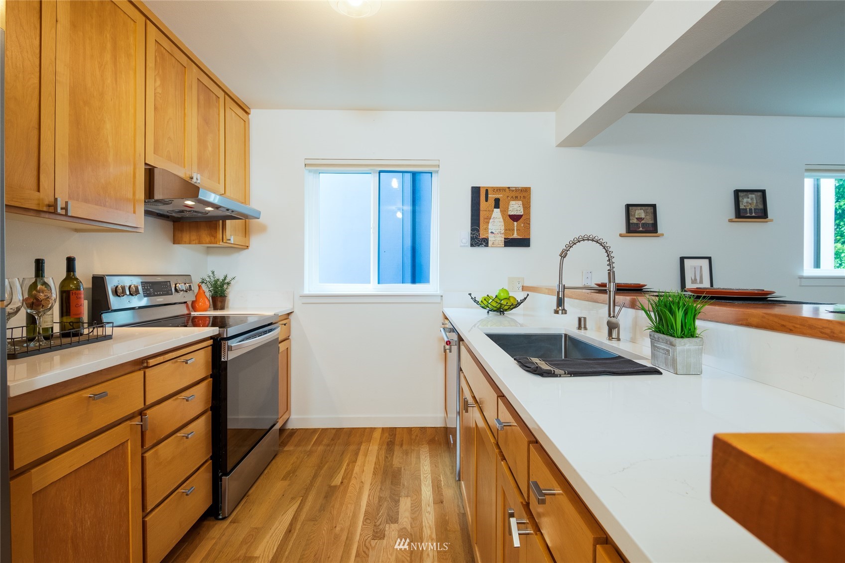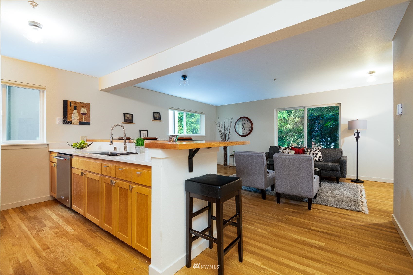 Quiet Unit in classy multi-level condo in prime Ballard location. The atrium common space with vaulted ceilings welcomes you as you enter the property. The naturally lit main floor living area is open concept, and the kitchen boasts of new quartz countertops, a breakfast bar with seating for 4, and newer appliances. Along with a building envelope upgrade in 2021, recent updates in the unit include recent paint and refinished hardwoods. Second level has a large bedroom with private deck, adjacent to laundry and full bathroom. Top floor master suite has vaulted ceilings, walk in closet and en-suite bathroom, along w/private South and West facing deck with city and sound views. Secure parking space included, and walkable to amenities.