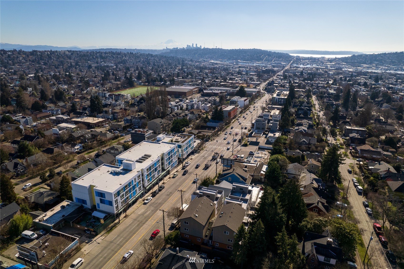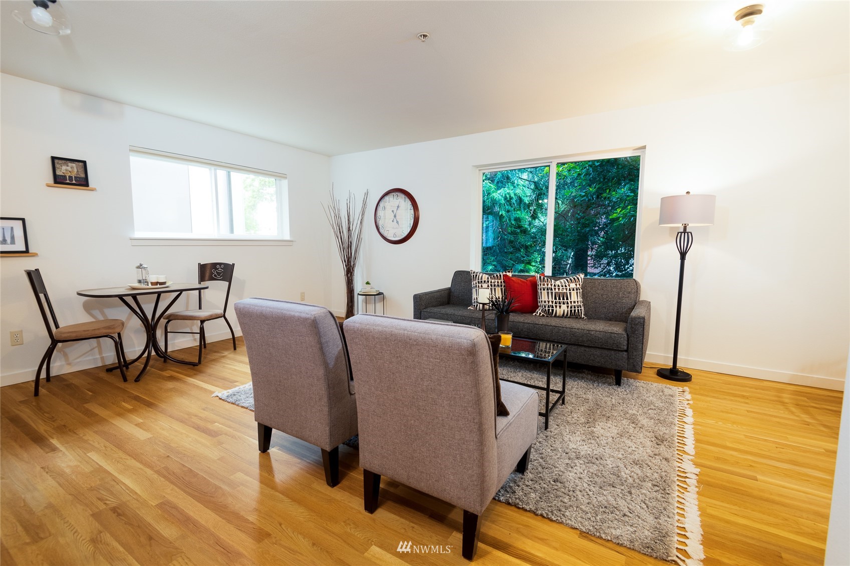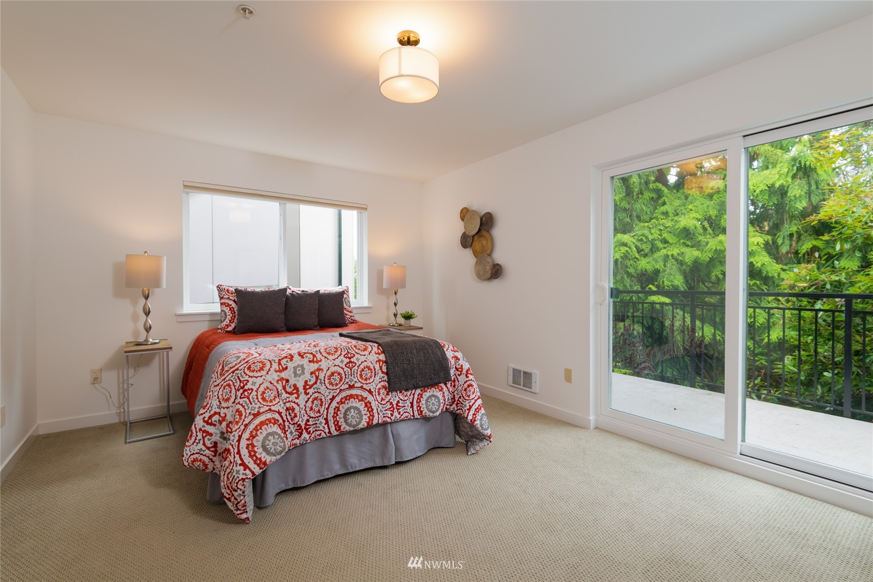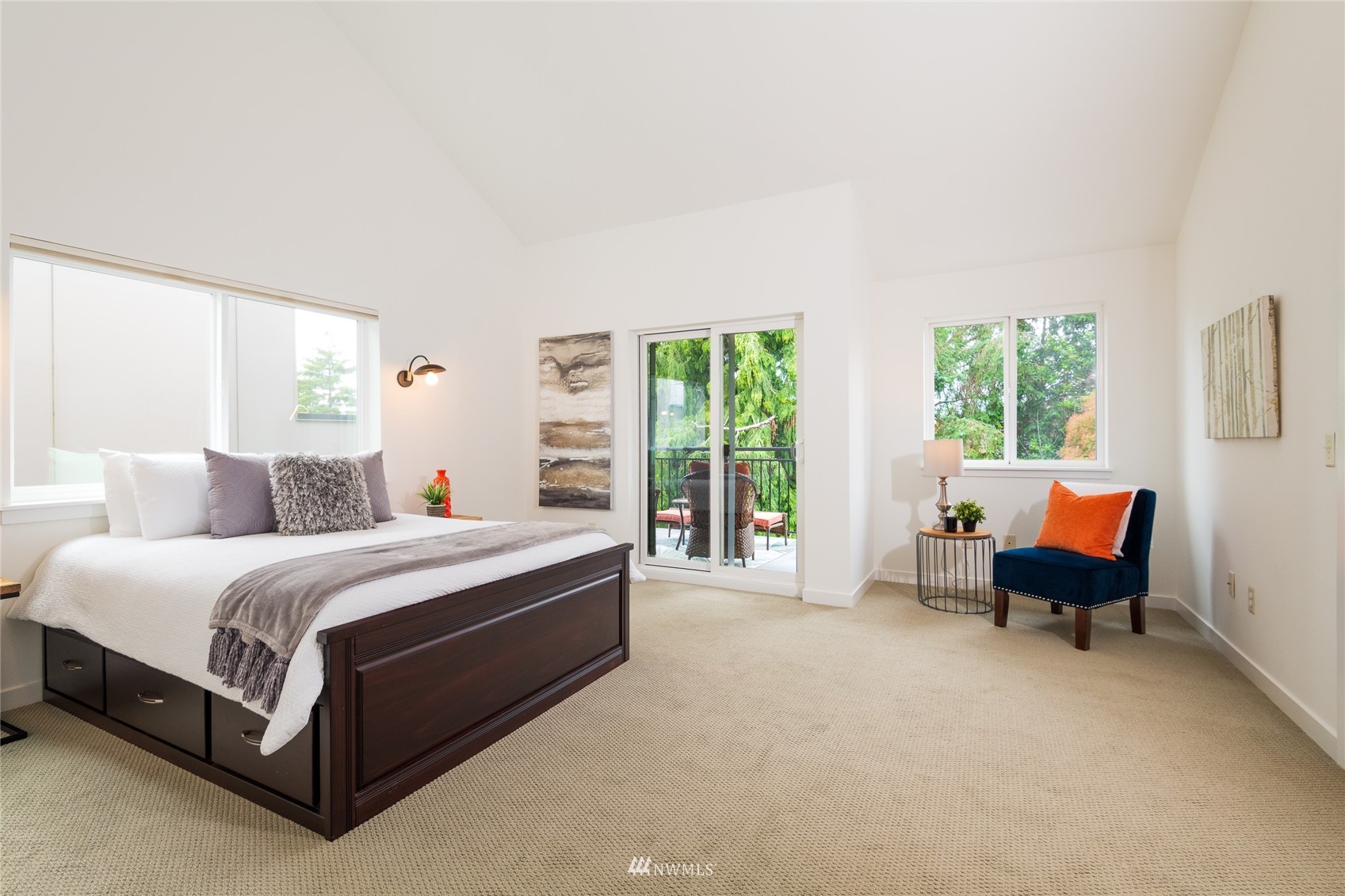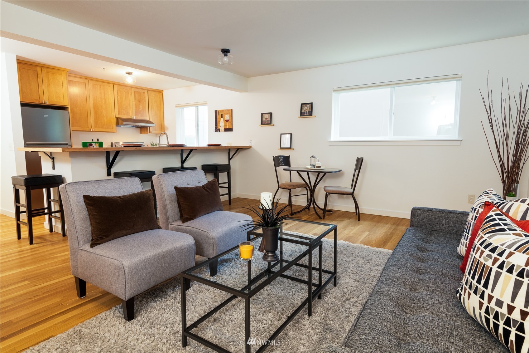 Quiet Unit in classy multi-level condo in prime Ballard location. The atrium common space with vaulted ceilings welcomes you as you enter the property. The naturally lit main floor living area is open concept, and the kitchen boasts of new quartz countertops, a breakfast bar with seating for 4, and newer appliances. Along with a building envelope upgrade in 2021, recent updates in the unit include recent paint and refinished hardwoods. Second level has a large bedroom with private deck, adjacent to laundry and full bathroom. Top floor master suite has vaulted ceilings, walk in closet and en-suite bathroom, along w/private South and West facing deck with city and sound views. Secure parking space included, and walkable to amenities.