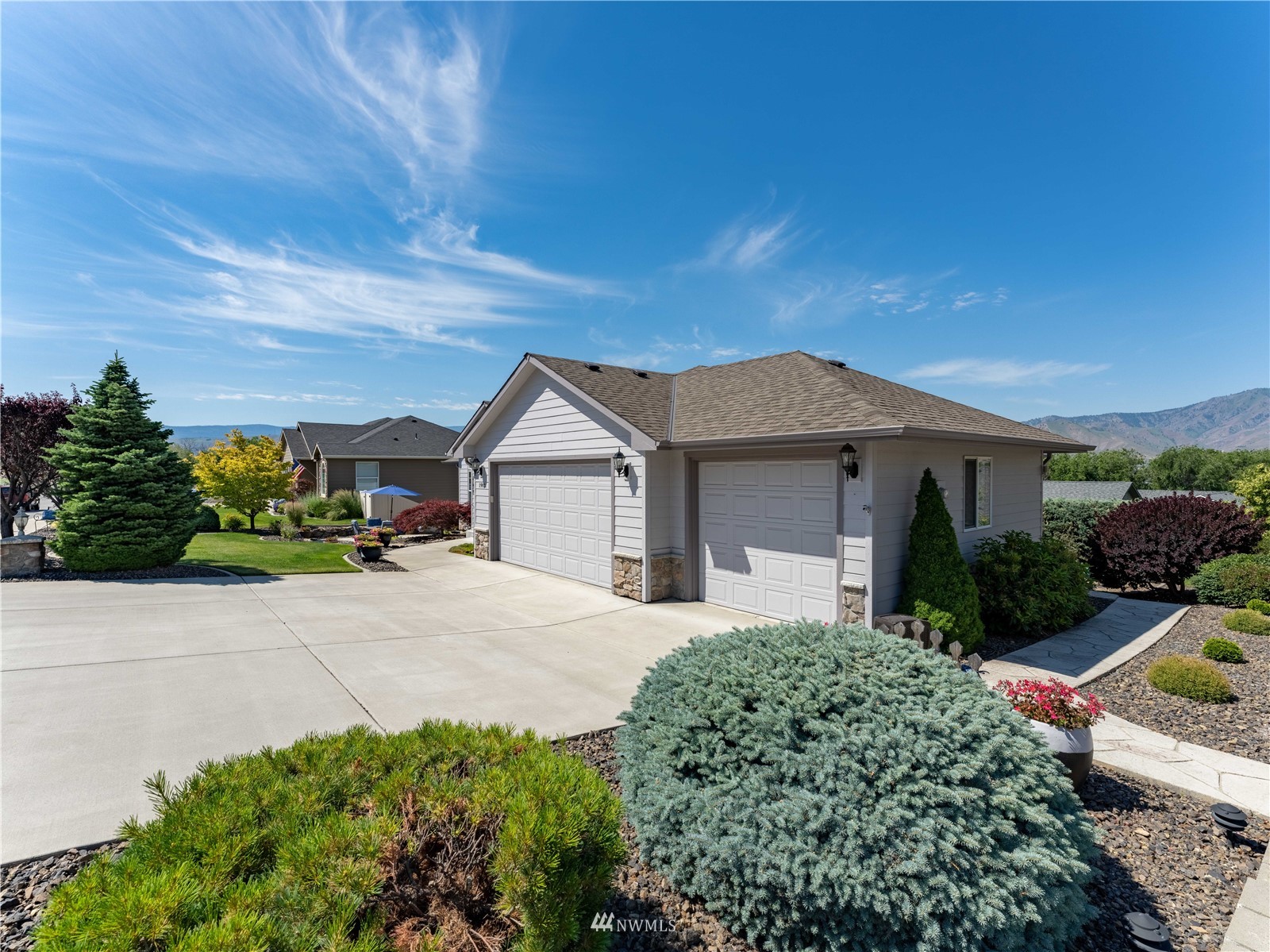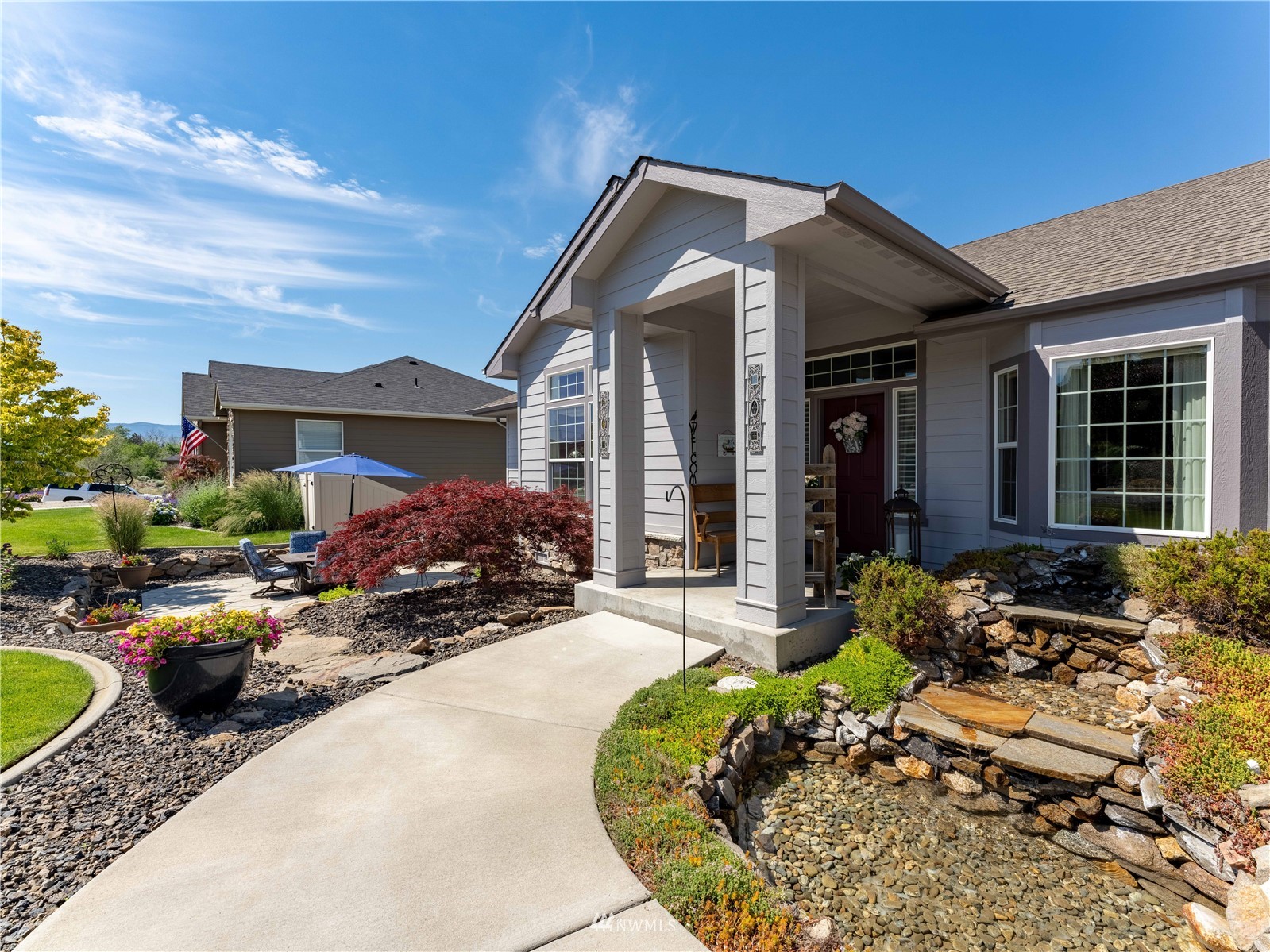 Beautiful landscaping, a trickling fountain and several outdoor gathering areas for your enjoyment. This turn-key home is ready for you rambler lovers! 3 spacious bedrooms, a cozy office and a vaulted kitchen with an abundance of maple cabinetry await you. Granite counters, an eating bar and a large family room are just a few bonus features. Escape to the living room for a quiet moment, entertain in the convenient dining area or just relax in the primary bedroom & bath. A large walk-in closet, jacuzzi tub & a tile shower to spoil you. Enjoy summer nights on the deck while capturing the mountain views & BBQ's. Extra storage in the tall crawlspace with exterior access for all that ''stuff''! One owner home and it shows.