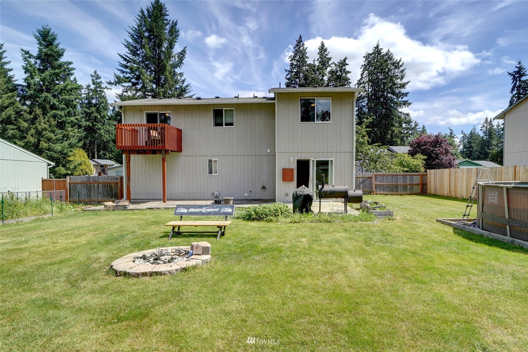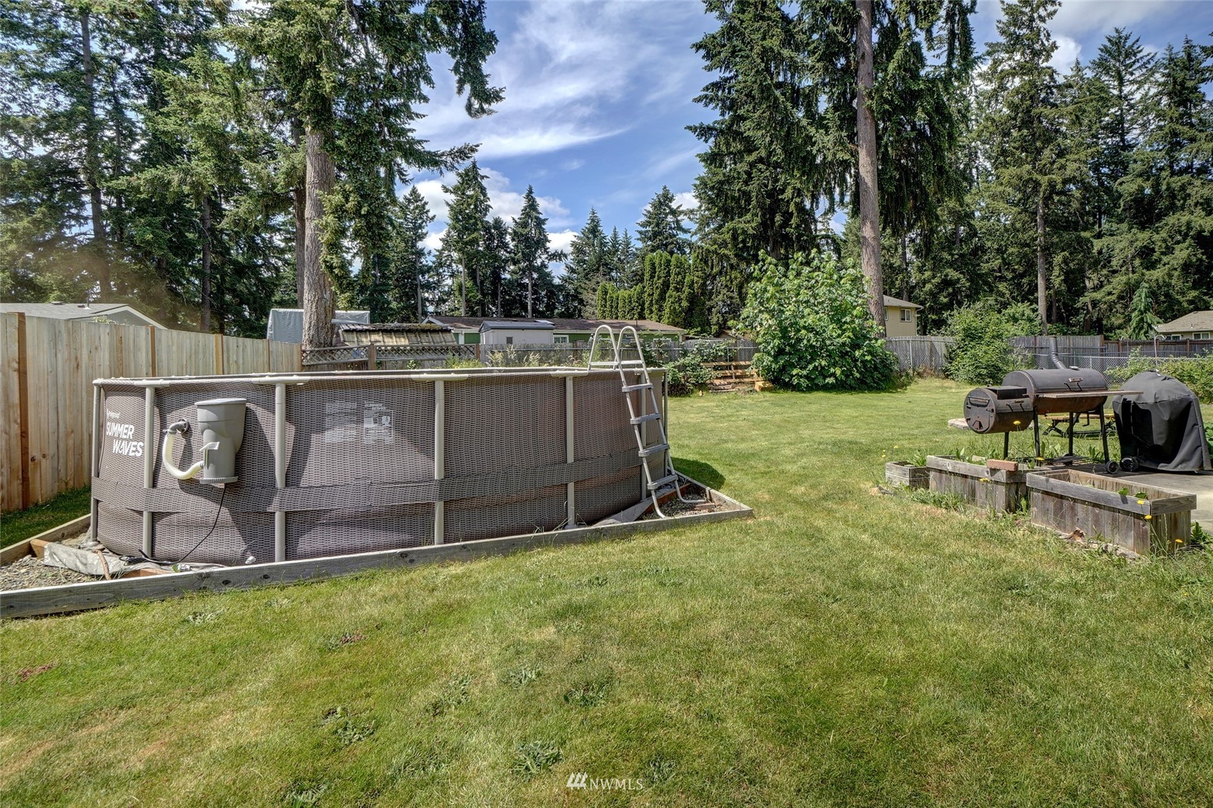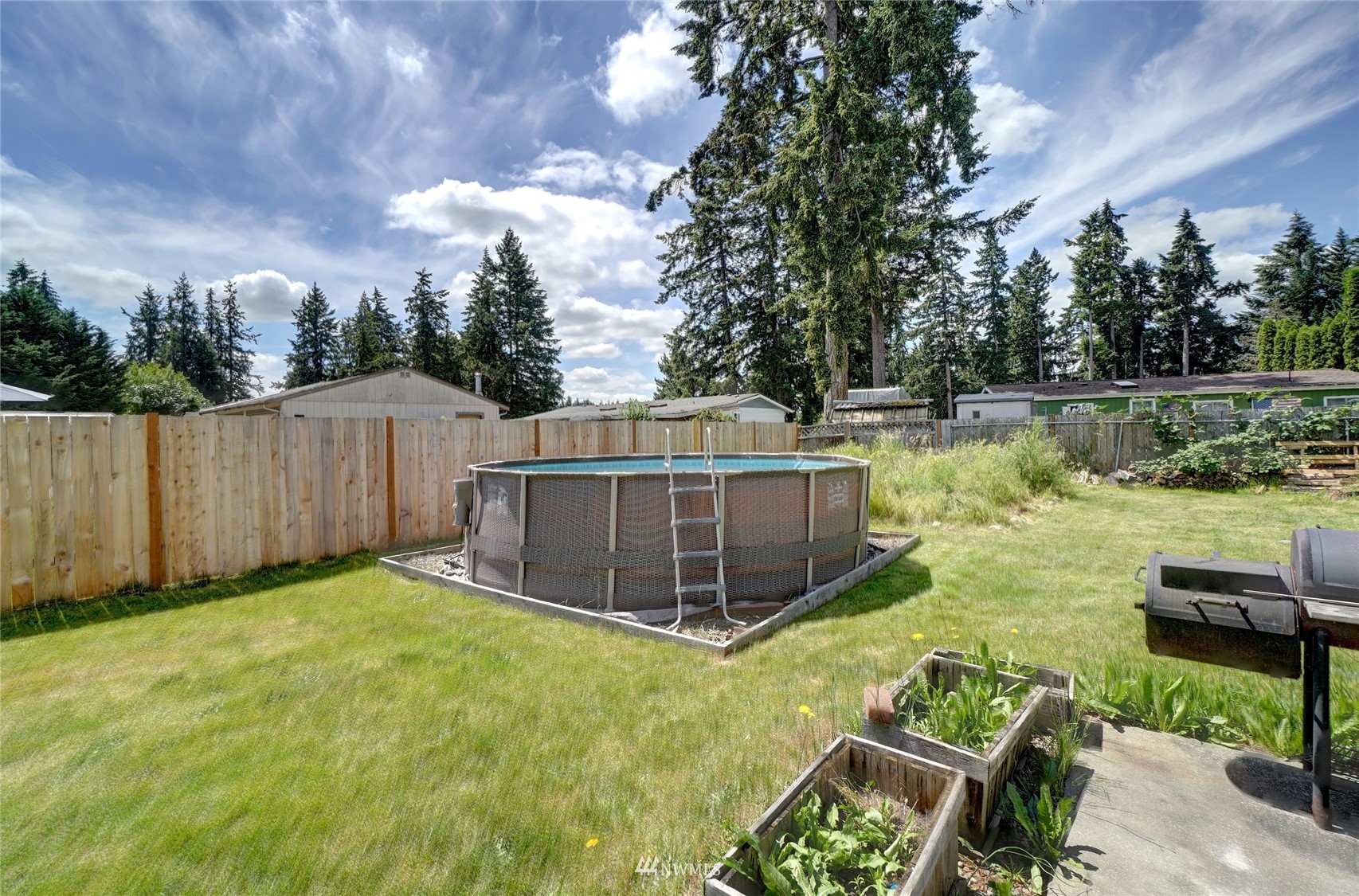 $7,000 Seller paid Buyer Bonus at closing! 1339sf 3 bed, 2 full bath, .19 acres, built in 2006. No HOA's! 7 miles to JBLM East Gate. Lives like additional living space with bedroom, full bath and living room on lower level. Updates include carpet, doors, trim, new Vinyl plank & paint-down. Upper floor has bamboo floors in kitchen & dining, 2 beds, full bath and another living room. Deck off Dining Rm. Newer range, hot water heater, washer, dryer, chest freezer! Built in security system w/2 cameras. Enjoy your above ground pool- 16x4 w/lifetime filter! Large backyard with raised garden areas, fruit trees & berries. Enjoy outdoor living on the large concrete patio, 10'&16'Wx40'L! Oversized 2 car garage with cut out for laundry. RV parking.