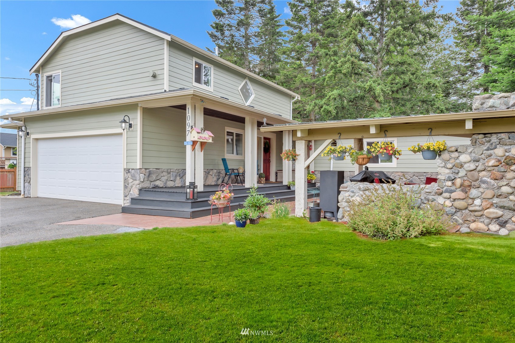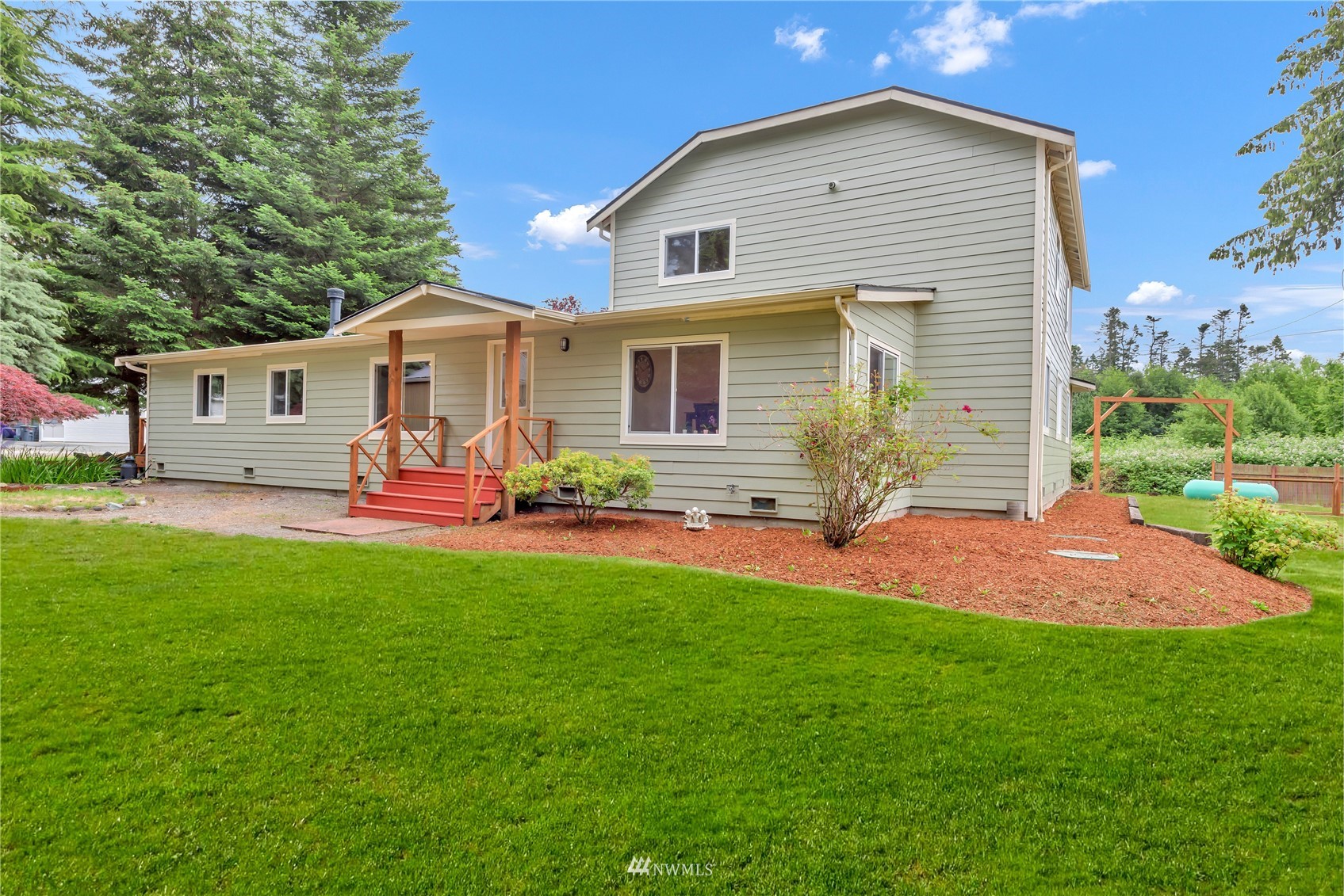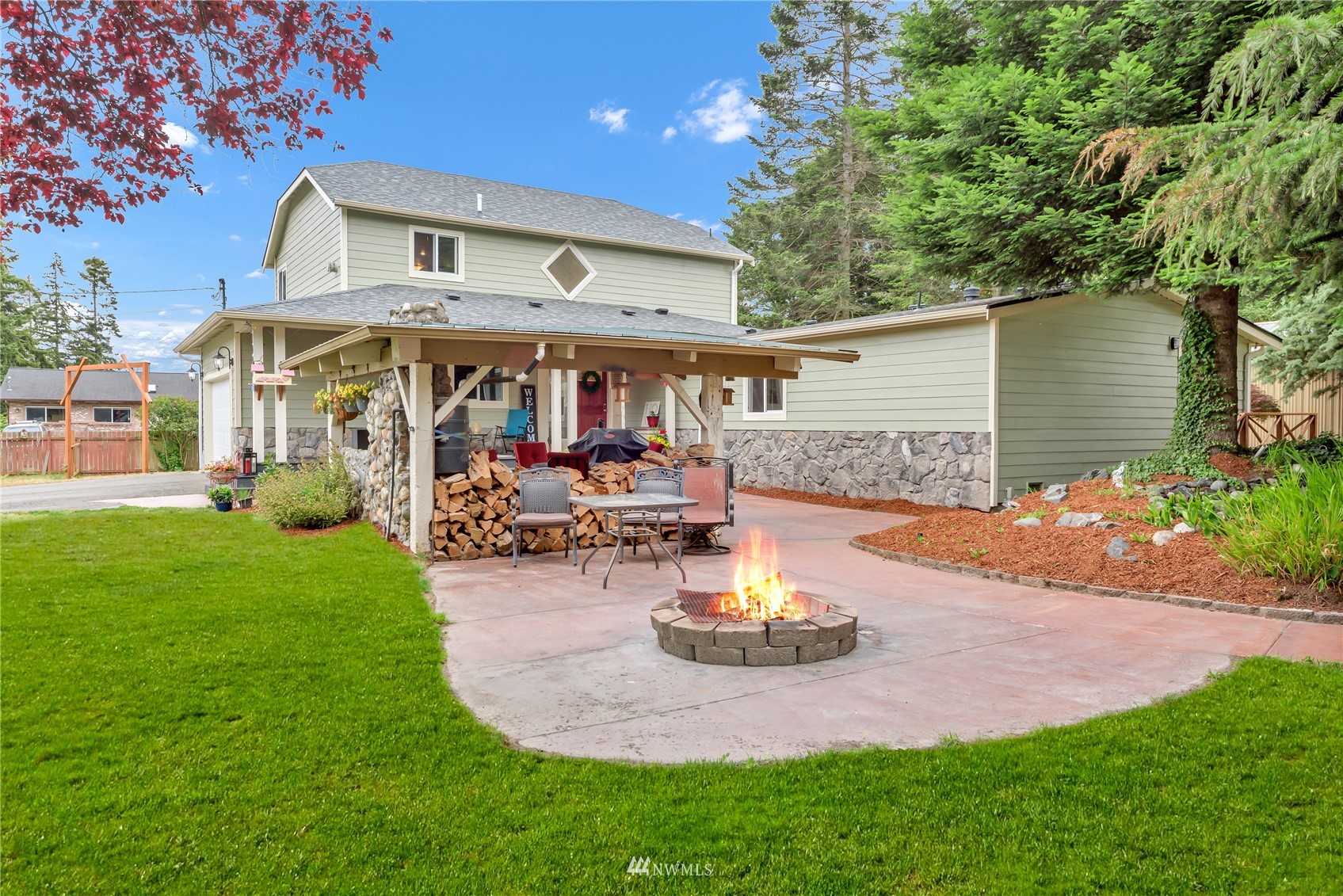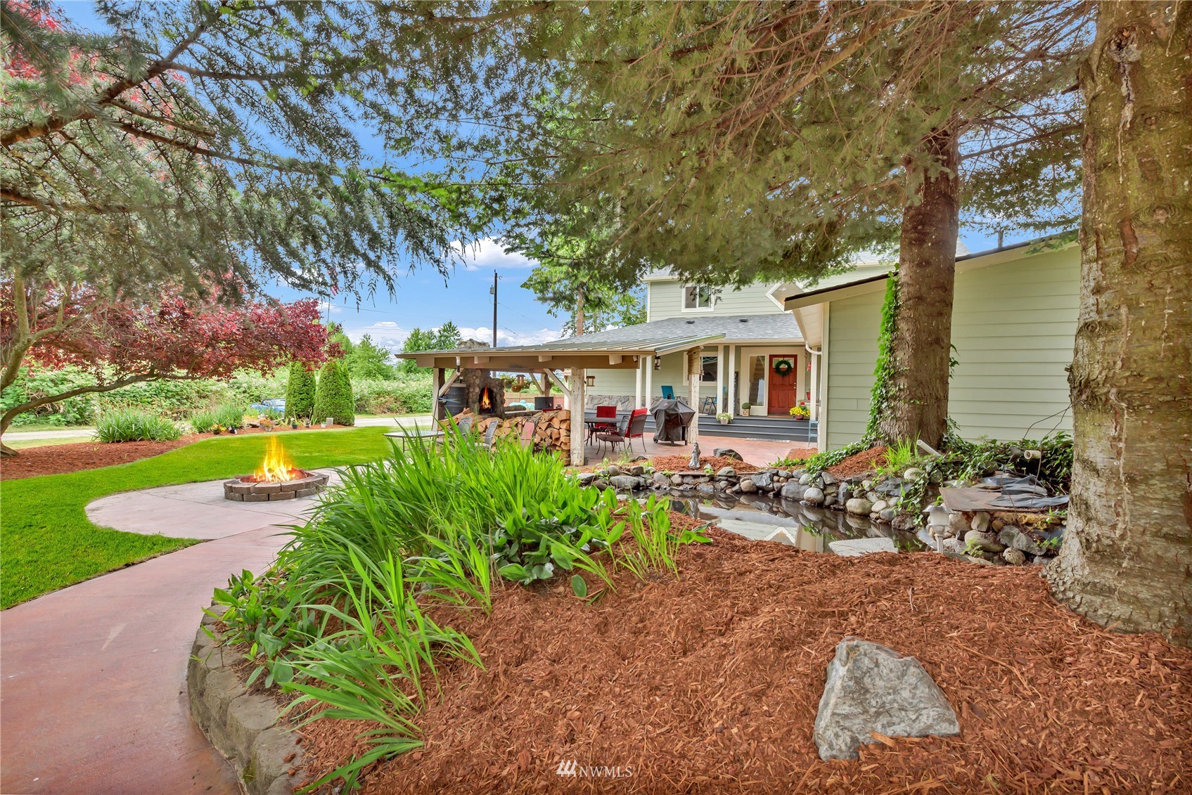 Perfect for multi-generational living! Gorgeous .63 acre lot with sound and mountain views. Partially fenced with a 24'x30' shop, RV parking, and plenty of room for toys. The covered patio has a rock finished fireplace. Enjoy the double pond and waterfall feature. Inside you'll find 2,675sf of spacious living. The kitchen has a breakfast bar and walk-in pantry, and plenty of storage. There's an office, living room, family room, and second primary suite on the main level. The upstairs primary has sound and mountain views & a romantic fireplace. The en suite has a jetted tub and walk-in closet. 50 yr roof is a year old, with a one time transferrable warranty. Minutes to two state parks. Deer and wildlife abound.