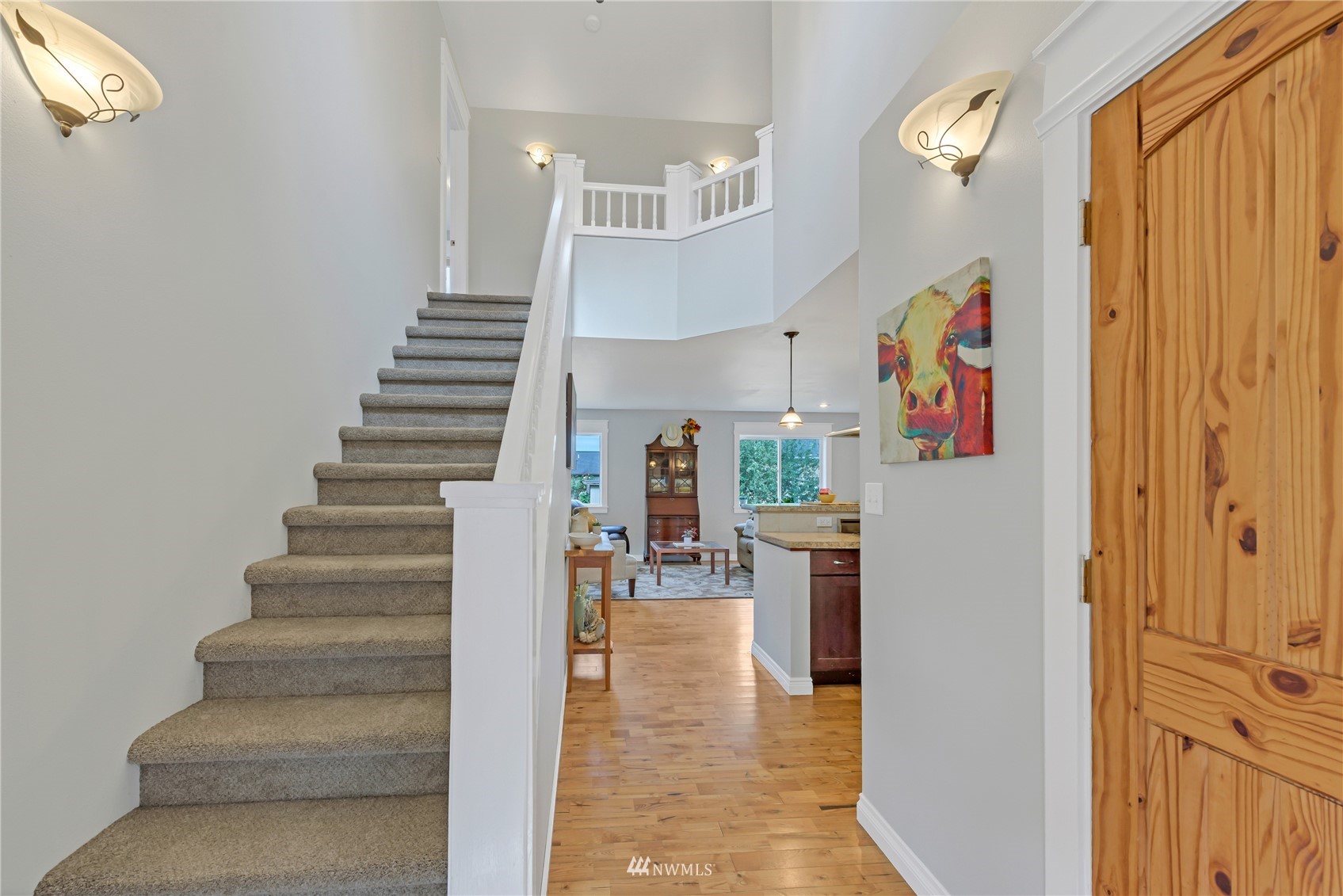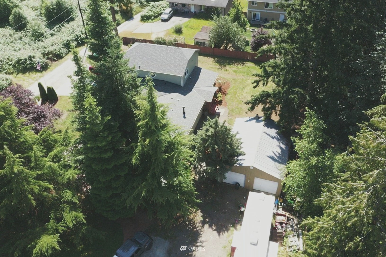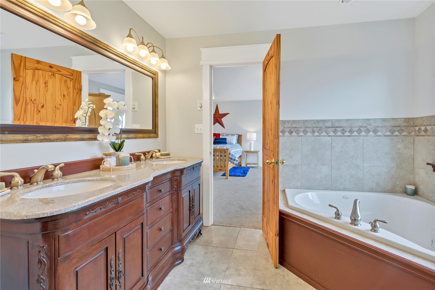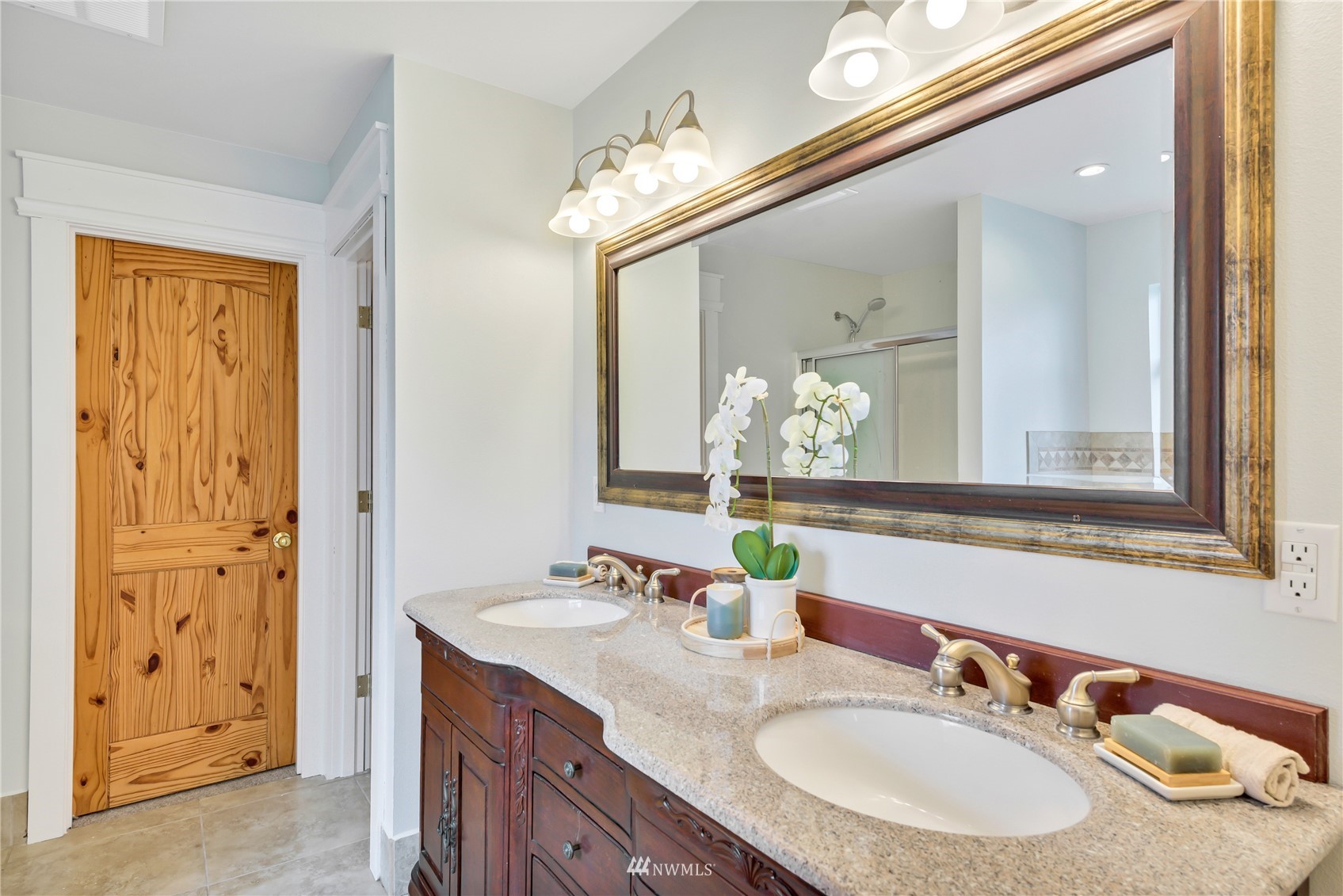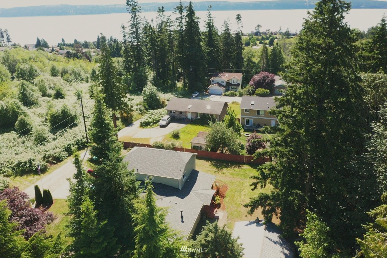 Perfect for multi-generational living! Gorgeous .63 acre lot with sound and mountain views. Partially fenced with a 24'x30' shop, RV parking, and plenty of room for toys. The covered patio has a rock finished fireplace. Enjoy the double pond and waterfall feature. Inside you'll find 2,675sf of spacious living. The kitchen has a breakfast bar and walk-in pantry, and plenty of storage. There's an office, living room, family room, and second primary suite on the main level. The upstairs primary has sound and mountain views & a romantic fireplace. The en suite has a jetted tub and walk-in closet. 50 yr roof is a year old, with a one time transferrable warranty. Minutes to two state parks. Deer and wildlife abound.