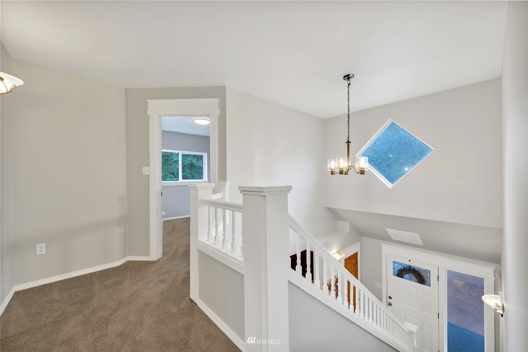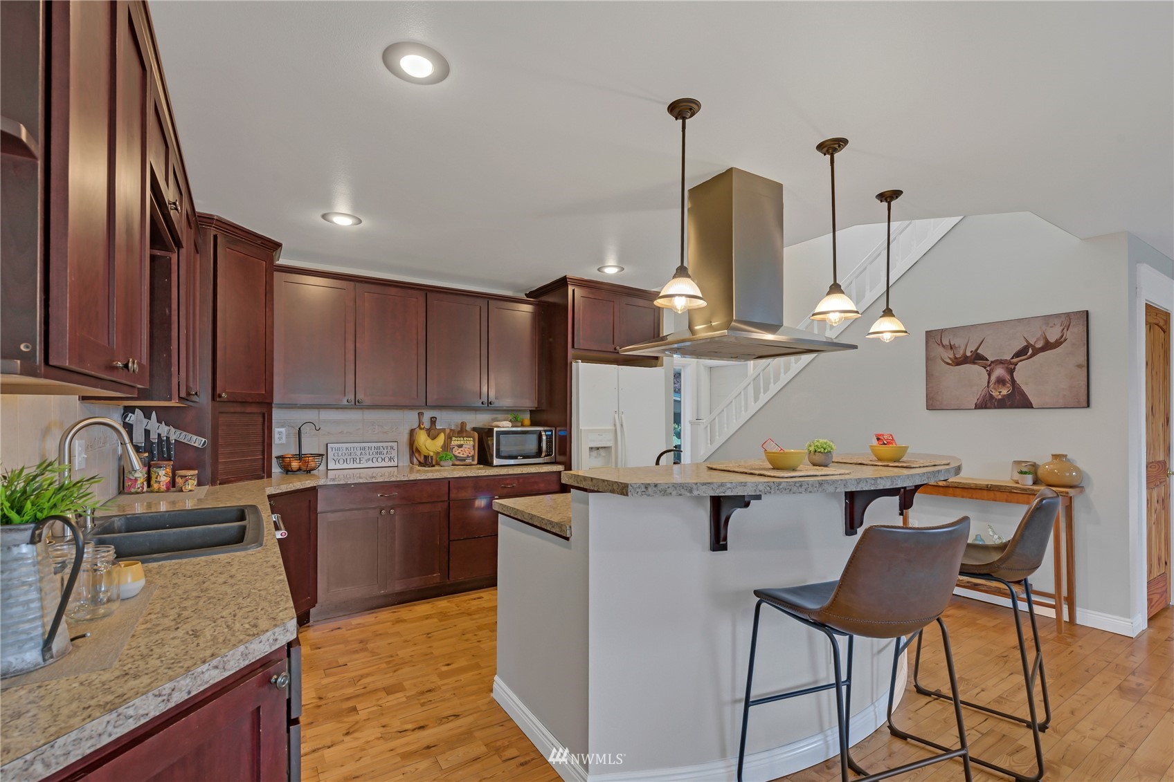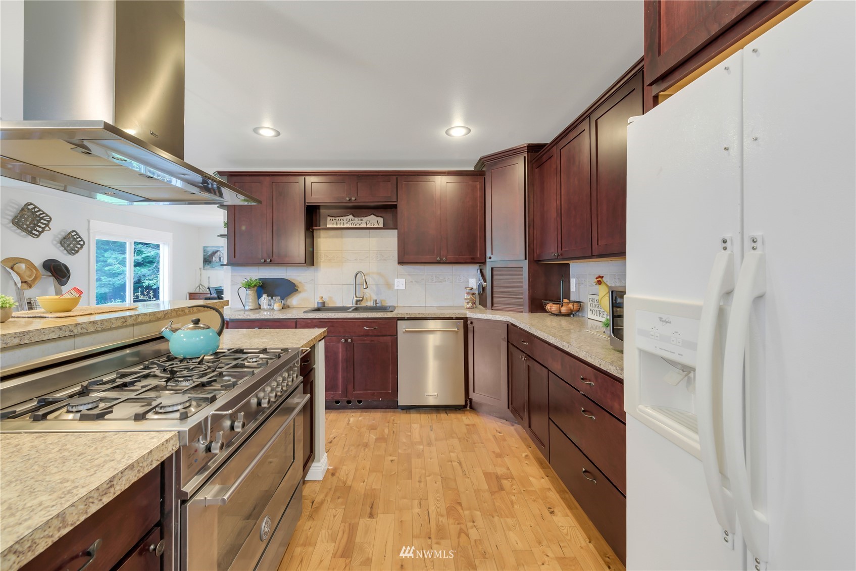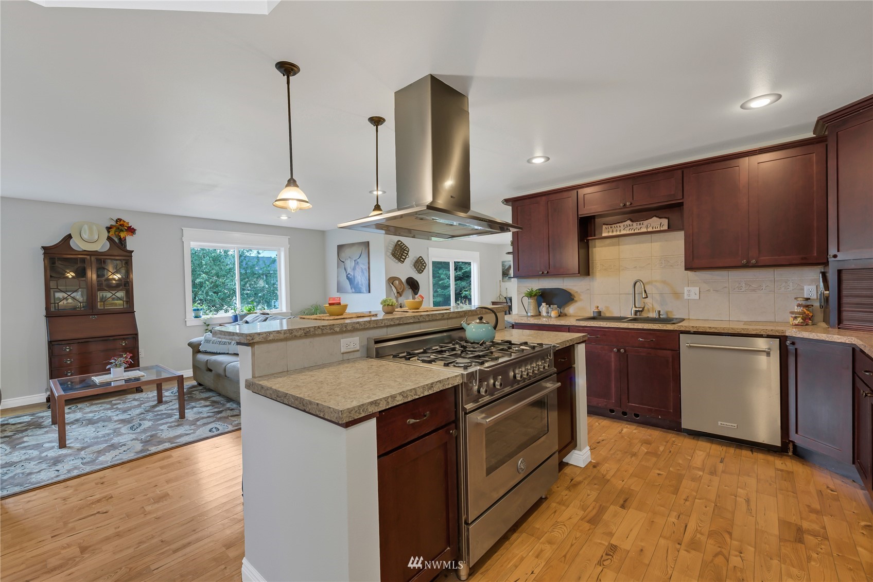 Perfect for multi-generational living! Gorgeous .63 acre lot with sound and mountain views. Partially fenced with a 24'x30' shop, RV parking, and plenty of room for toys. The covered patio has a rock finished fireplace. Enjoy the double pond and waterfall feature. Inside you'll find 2,675sf of spacious living. The kitchen has a breakfast bar and walk-in pantry, and plenty of storage. There's an office, living room, family room, and second primary suite on the main level. The upstairs primary has sound and mountain views & a romantic fireplace. The en suite has a jetted tub and walk-in closet. 50 yr roof is a year old, with a one time transferrable warranty. Minutes to two state parks. Deer and wildlife abound.