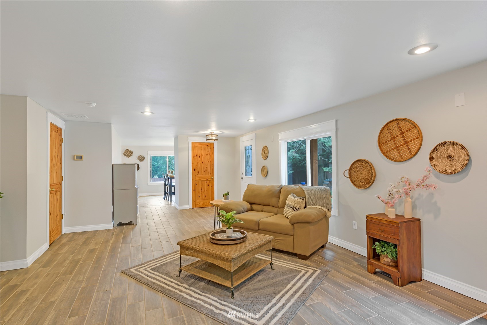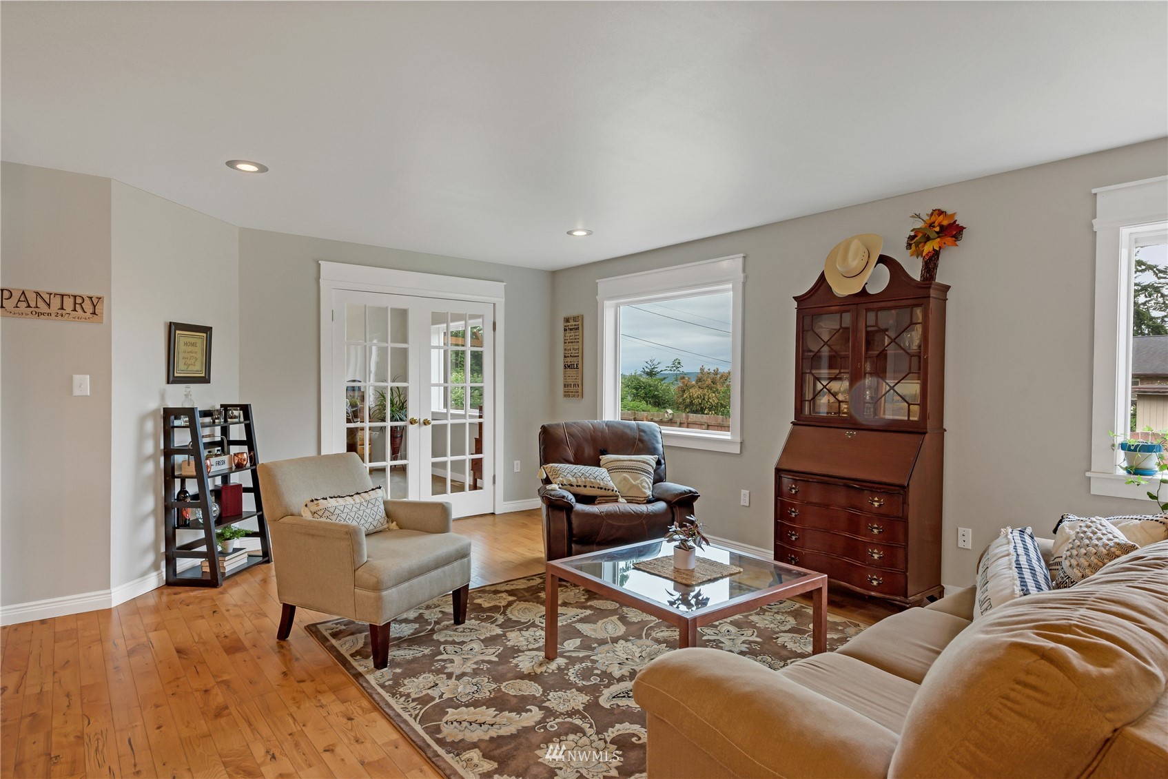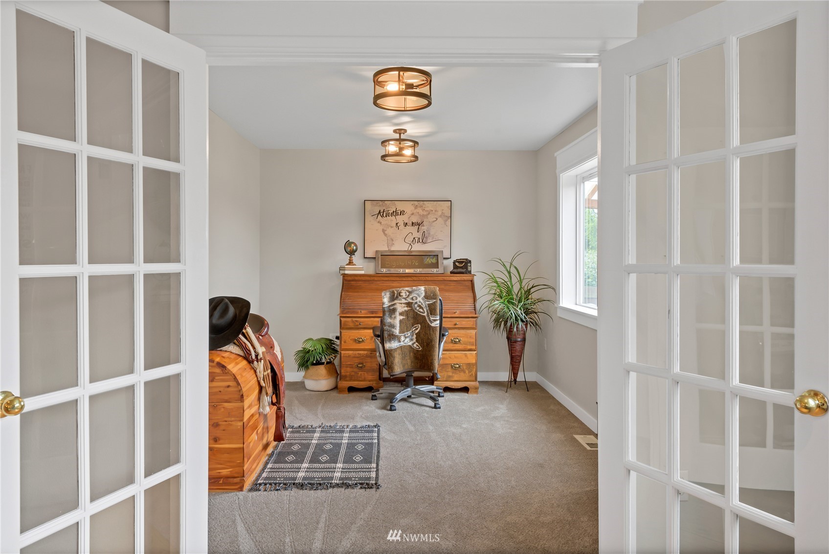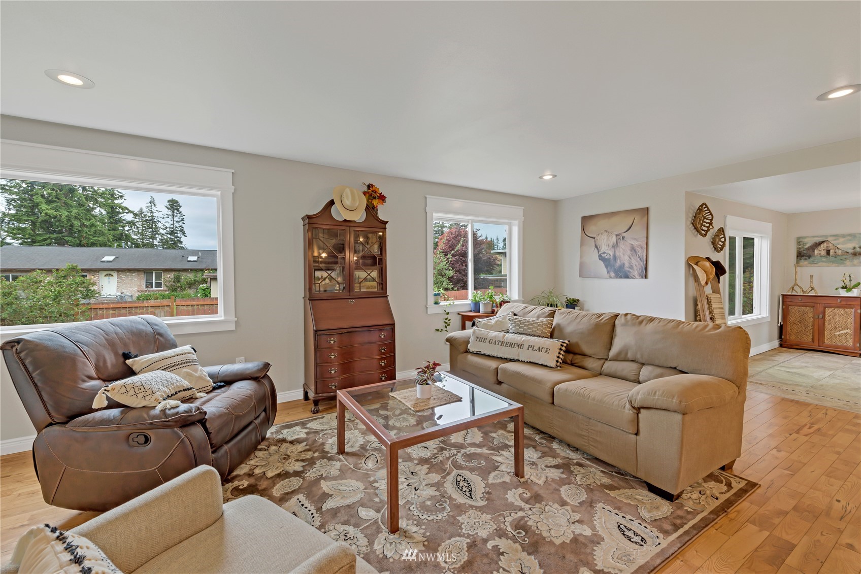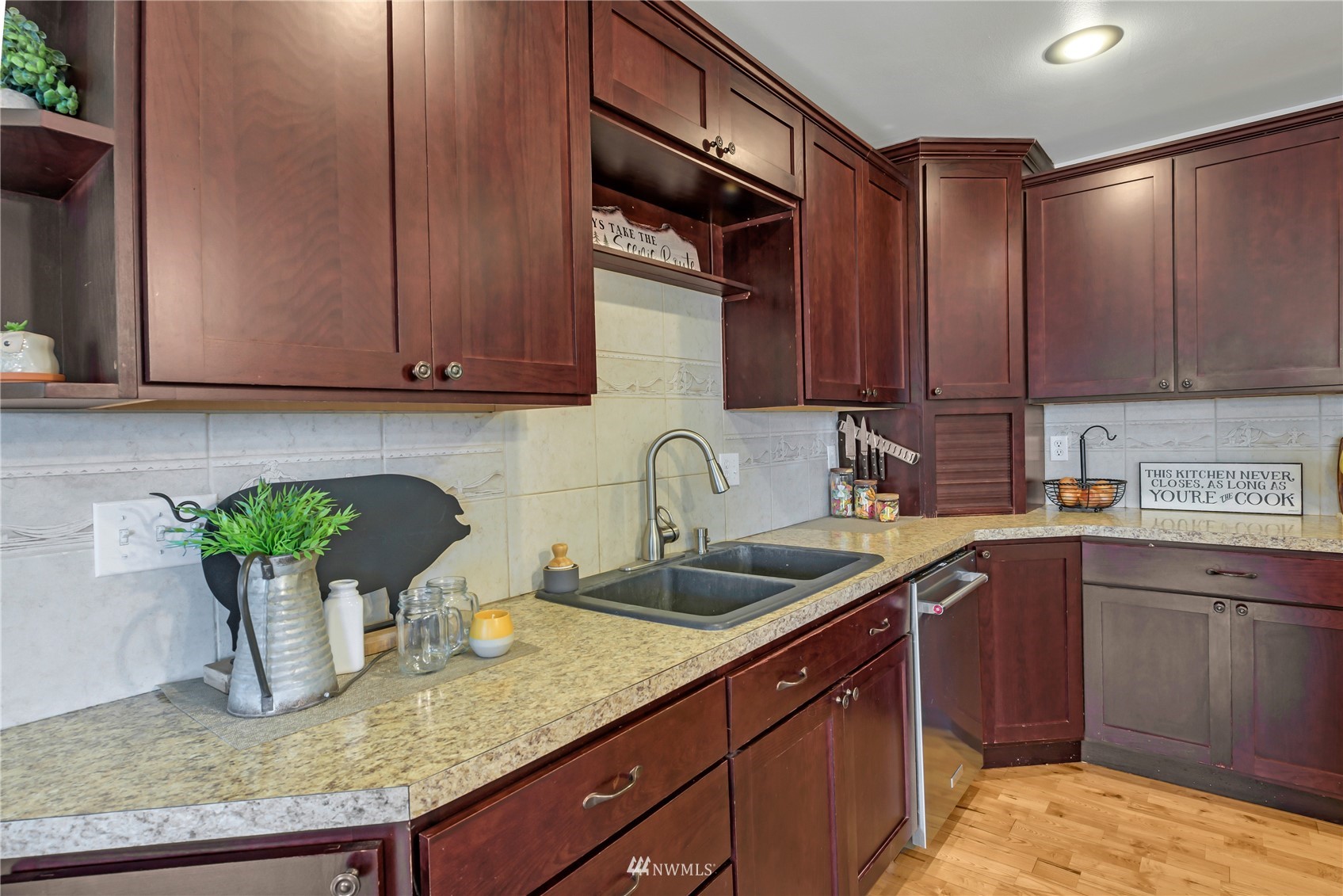 Perfect for multi-generational living! Gorgeous .63 acre lot with sound and mountain views. Partially fenced with a 24'x30' shop, RV parking, and plenty of room for toys. The covered patio has a rock finished fireplace. Enjoy the double pond and waterfall feature. Inside you'll find 2,675sf of spacious living. The kitchen has a breakfast bar and walk-in pantry, and plenty of storage. There's an office, living room, family room, and second primary suite on the main level. The upstairs primary has sound and mountain views & a romantic fireplace. The en suite has a jetted tub and walk-in closet. 50 yr roof is a year old, with a one time transferrable warranty. Minutes to two state parks. Deer and wildlife abound.