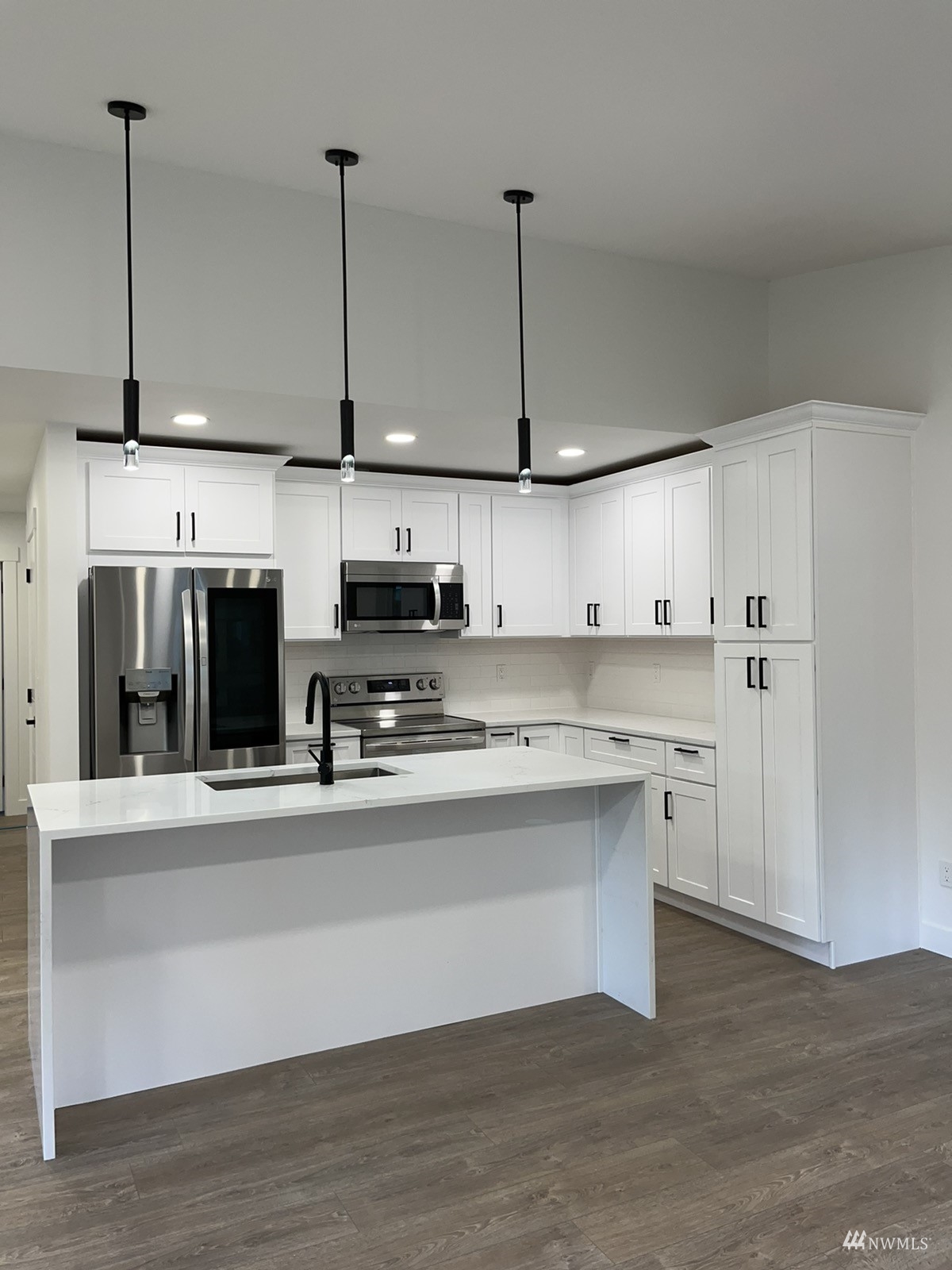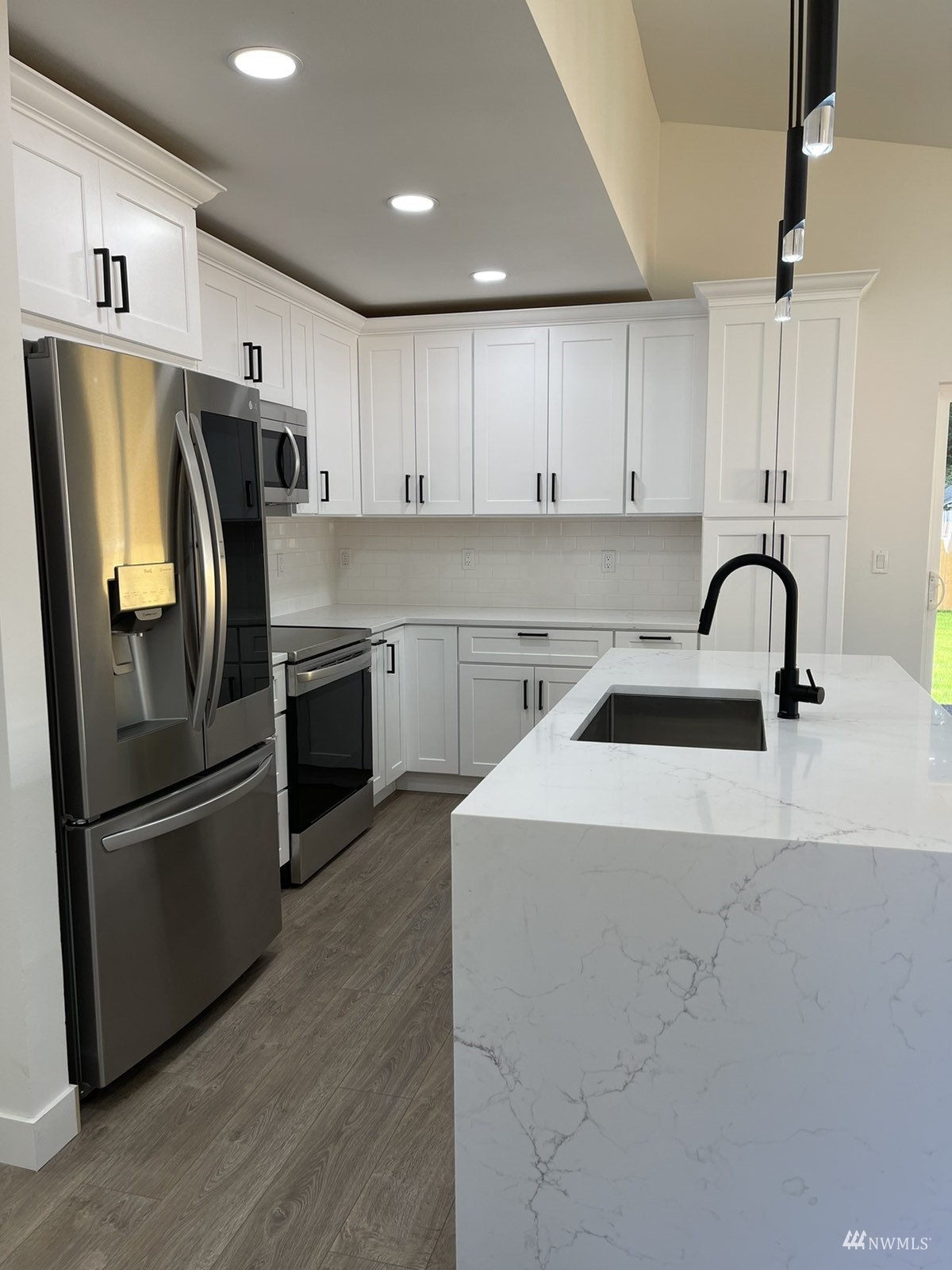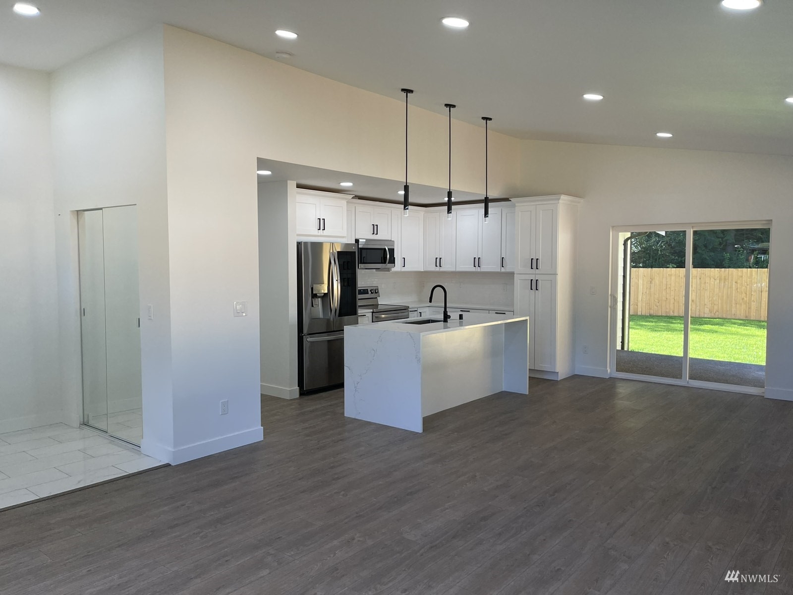Gorgeous, high end, 3 bedroom 2 bathroom home on a level lot. Open floor plan with cathedral ceilings and lots of light in the living room. Large primary bedroom includes a huge walk-in closet, a five piece bathroom with a freestanding tub and separate shower with luxe glass door! Modern finishes include white kitchen cabinets, quartz countertops, tiled bathrooms, and beautiful easy care floors. Covered deck for year round enjoyment! Complete appliance package includes washer and dryer. Paved driveway all the way to the road. Keep those electric bills down with a hybrid electric water heater and an efficient, 4 zone, Daikin heat pump for A/C and heat. Lot is fully fenced! Hard to find a place with such a high quality finish.