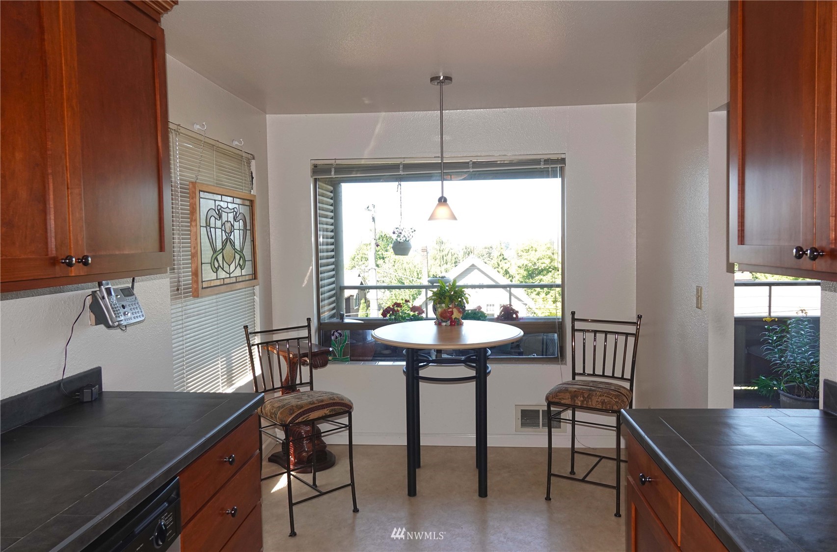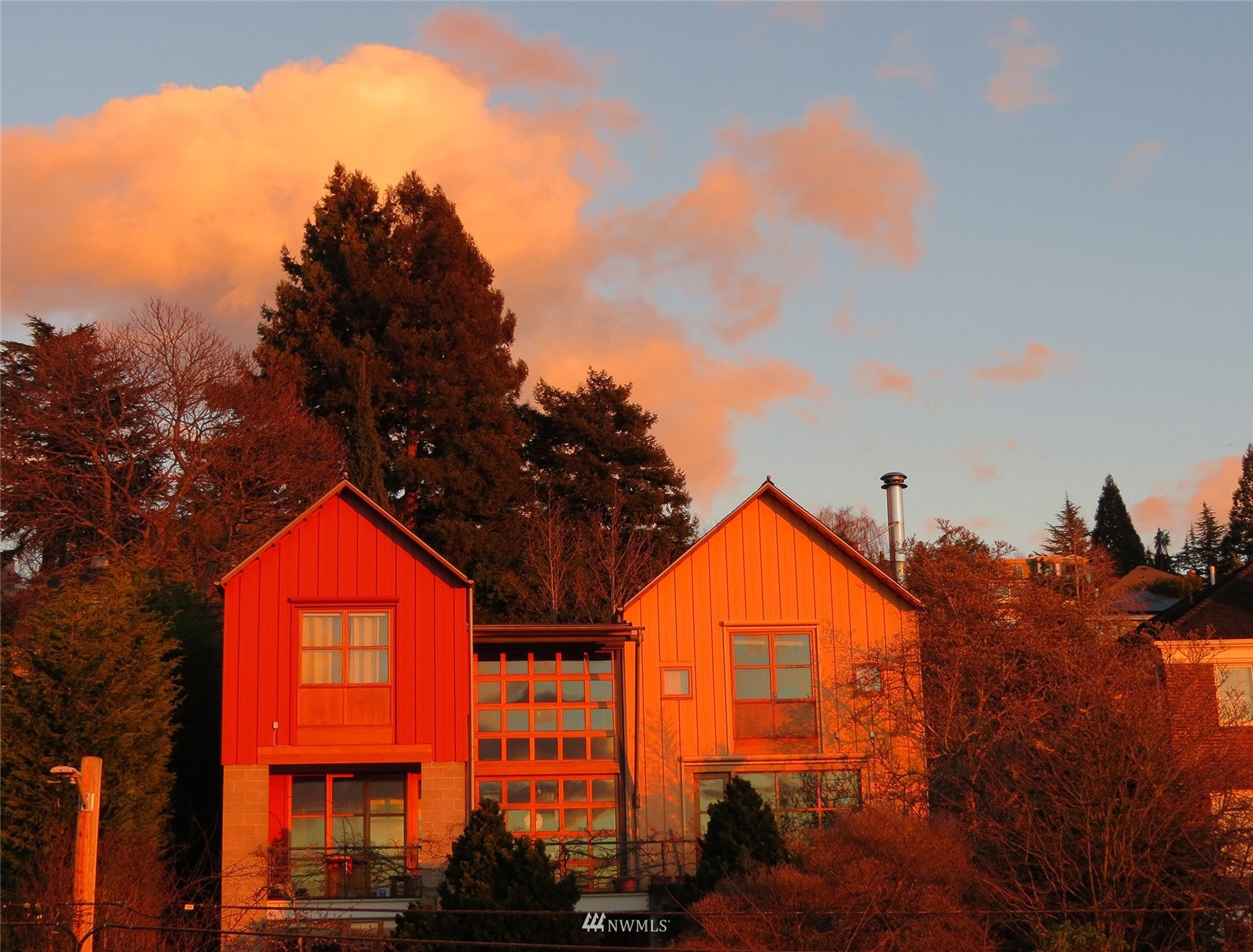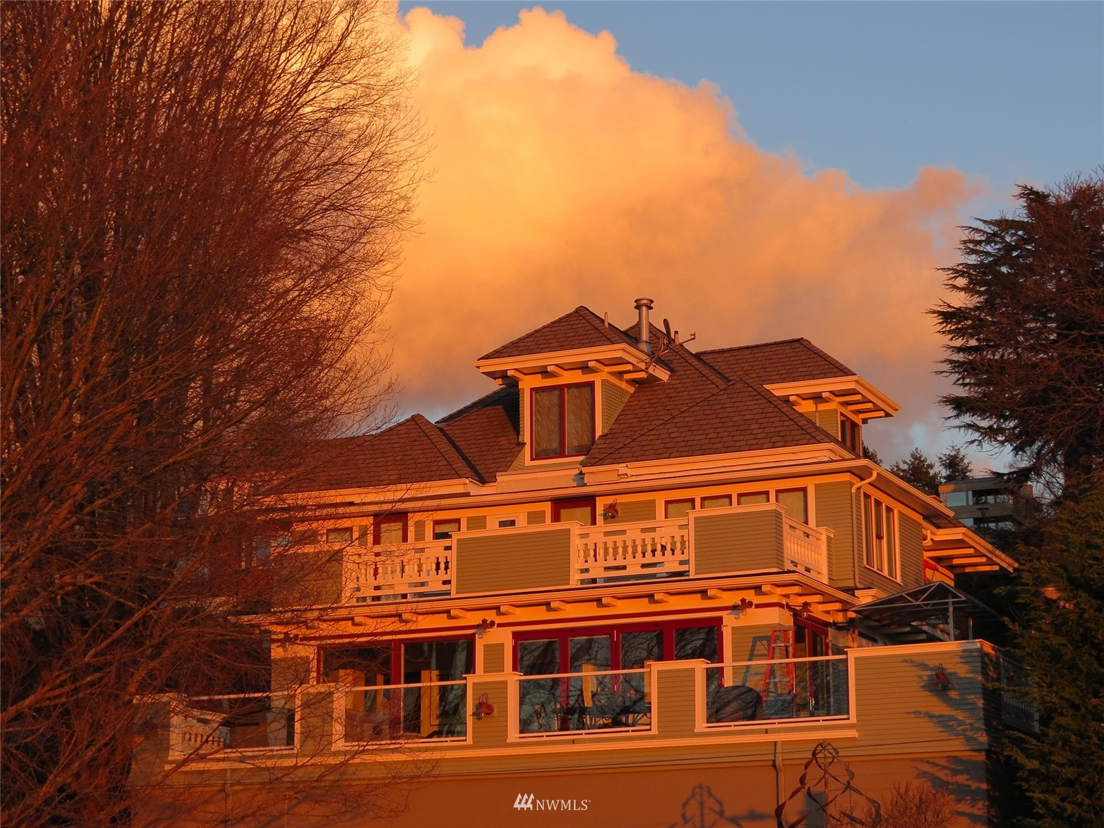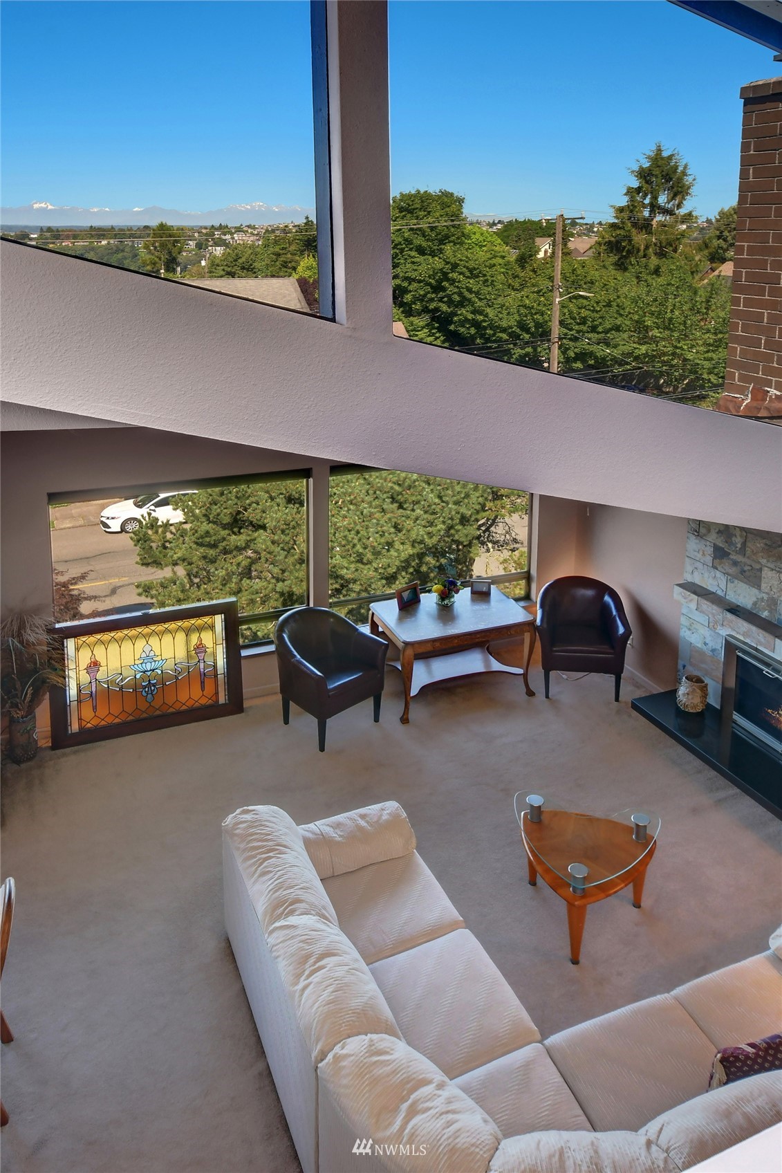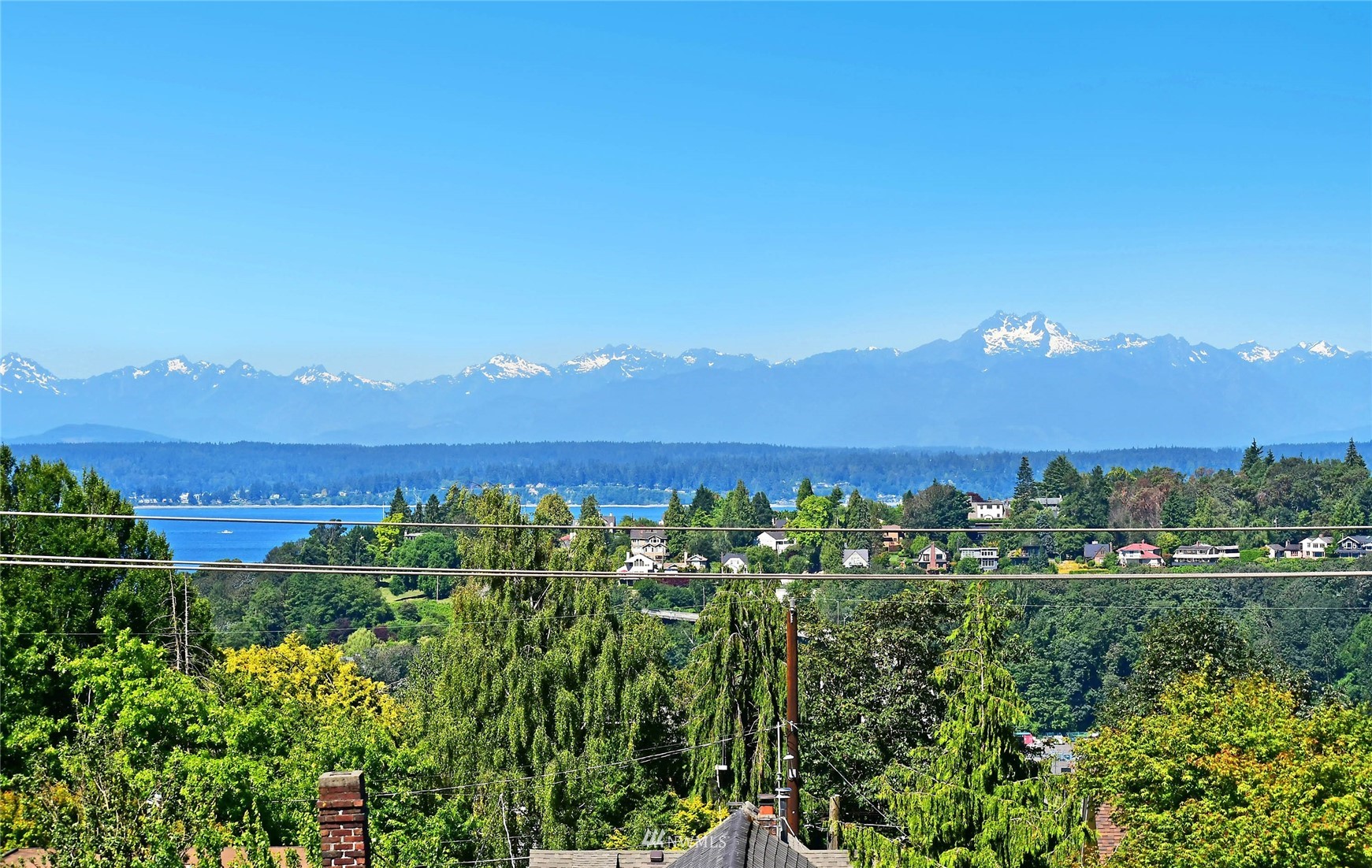 Million dollar view, spacious home included. Glorious sound & mtn views from Lvngrm, dngrm, brkfst area, loft and 2 decks. Soaring ceiling in spacious day rooms with bright, open spaces. Top floor plus loft in a 2 unit bldg lives like a house. Lush yard. Deck off dngrm is covered, great for BBQ and almost nice days. Loft deck is on top of the world with views from Alki, Vashon and Blake to Bainbridge and the Olympics. Watch ferries, freighters, sailboats, eagles and osprey. Year 'round sunset view. Generous primary suite with large walk in closet. Beautiful frplc with slate and granite. One covered parking stall plus tandem spot plus guest parking. Close to Seattle Center. Well funded HOA awaits your input on exterior paint colors.