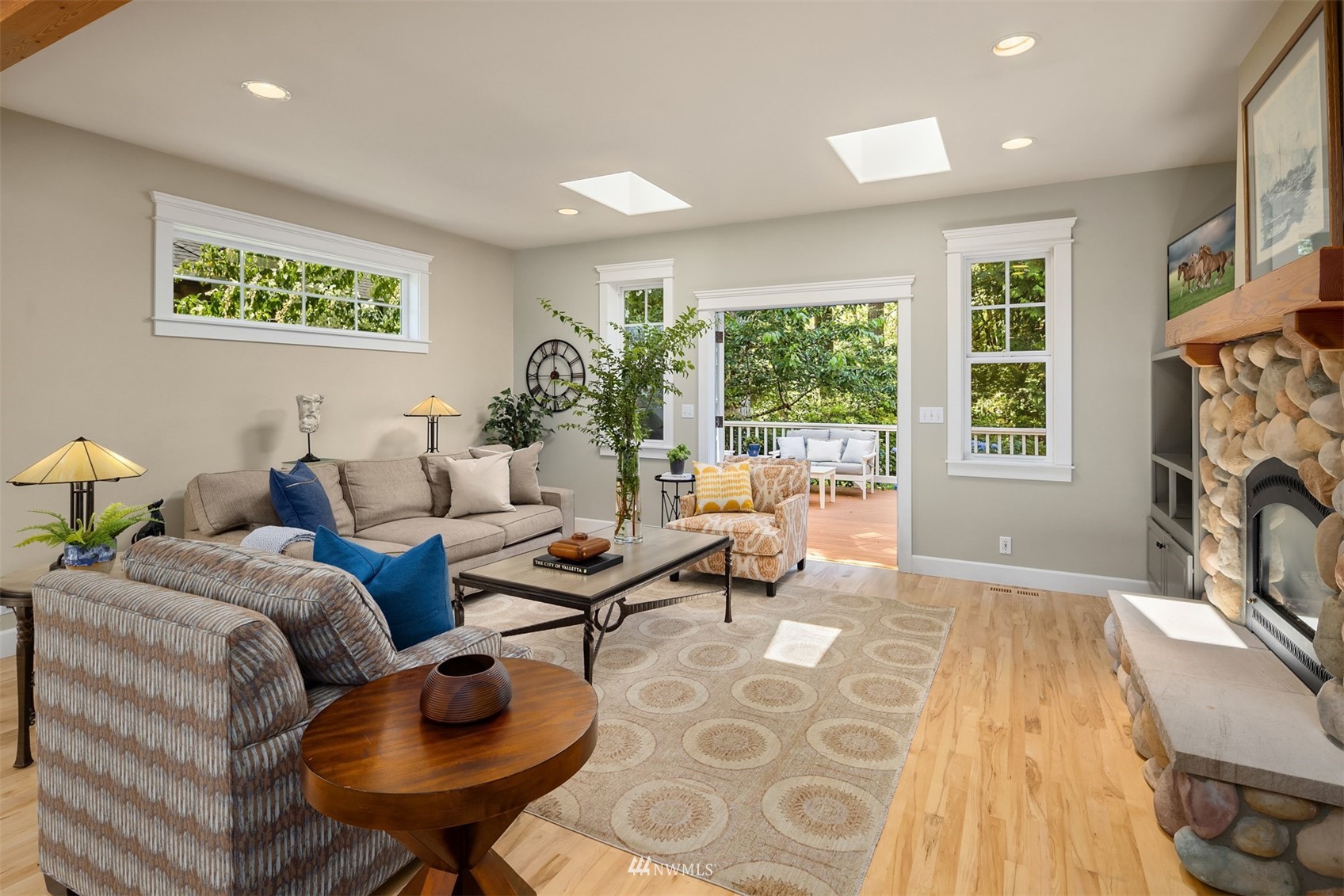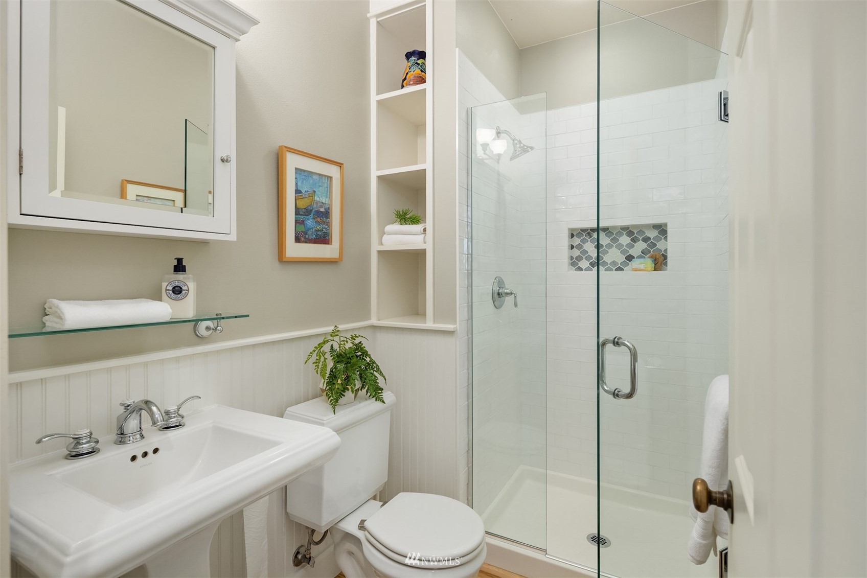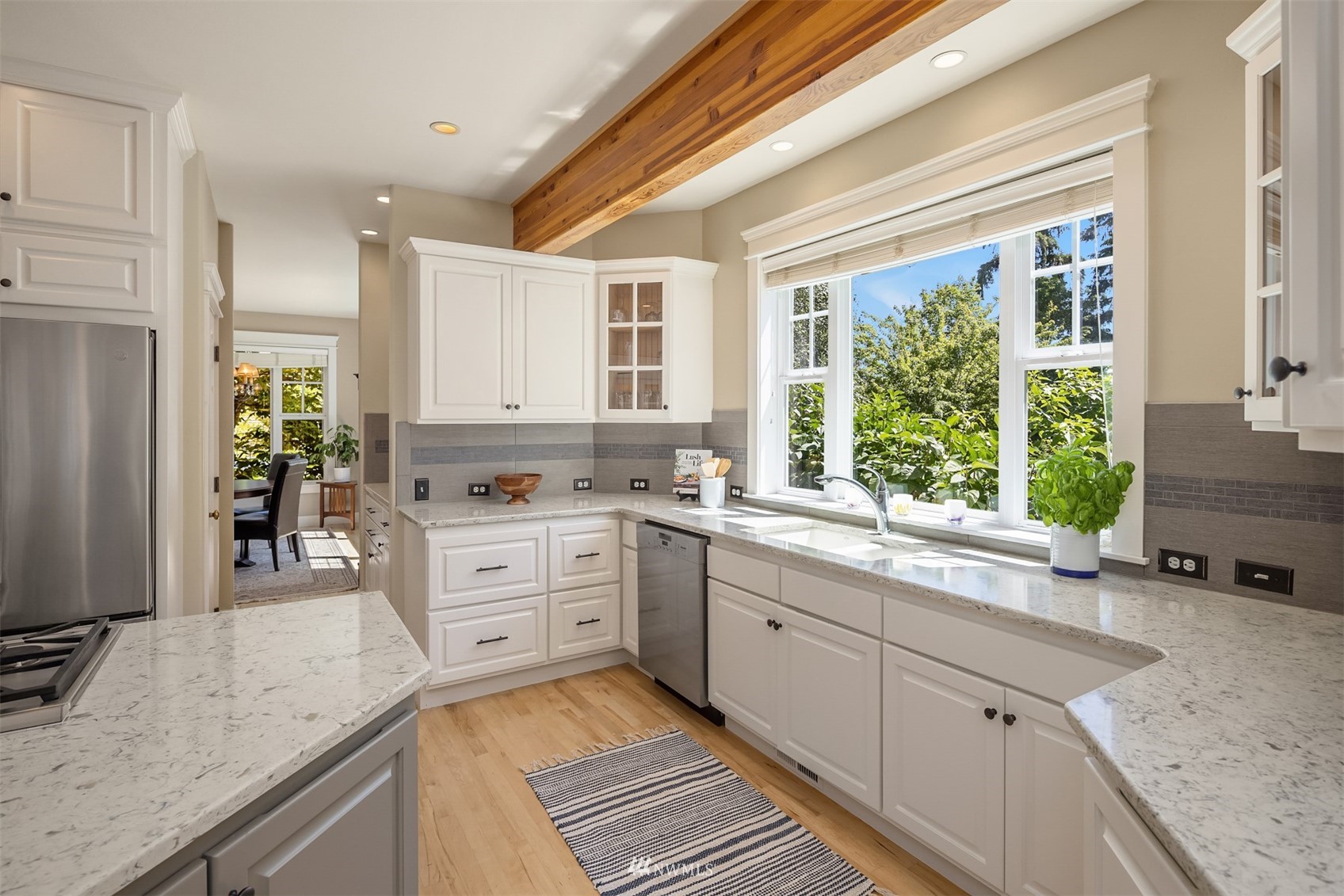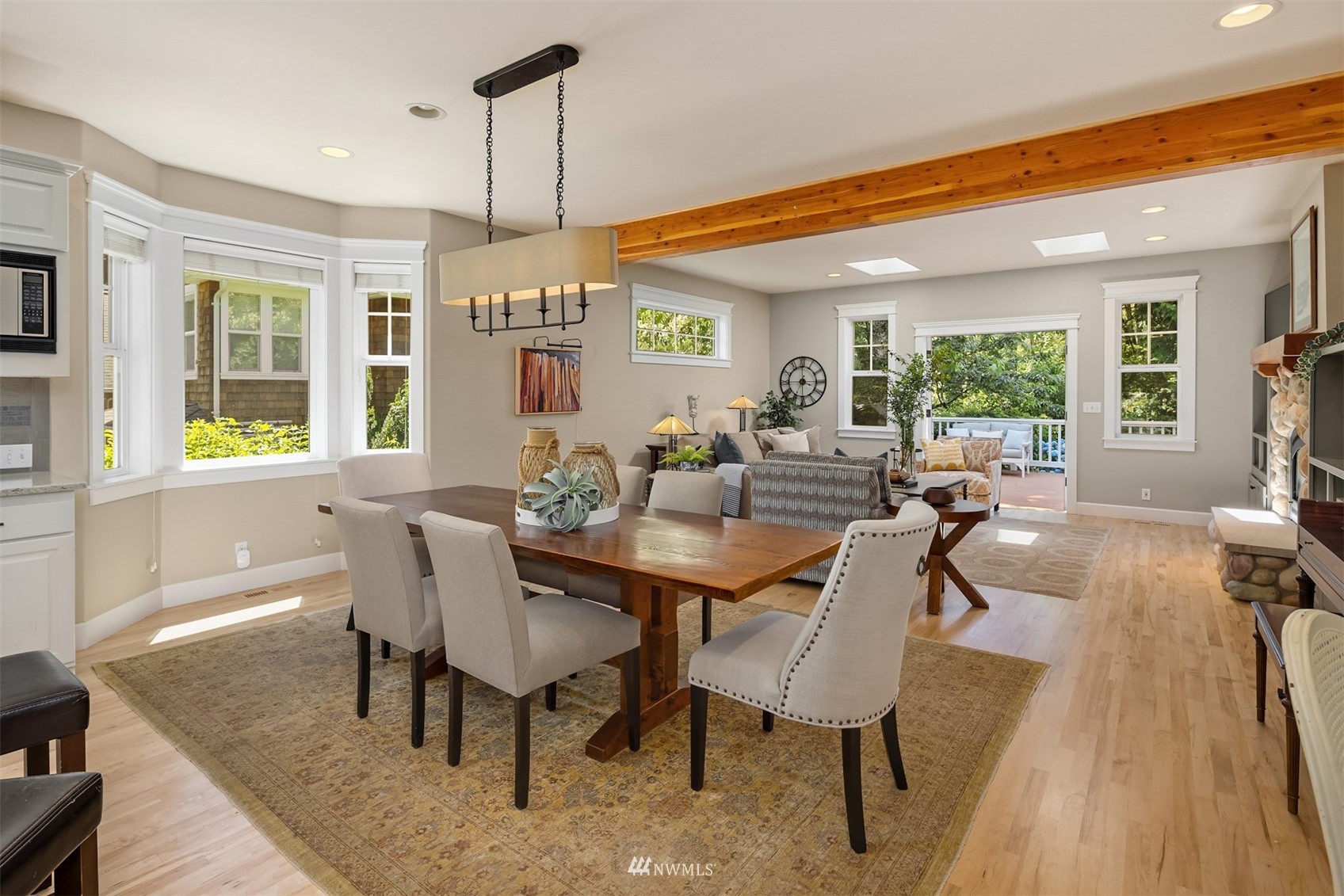 Classic, coastal elegance in town on Bainbridge Island. Gracious, beautifully maintained home on coveted Eakin Dr offers chic, comfortable, light filled spaces, a mile from town amenities and ferry. Thoughtfully designed for easy living- open concept public spaces, 4th BR/office on main with 3/4 bath, huge bonus room w vaulted ceilings and attached full bath. 2022 kitchen/bath reno with beautiful high end finishes- quartz counters, painted cabinets, new tile. Stunning primary suite offers bath w in floor heat, double walk in closets. Deck and stone patio expand living space into garden, w mature plantings, blueberries and kitchen garden. Includes access to 1 acre community waterfront park; you'll love storing your kayak/SUP at water's edge!