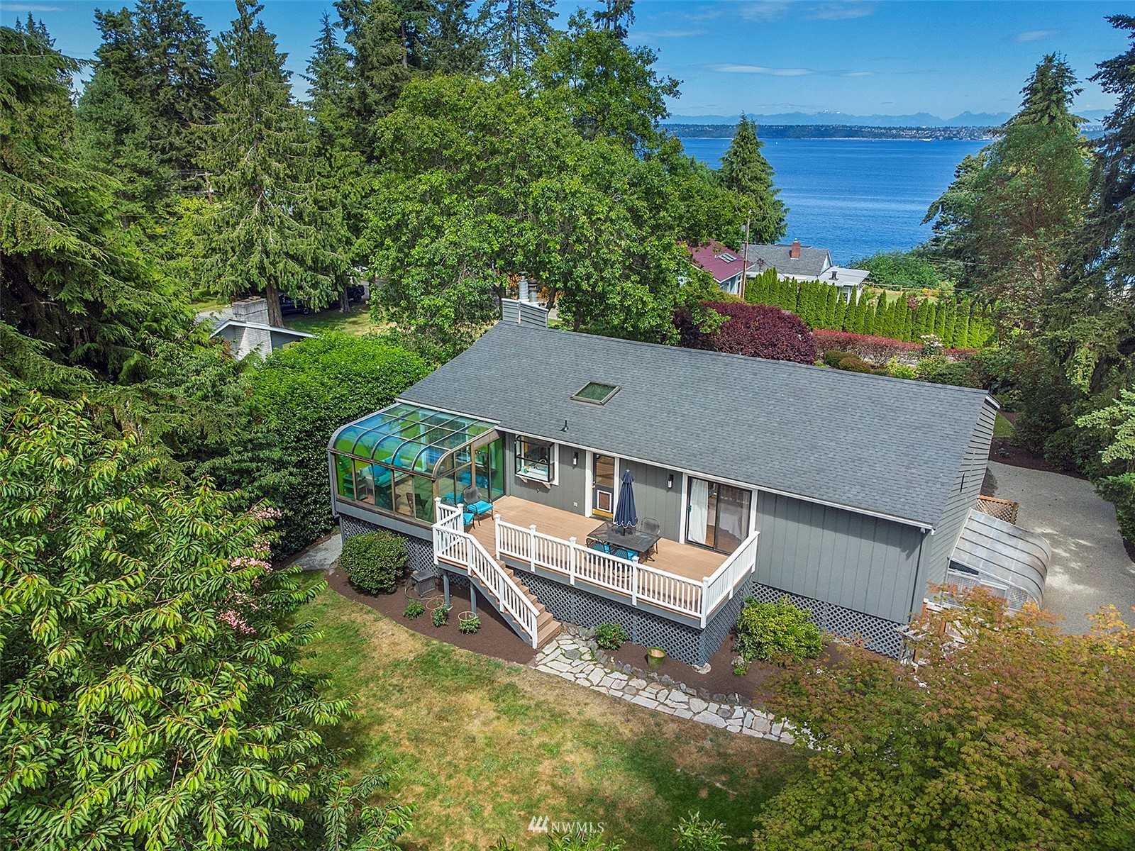 Artistic mid-century vibes await you w/ views of the Seattle skyline, Cascades, & shipping lanes. This light-filled home features an open concept kitchen, dining & living room, allowing for ample entertaining spaces. Enjoy the morning sun on the front deck while taking in the views of the Sound. A large private back deck & solarium overlooks the lush cottage gardens. Large flex space downstairs, the perfect artist studio or family room! Primary bdrm w/ ensuite, private deck, & walk-in closet. Beautiful oak hardwoods upstairs & engineered hardwood down. Brand new roof and exterior paint. 10 min walk to Ted Olson Nature Preserve & 15 min walk to Rolling Bay. Close to Winslow, parks, & schools. The very best Bainbridge has to offer!