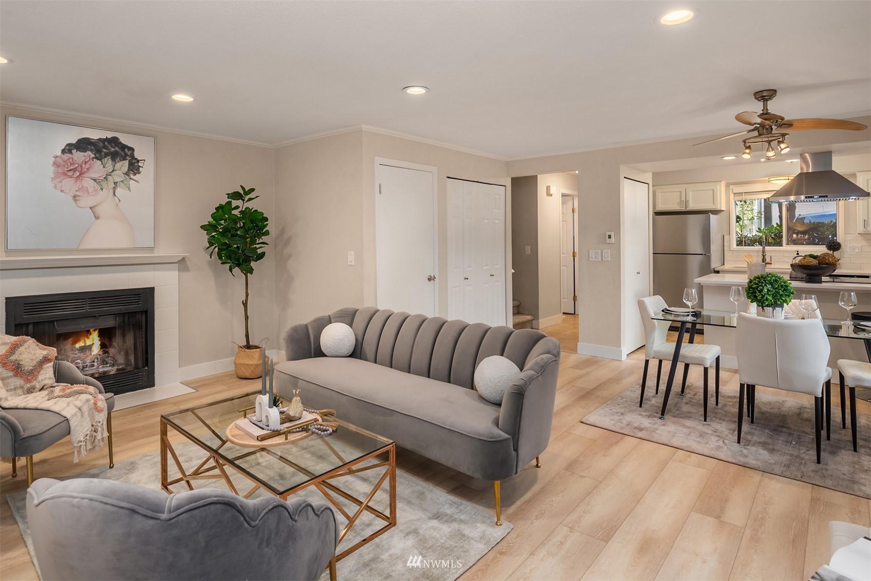Beautifully updated and private end unit townhome in the heart of Bothell! Light and bright open floor plan with updated kitchen, bathrooms, and designer finishes throughout. Updates include new range hood, kitchen quartz counters, stainless steel appliances, marble bathroom vanities, fresh carpet, LVP flooring, new baseboard trim and recessed lighting. Large living room opens to private patio with additional storage space and small backyard. Quiet complex with covered parking and access to playground, sports court and clubhouse. Great commuter location with easy access to 405 and I-5. Minutes to Mill Creek Town Center.