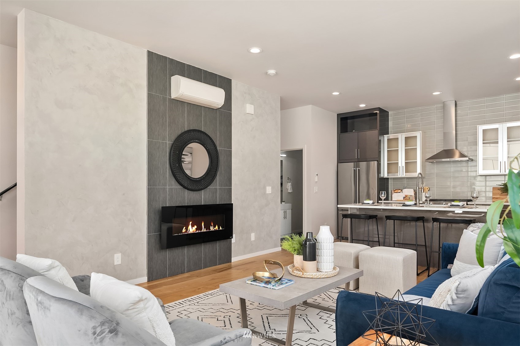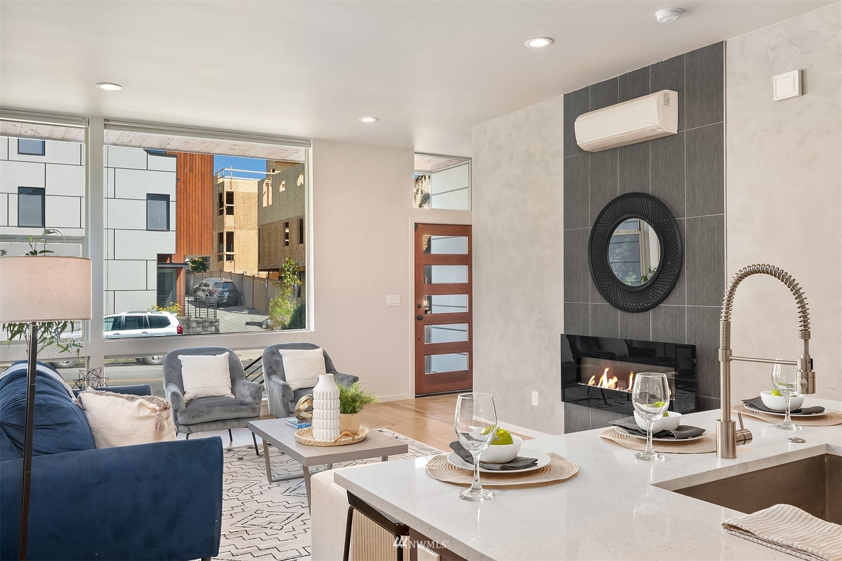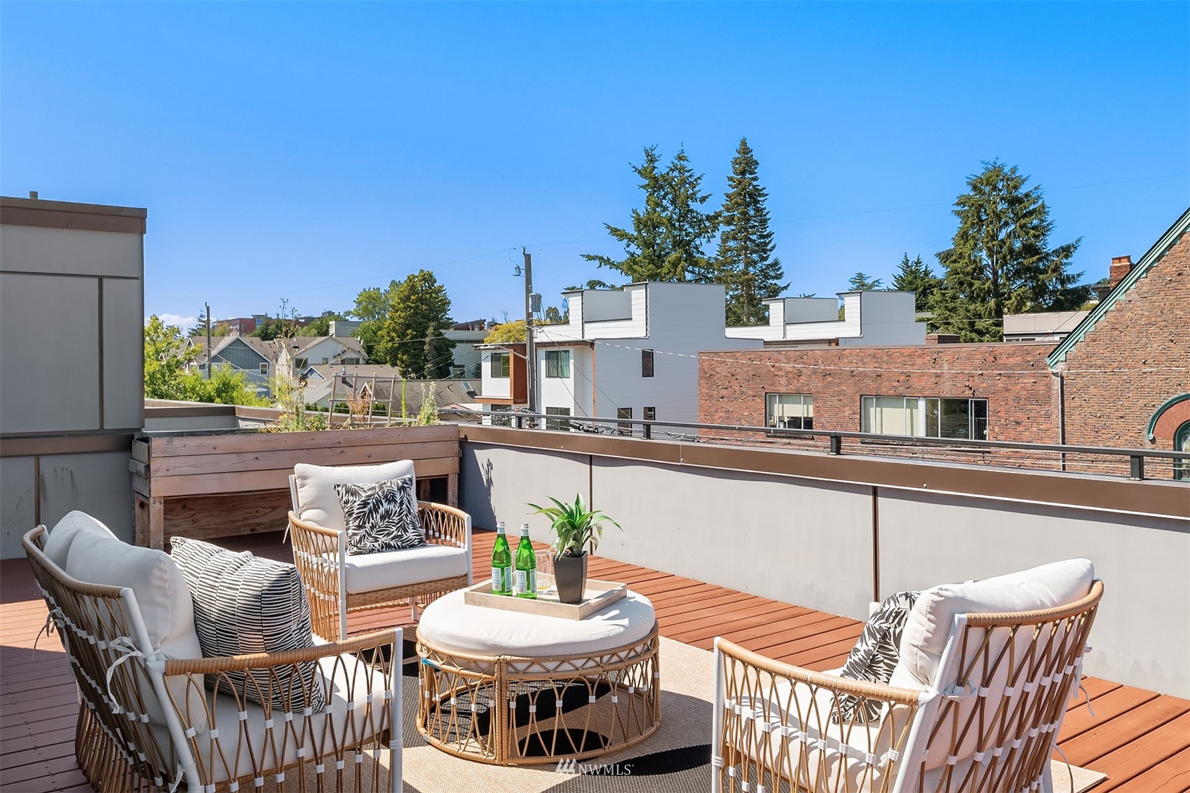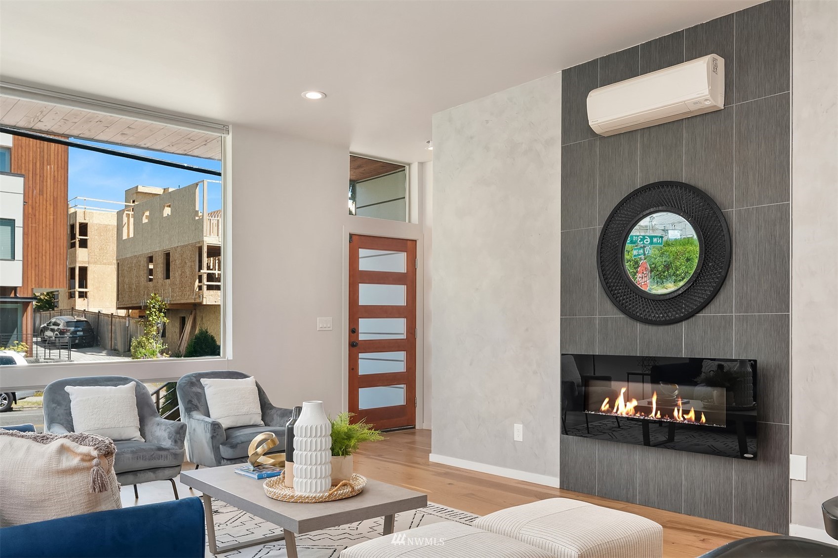 Stylish Row-House in Ballard with a distinctively wide-floorplan ideal for open-concept entertaining. Flooded with natural light, this exceptional corner unit features walls of windows on two-sides. Impeccable hand-selected designer finishes including quartz counters, custom cabinets, gas fireplace, A/C, venetian plaster accent wall. The master suite has spa-like features and walk-in closet. Lower level is complete MIL/ADU with kitchenette, full bath, laundry, & separate entry that can be used as an Airbnb, long term rental or home office. Private rooftop view deck with BBQ hookup and room for garden. Rare 2 designated off-street parking spots included! Only a few blocks to Market Street, restaurants and a Walkscore of 91.