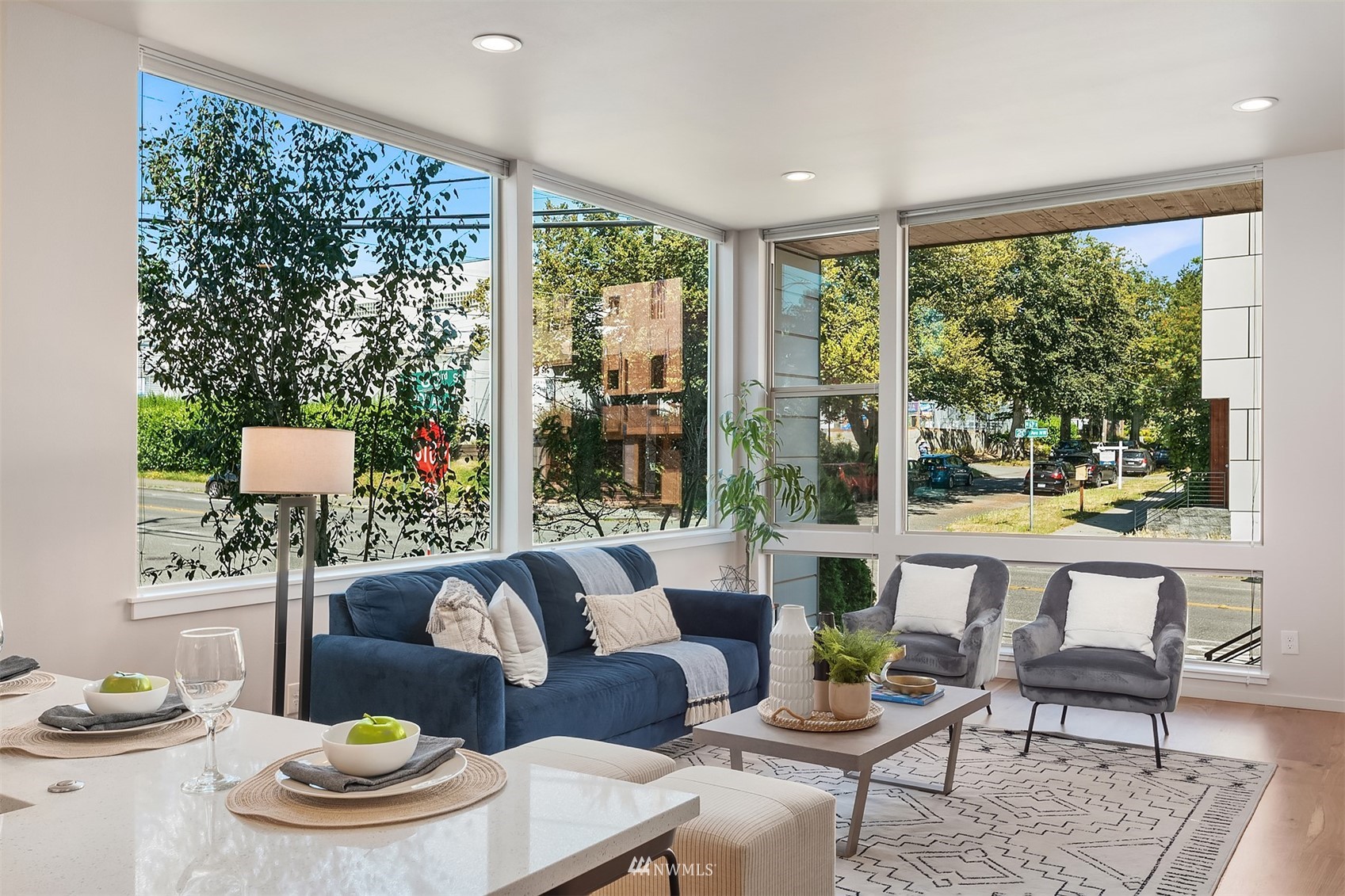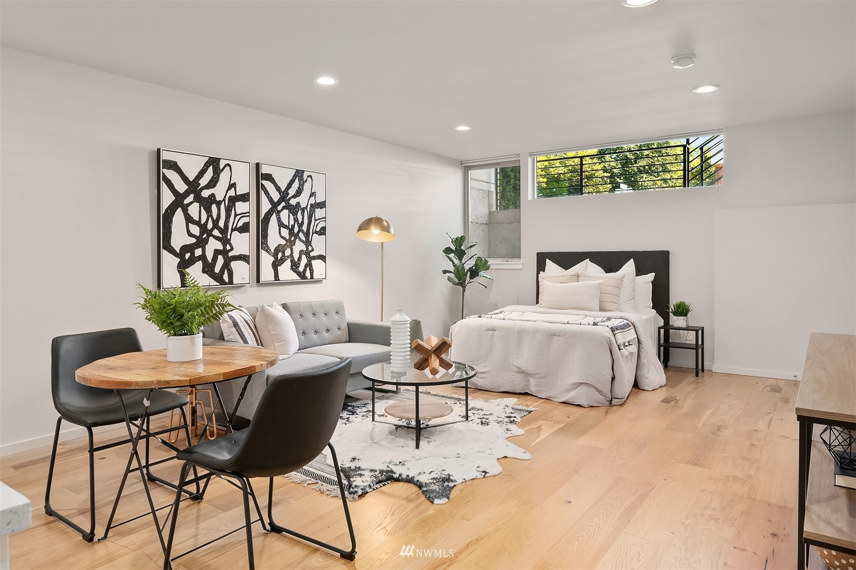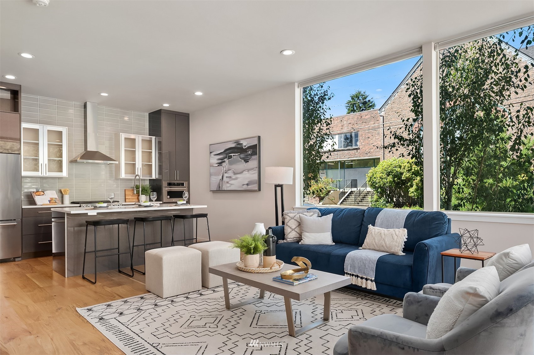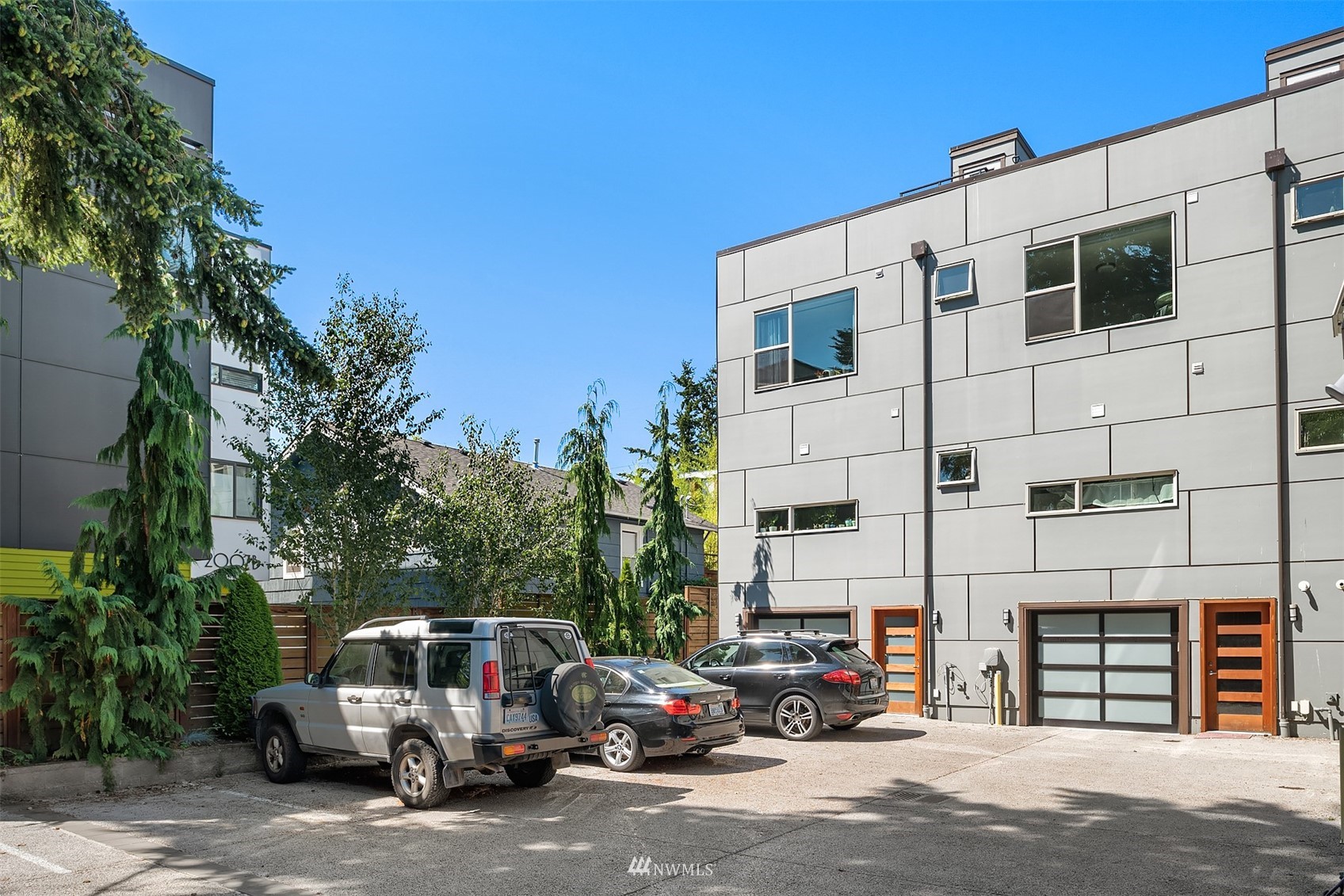 Stylish Row-House in Ballard with a distinctively wide-floorplan ideal for open-concept entertaining. Flooded with natural light, this exceptional corner unit features walls of windows on two-sides. Impeccable hand-selected designer finishes including quartz counters, custom cabinets, gas fireplace, A/C, venetian plaster accent wall. The master suite has spa-like features and walk-in closet. Lower level is complete MIL/ADU with kitchenette, full bath, laundry, & separate entry that can be used as an Airbnb, long term rental or home office. Private rooftop view deck with BBQ hookup and room for garden. Rare 2 designated off-street parking spots included! Only a few blocks to Market Street, restaurants and a Walkscore of 91.