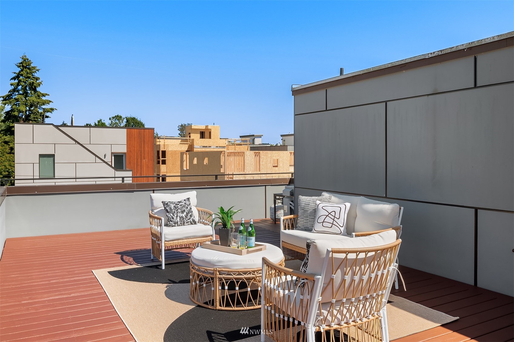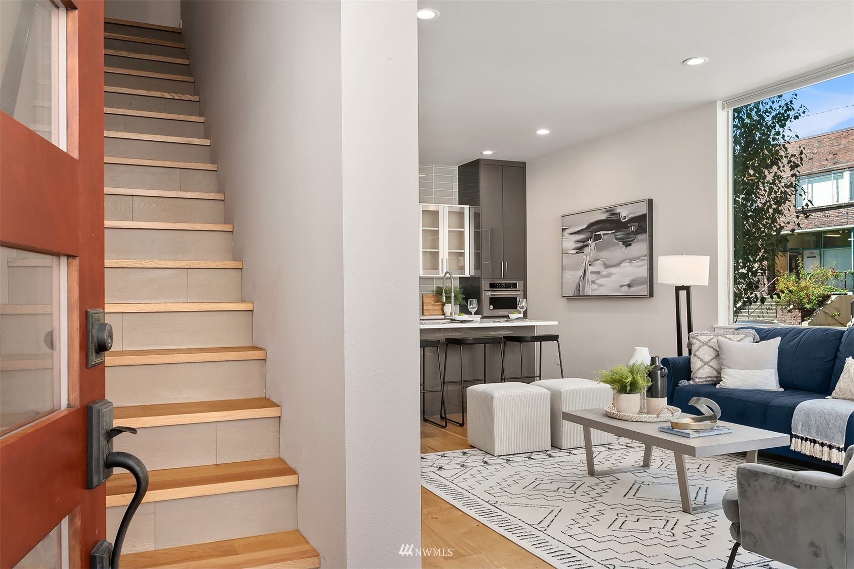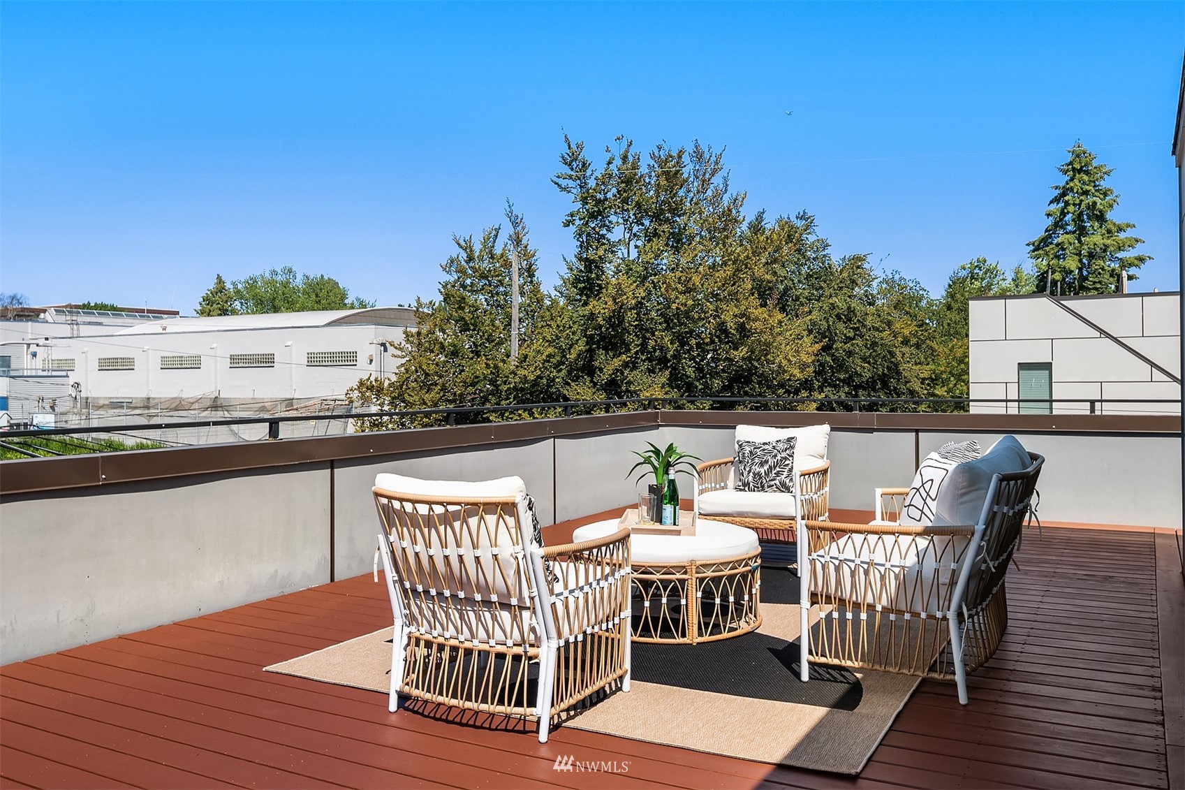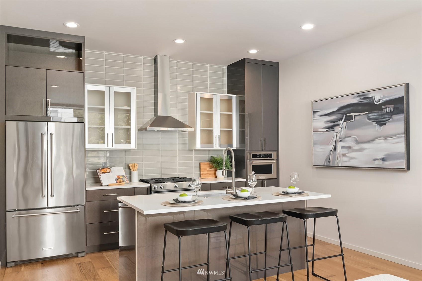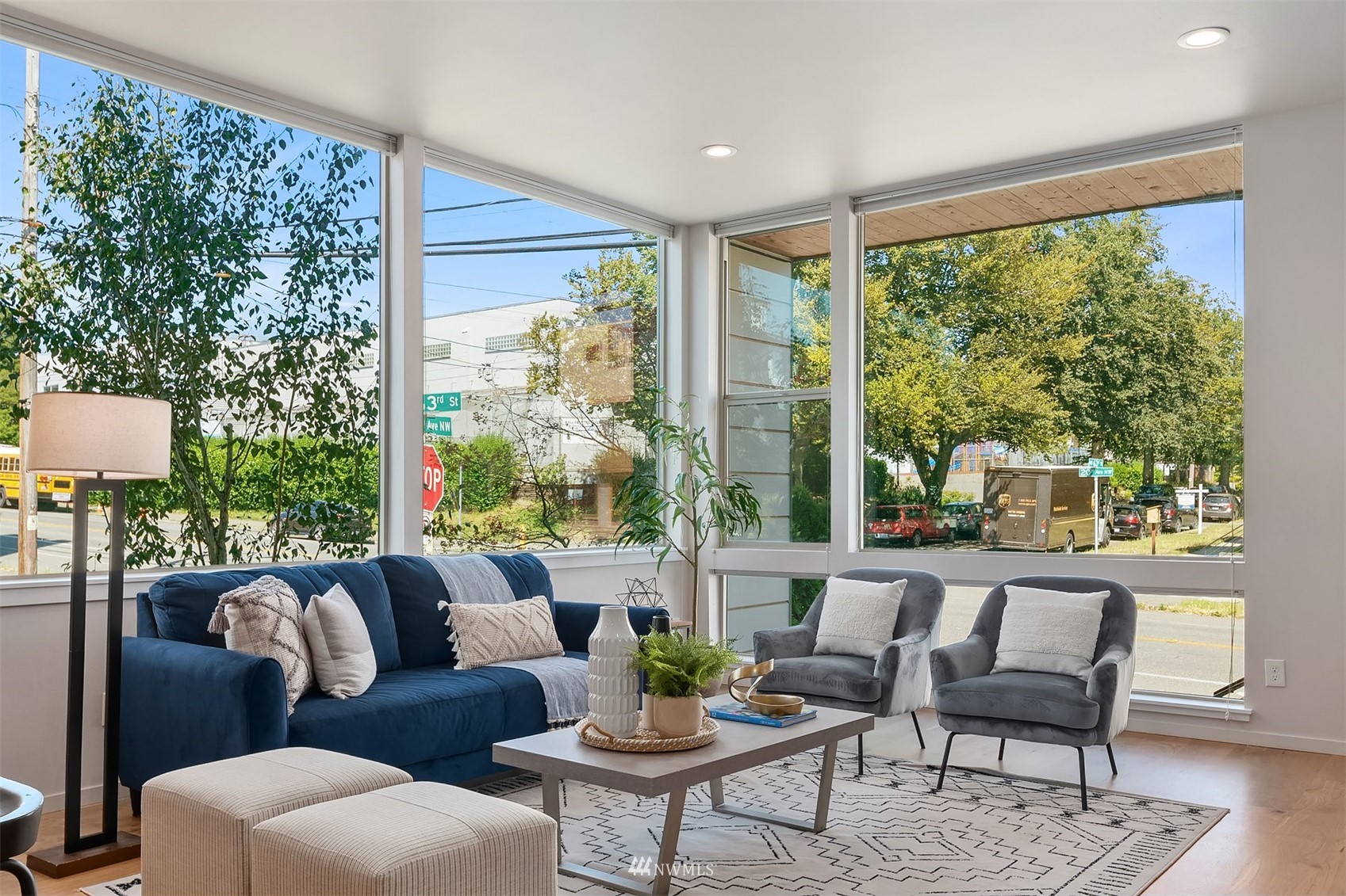 Stylish Row-House in Ballard with a distinctively wide-floorplan ideal for open-concept entertaining. Flooded with natural light, this exceptional corner unit features walls of windows on two-sides. Impeccable hand-selected designer finishes including quartz counters, custom cabinets, gas fireplace, A/C, venetian plaster accent wall. The master suite has spa-like features and walk-in closet. Lower level is complete MIL/ADU with kitchenette, full bath, laundry, & separate entry that can be used as an Airbnb, long term rental or home office. Private rooftop view deck with BBQ hookup and room for garden. Rare 2 designated off-street parking spots included! Only a few blocks to Market Street, restaurants and a Walkscore of 91.