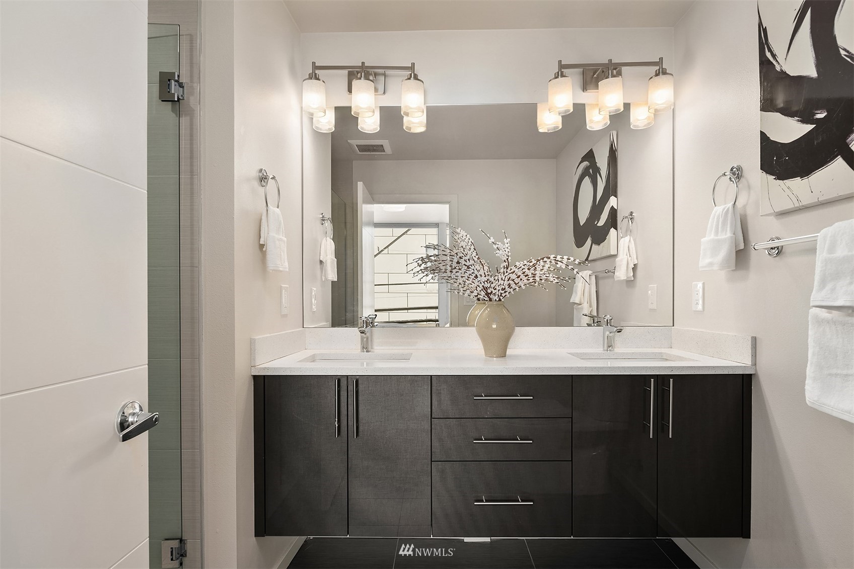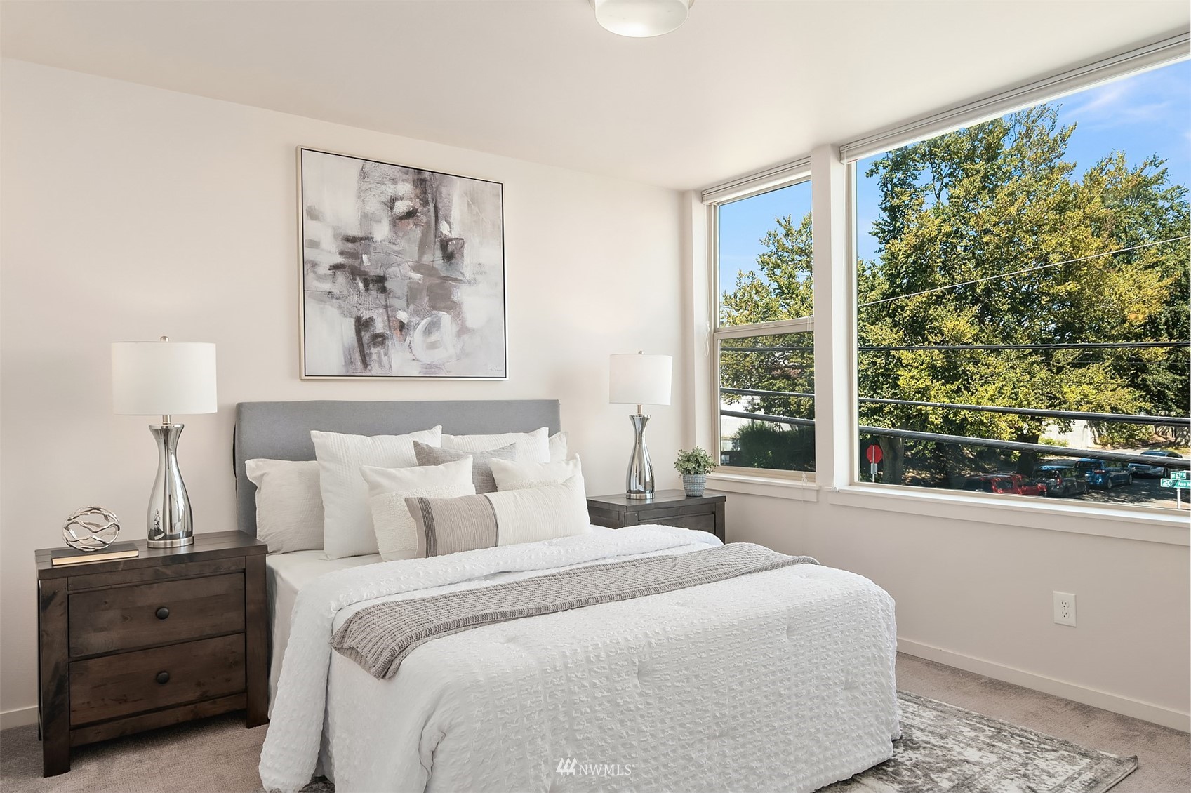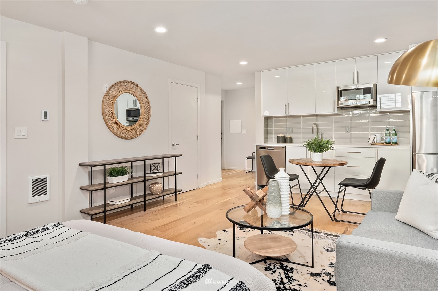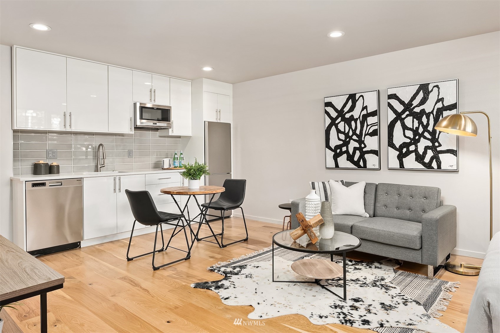 Stylish Row-House in Ballard with a distinctively wide-floorplan ideal for open-concept entertaining. Flooded with natural light, this exceptional corner unit features walls of windows on two-sides. Impeccable hand-selected designer finishes including quartz counters, custom cabinets, gas fireplace, A/C, venetian plaster accent wall. The master suite has spa-like features and walk-in closet. Lower level is complete MIL/ADU with kitchenette, full bath, laundry, & separate entry that can be used as an Airbnb, long term rental or home office. Private rooftop view deck with BBQ hookup and room for garden. Rare 2 designated off-street parking spots included! Only a few blocks to Market Street, restaurants and a Walkscore of 91.