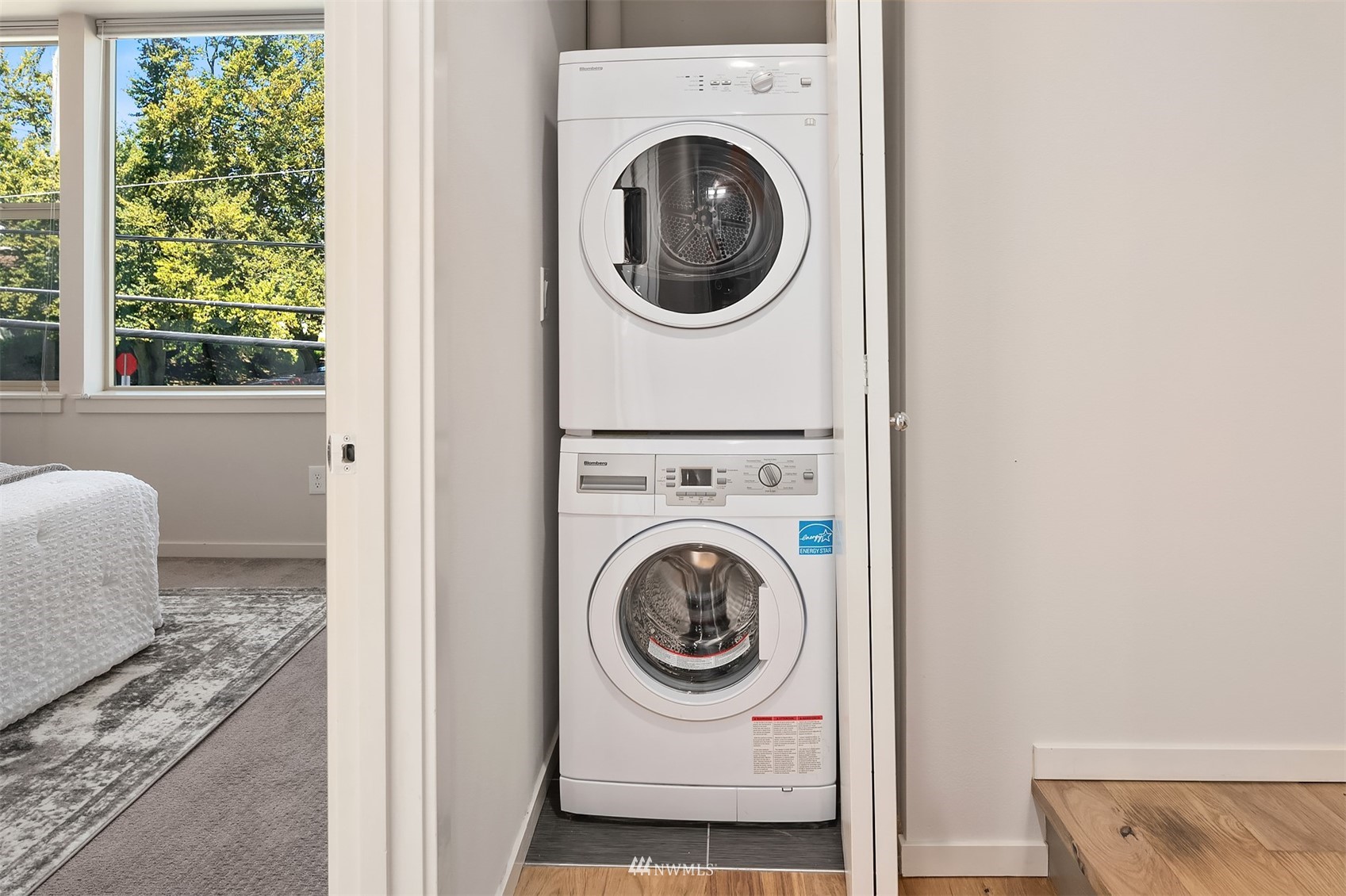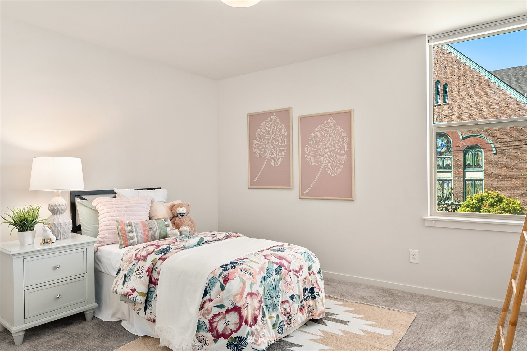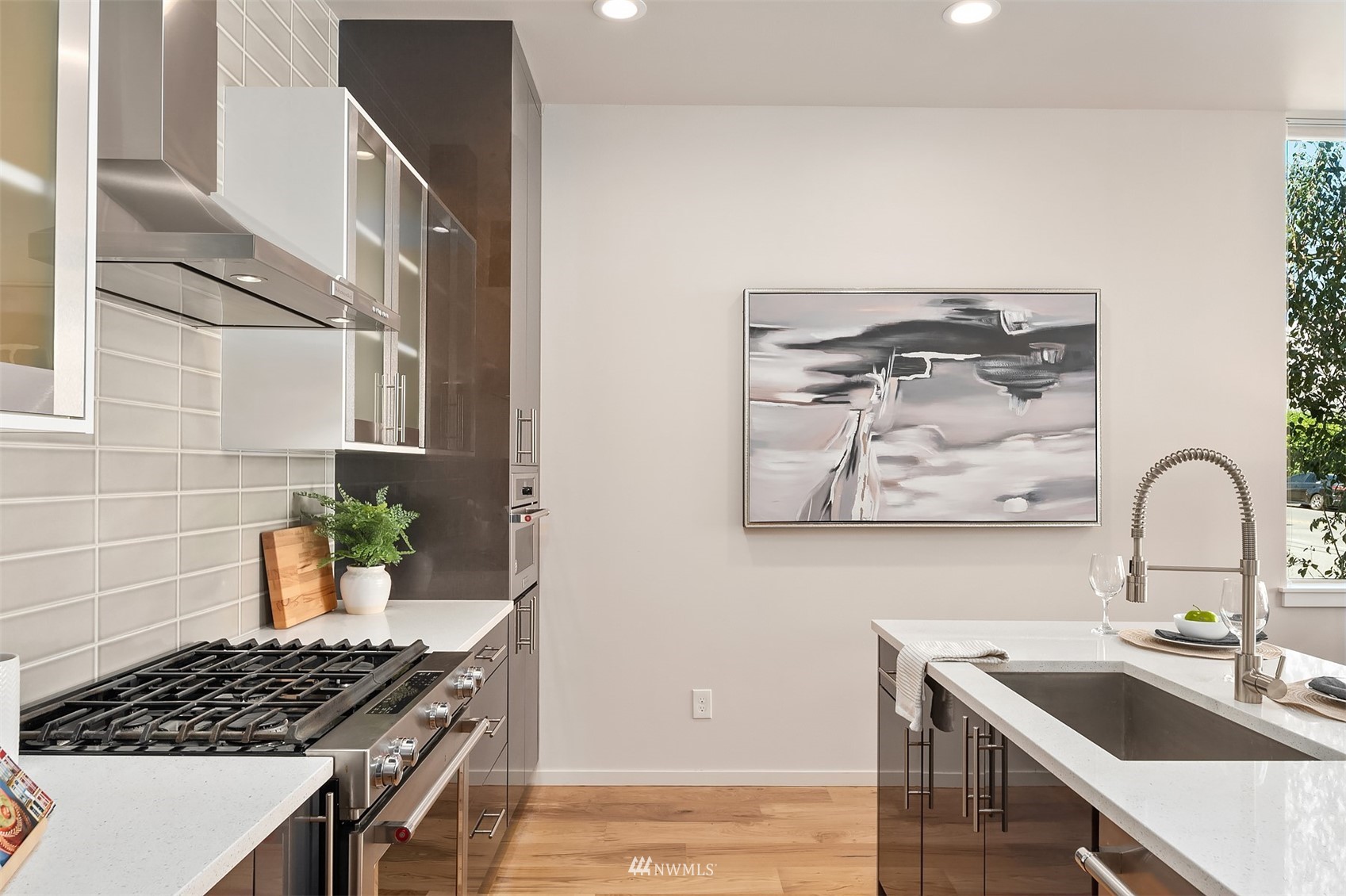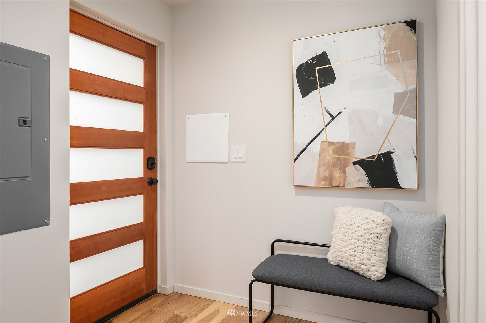 Stylish Row-House in Ballard with a distinctively wide-floorplan ideal for open-concept entertaining. Flooded with natural light, this exceptional corner unit features walls of windows on two-sides. Impeccable hand-selected designer finishes including quartz counters, custom cabinets, gas fireplace, A/C, venetian plaster accent wall. The master suite has spa-like features and walk-in closet. Lower level is complete MIL/ADU with kitchenette, full bath, laundry, & separate entry that can be used as an Airbnb, long term rental or home office. Private rooftop view deck with BBQ hookup and room for garden. Rare 2 designated off-street parking spots included! Only a few blocks to Market Street, restaurants and a Walkscore of 91.