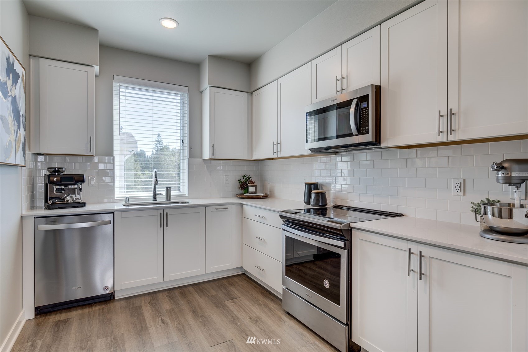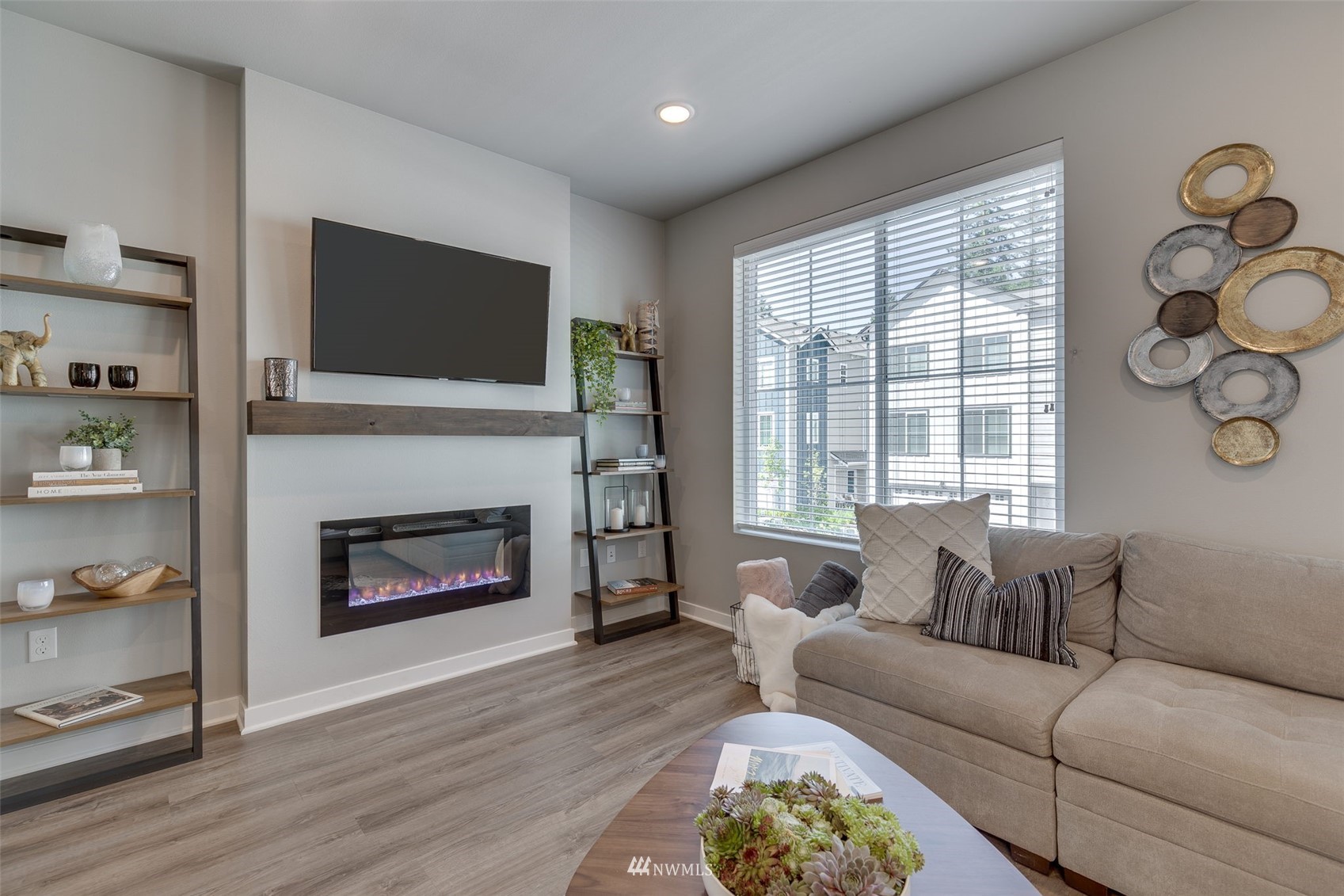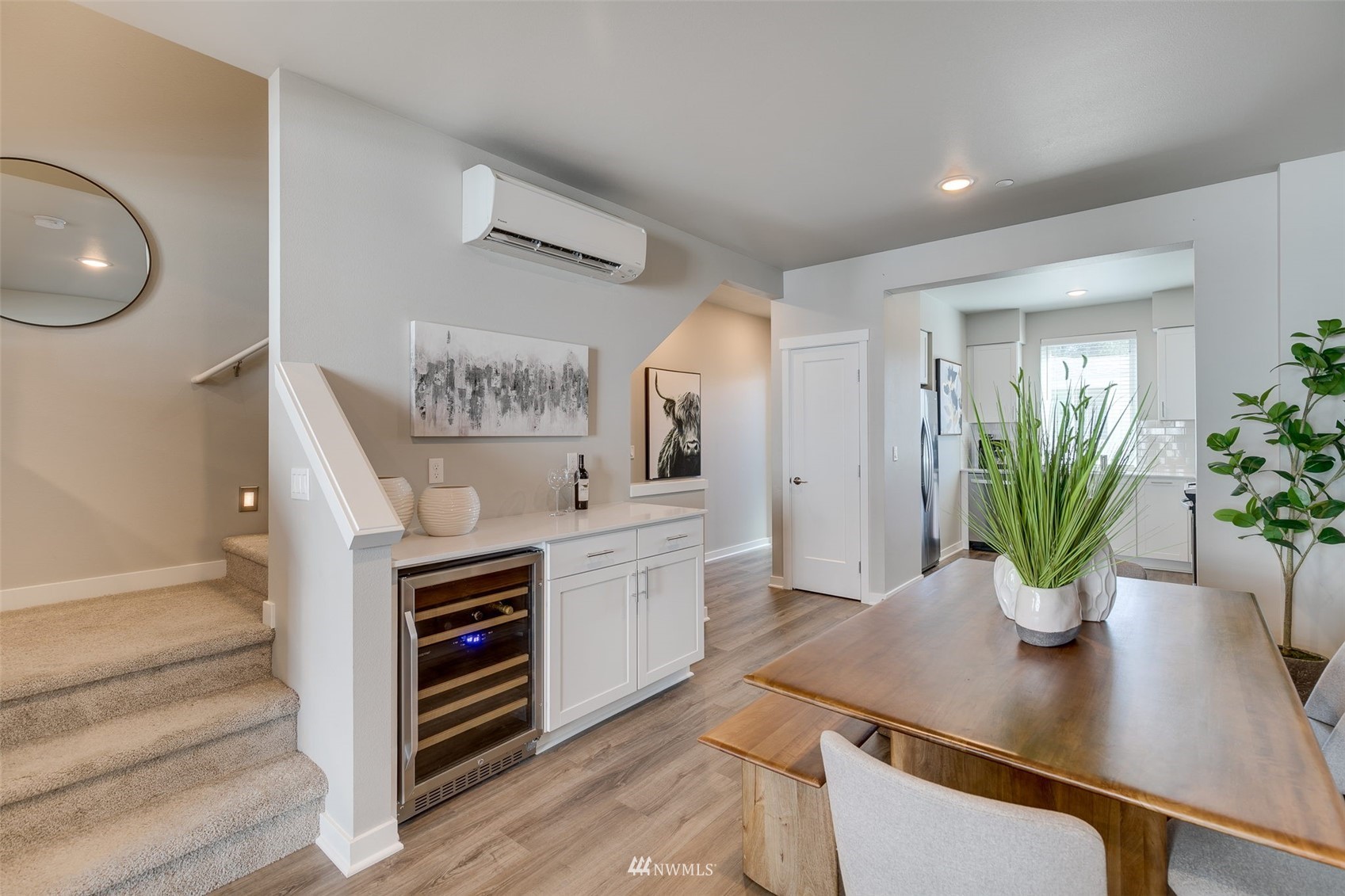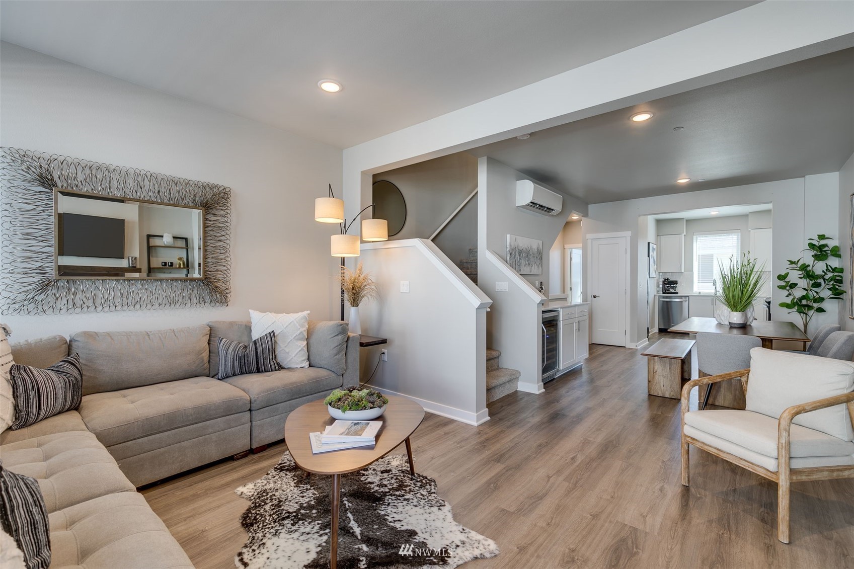 Modern Open Concept. White cabinetry, Quartz counters, Stainless Steel appliances, Built-in Wine Bar with Beverage/Wine Fridge, Wide Plank Laminate Wood Floors, 9' Ceilings, Oversized Windows in Family Room with Ample Lighting, Electric Fireplace w/Mantle, Plus Guest Bath on Main Floor. Primary Bedroom features Barn Door Walk-in Closet and Custom Oversized Tile Shower. Second Bedroom has In-Suite Full Bathroom. Full Size Front Load Washer and Dryer. Energy Efficient, Ductless Heat/AC System. Two Car Tandem Garage; Low Monthly Dues; Minutes to Hwy 9, I-5; New Costco is in walking distance. Lake Stevens excellent Schools and Convenient to Lake Stevens' Boat Launch and Centennial Trail! Wonderful community to call HOME!
