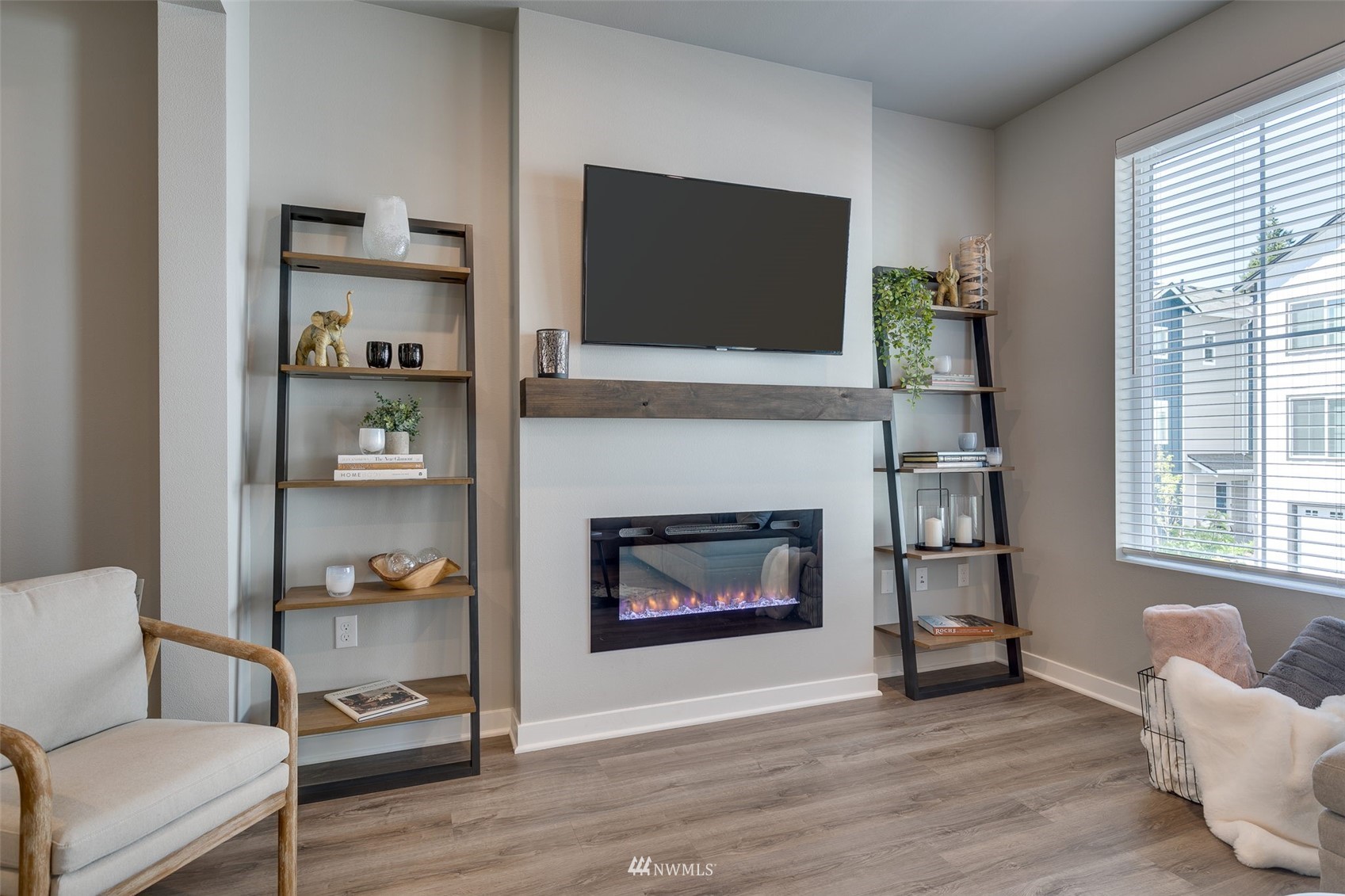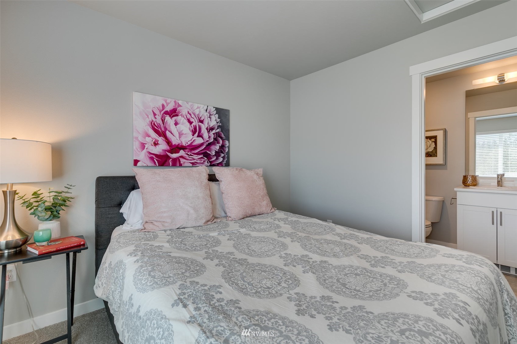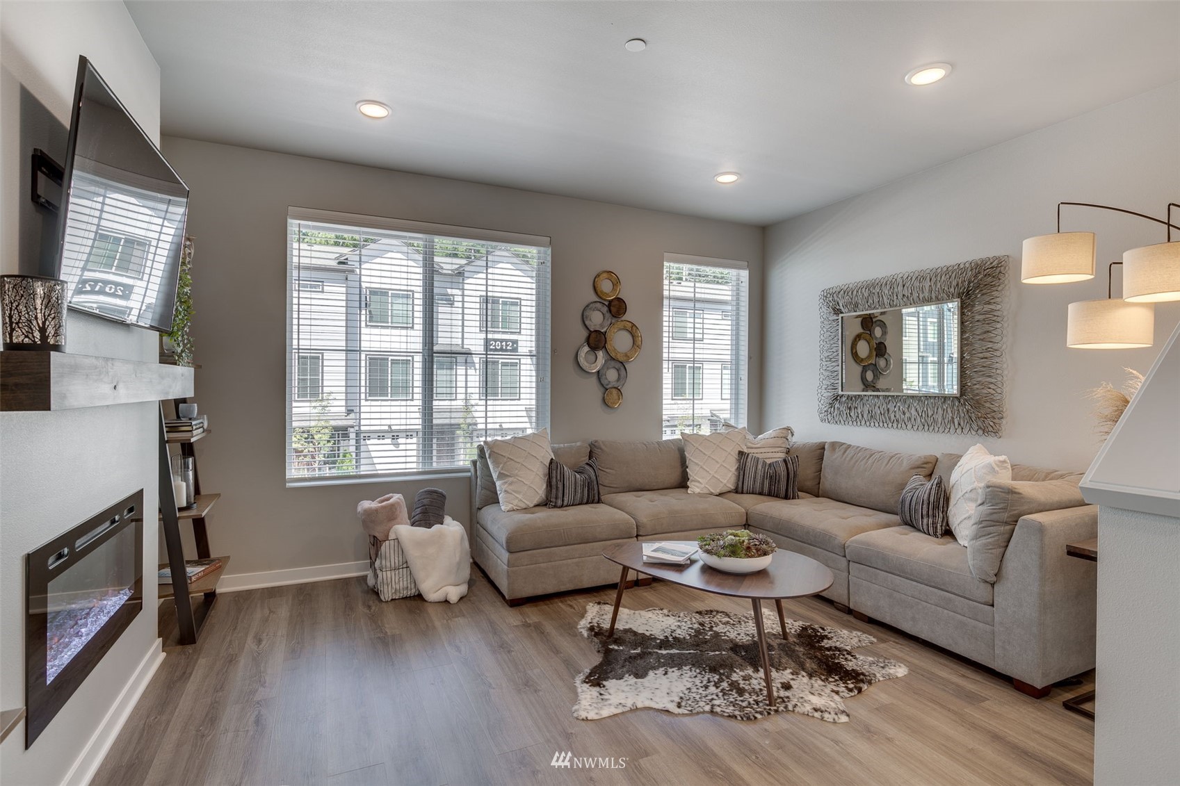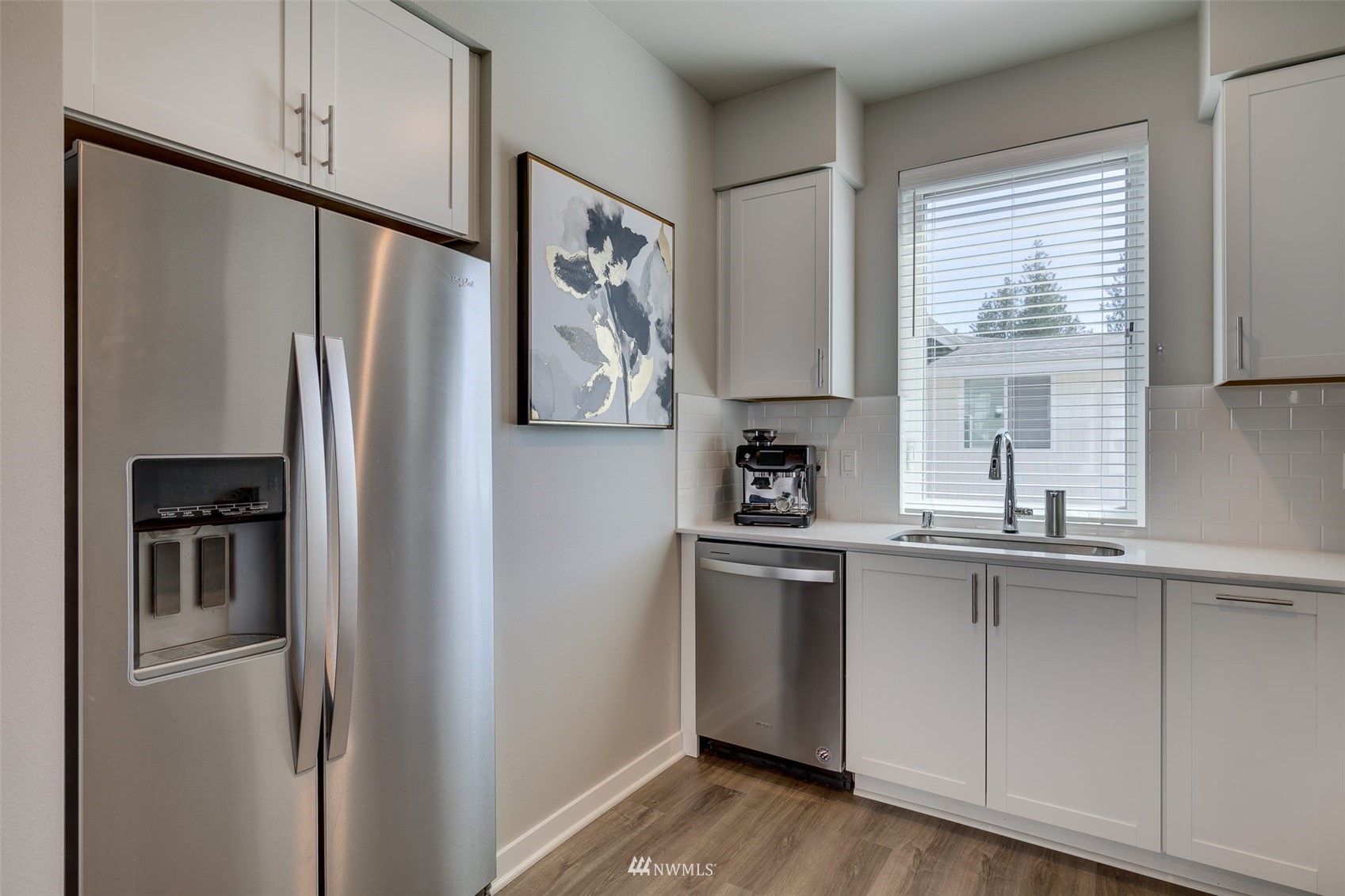 Modern Open Concept. White cabinetry, Quartz counters, Stainless Steel appliances, Built-in Wine Bar with Beverage/Wine Fridge, Wide Plank Laminate Wood Floors, 9' Ceilings, Oversized Windows in Family Room with Ample Lighting, Electric Fireplace w/Mantle, Plus Guest Bath on Main Floor. Primary Bedroom features Barn Door Walk-in Closet and Custom Oversized Tile Shower. Second Bedroom has In-Suite Full Bathroom. Full Size Front Load Washer and Dryer. Energy Efficient, Ductless Heat/AC System. Two Car Tandem Garage; Low Monthly Dues; Minutes to Hwy 9, I-5; New Costco is in walking distance. Lake Stevens excellent Schools and Convenient to Lake Stevens' Boat Launch and Centennial Trail! Wonderful community to call HOME!