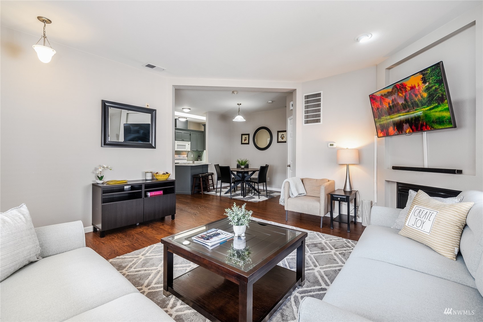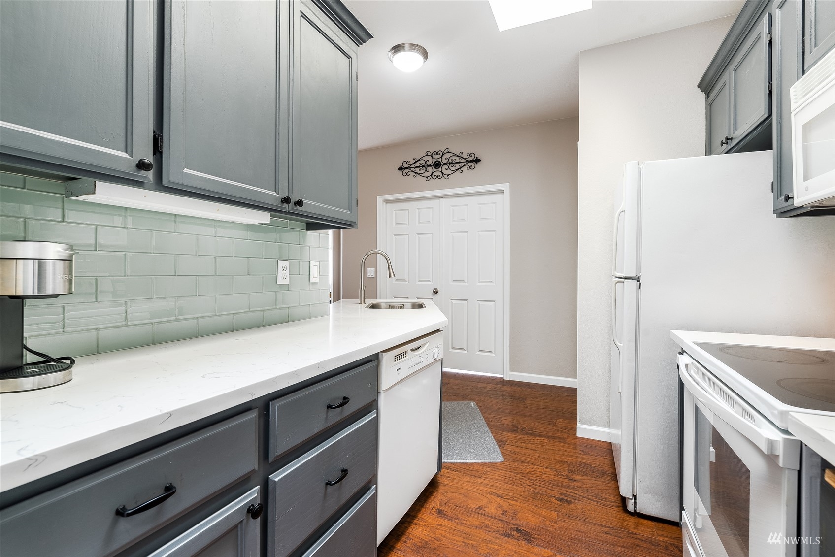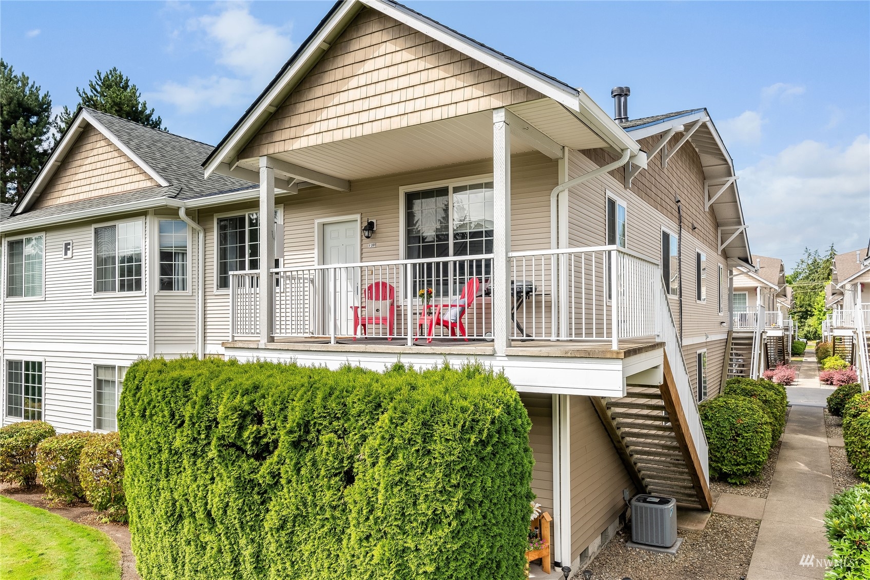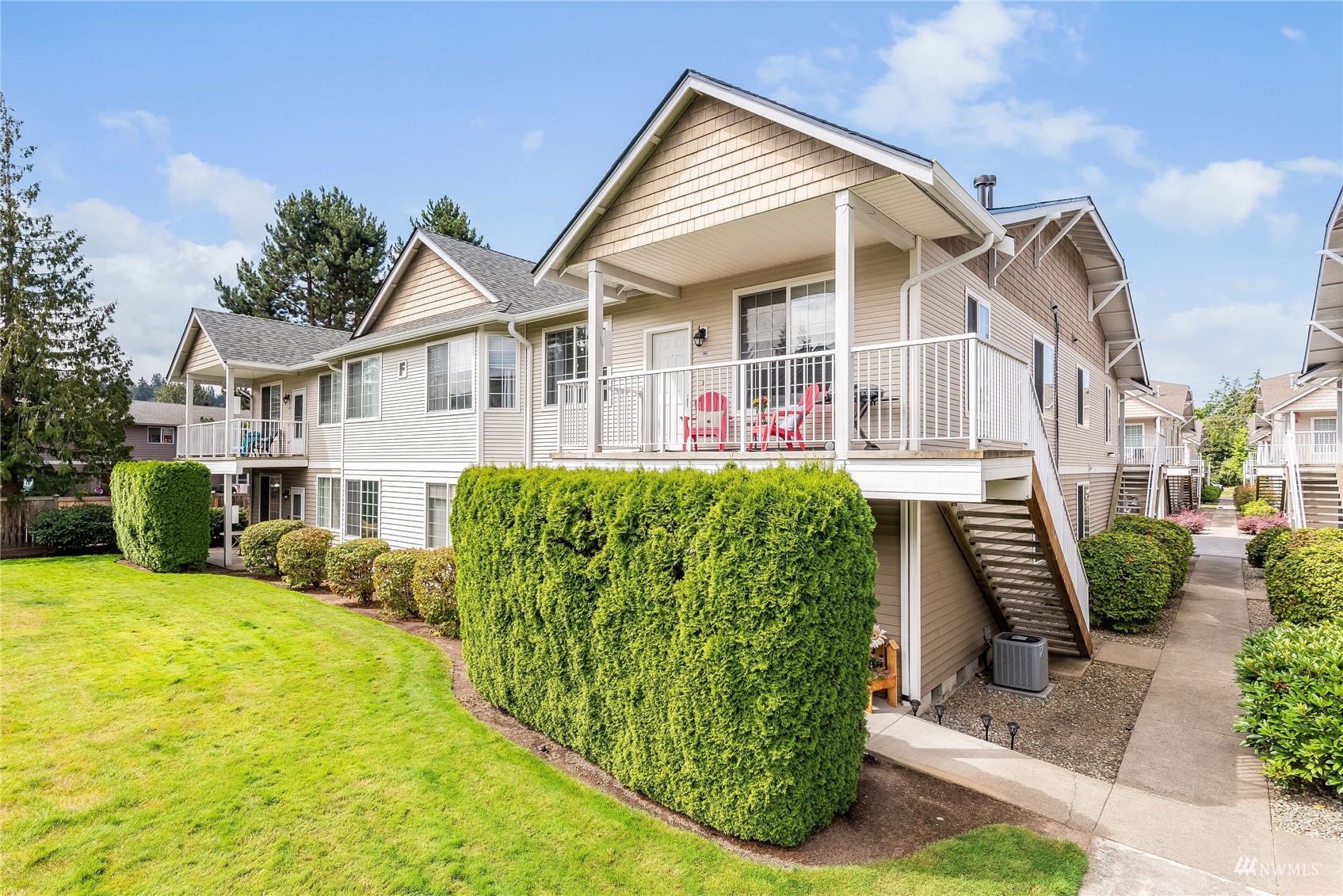 This stunning Puyallup condo offers more than expected! Come into the bright open-concept living area, complete with large windows and a cozy gas fireplace. Remodeled kitchen boasts granite countertops, custom backsplash, contemporary cabinets and appliances that all stay! Master suite includes a remodeled full bath and a spacious walk-in closet. The second bedroom is adjacent to the main bath, and a third room can be used as an office/den/playroom/etc.. Attached garage has extra storage space- very convenient! Laundry in unit and both W&D stay! Low HOA dues cover yardwork, water and sewer! Central A/C allows cool living in the summer, custom blinds throughout home, newer floors & paint, entire unit updated and ready for new owners!