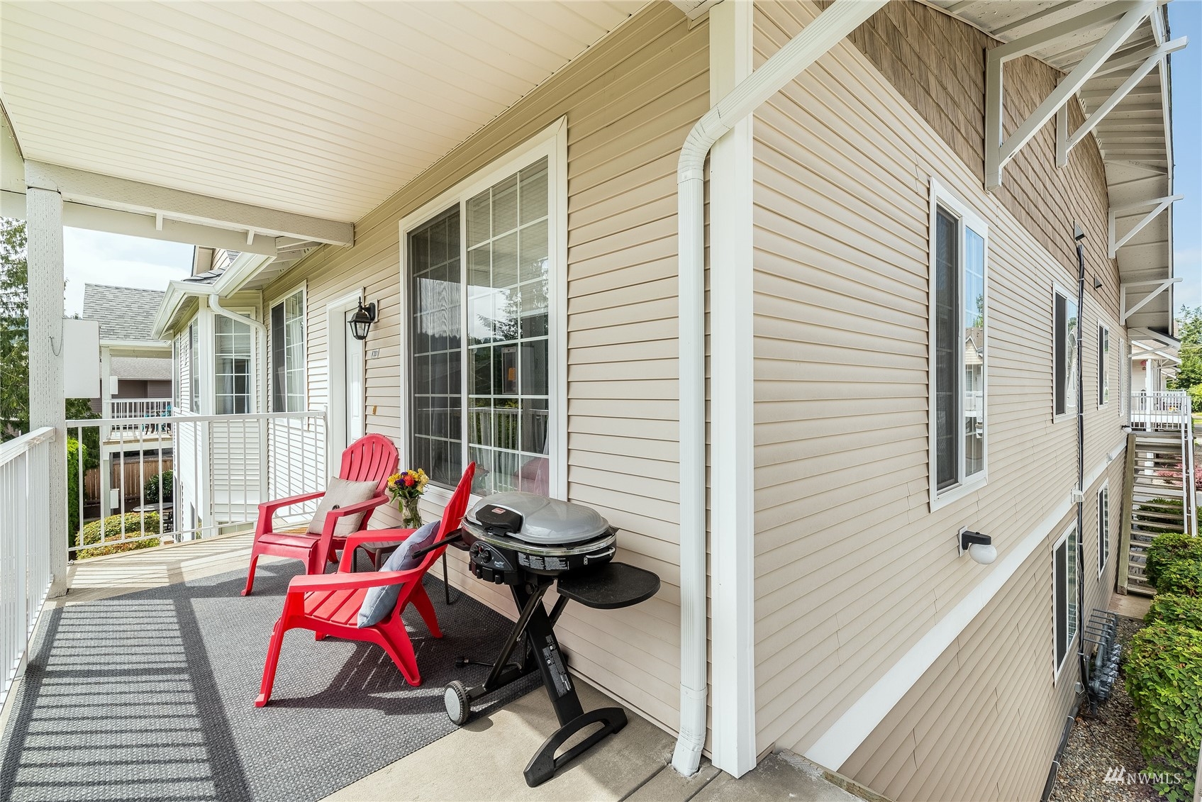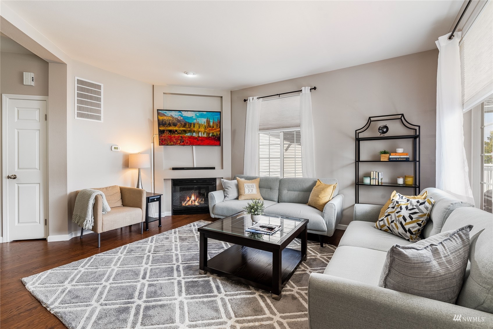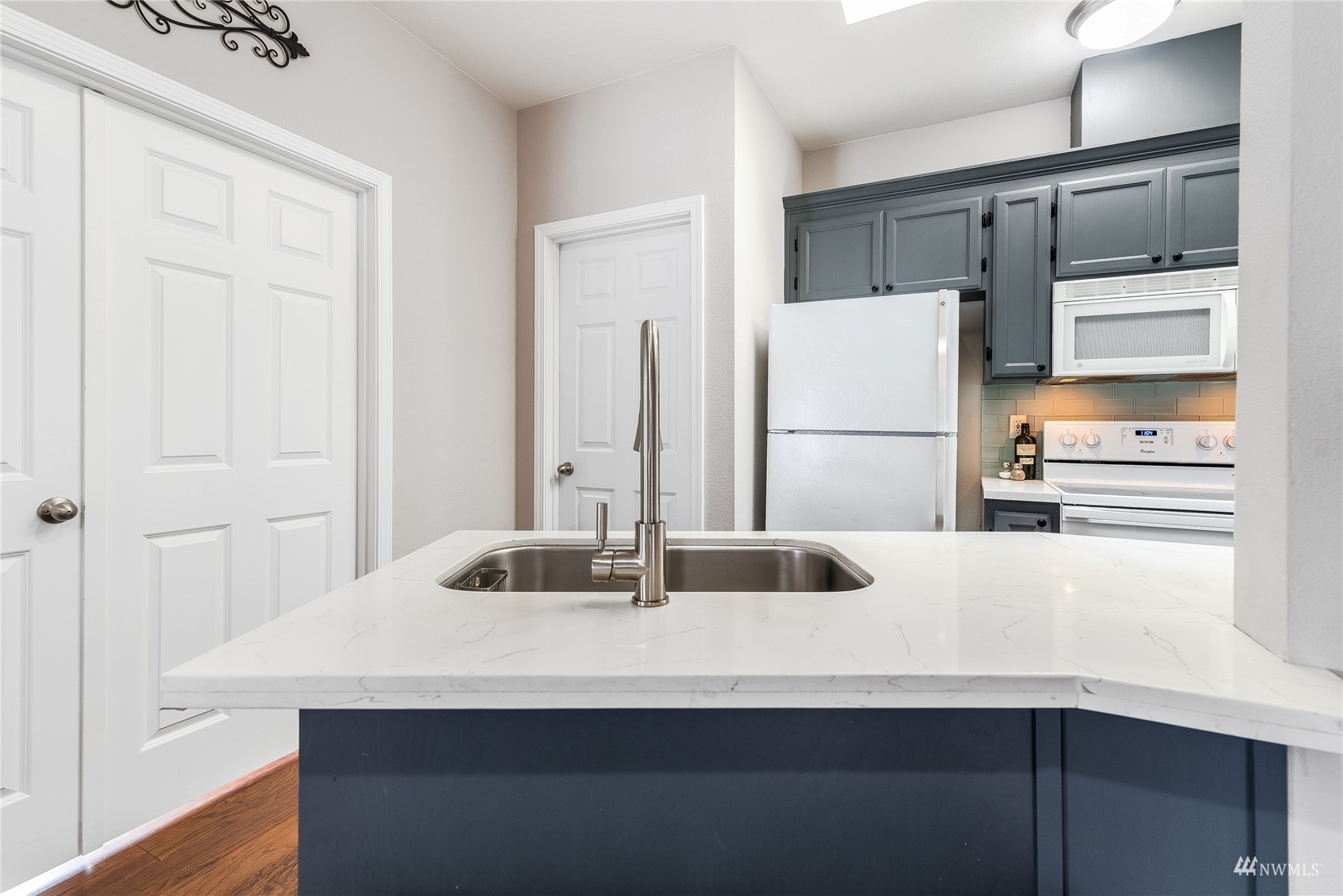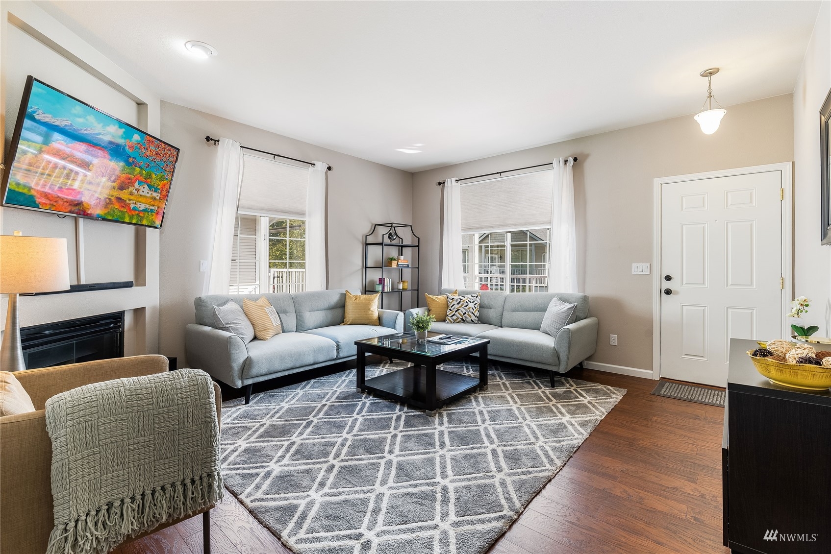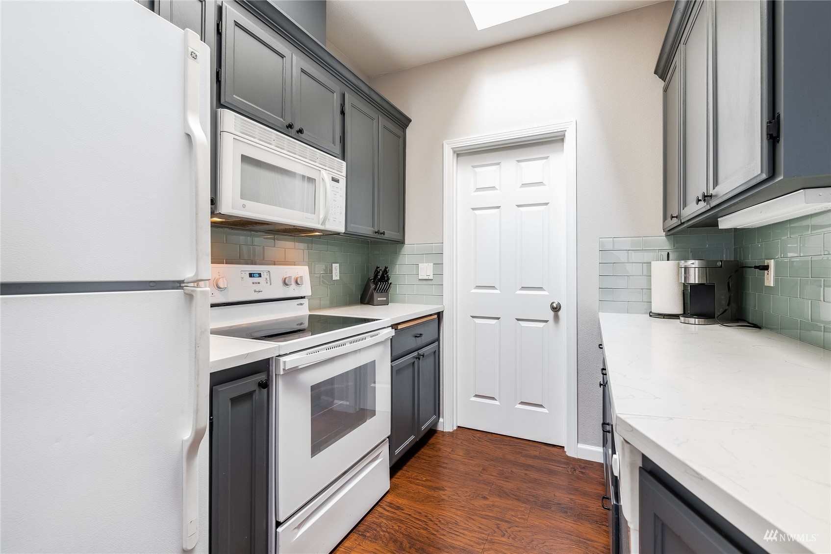 This stunning Puyallup condo offers more than expected! Come into the bright open-concept living area, complete with large windows and a cozy gas fireplace. Remodeled kitchen boasts granite countertops, custom backsplash, contemporary cabinets and appliances that all stay! Master suite includes a remodeled full bath and a spacious walk-in closet. The second bedroom is adjacent to the main bath, and a third room can be used as an office/den/playroom/etc.. Attached garage has extra storage space- very convenient! Laundry in unit and both W&D stay! Low HOA dues cover yardwork, water and sewer! Central A/C allows cool living in the summer, custom blinds throughout home, newer floors & paint, entire unit updated and ready for new owners!