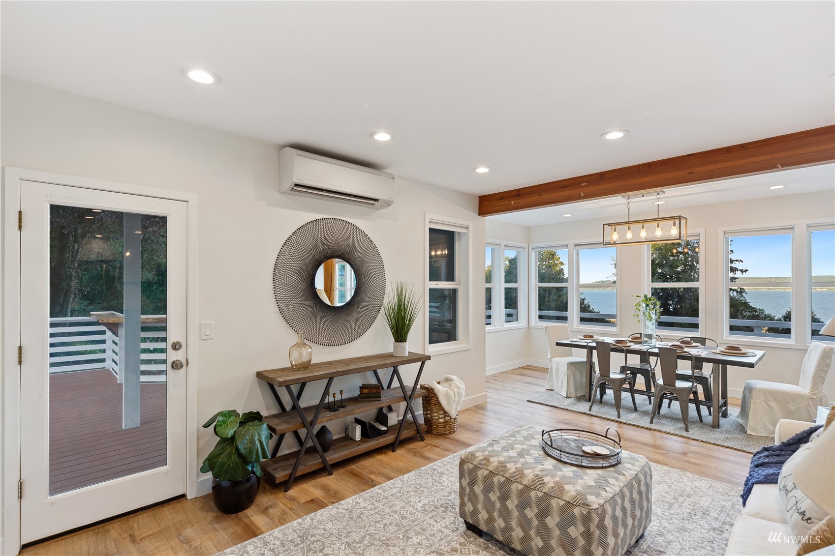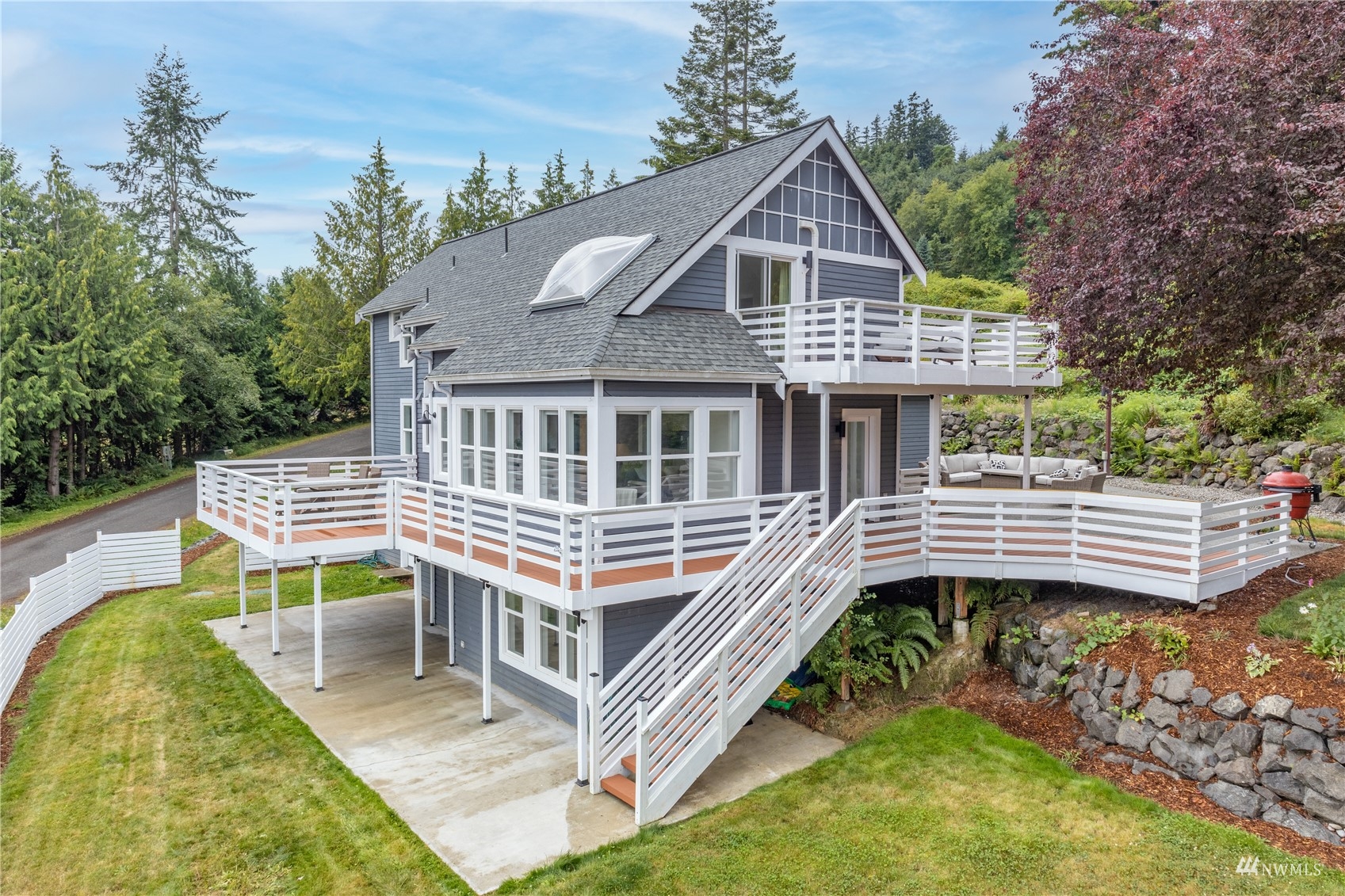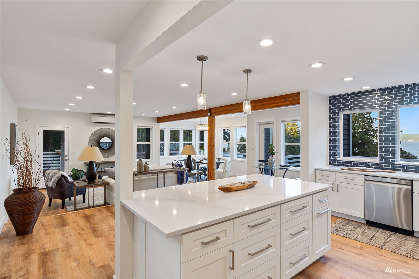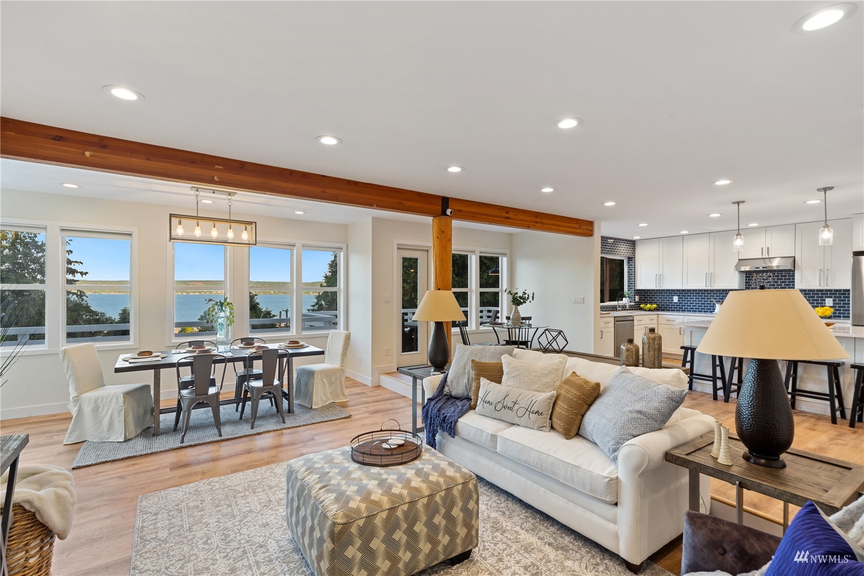 Sweeping views of Hood Canal and the cascades from nearly every room. Every surface has been tastefully and elegantly updated. This stunning home is a 'must see' in person. Spacious main floor boasts luxurious kitchen and open concept Great Room. Upstairs the primary bedroom is pure paradise with private deck & custom closet space leading into spa style bath, look through the giant porthole window, it's the best view in the home. Options for guest rooms on every floor. Lower level has media room wired for theatre, well lit office, full bath and shop space. The outdoors has new decks, garden space, tons of room for entertaining. Check out the slab bar! Private beach access and all just 20 mins from the ferry.