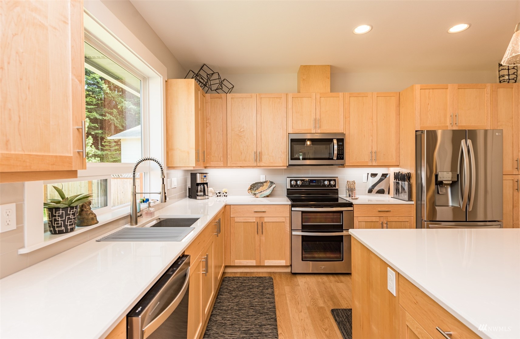 Take a look at this elegantly appointed Sunland home nestled on large corner lot. Built in 2021, this meticulously maintained home is better than new with soaring 9 foot ceilings, formal dining room & entertainer's kitchen. Chefs will appreciate the stainless steel appliances, maple cabinets, quartz counters, built in pot racks, pull out spice cabinet, pantry storage & large island with space for seating. Room to relax in the living room & outside on the deck. Fenced backyard. Primary bedroom has a spa-like ensuite with rainfall shower & custom closet with built in storage. Additional 2 bedrooms & full bathroom off hallway. Custom blinds. Attached 480 foot garage has built in storage cabinets, utility sink & race deck flooring. Model home.