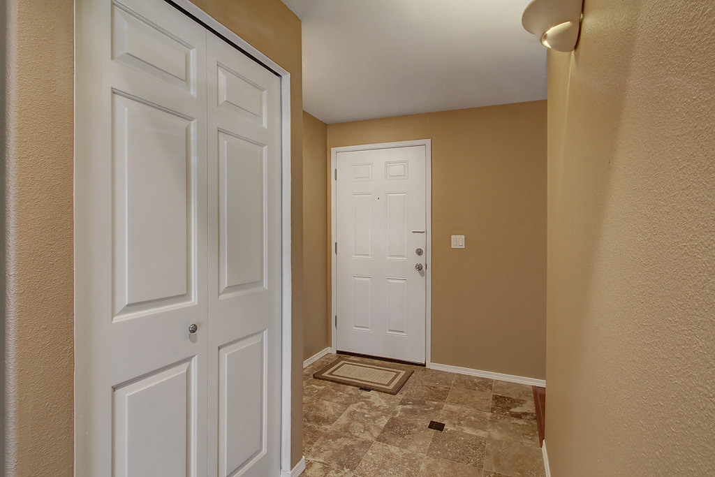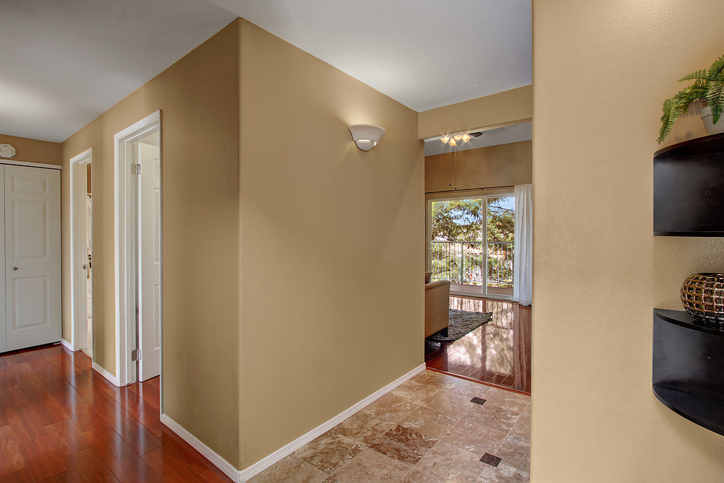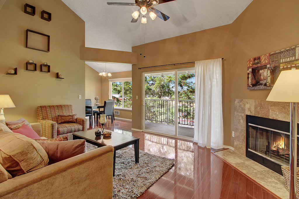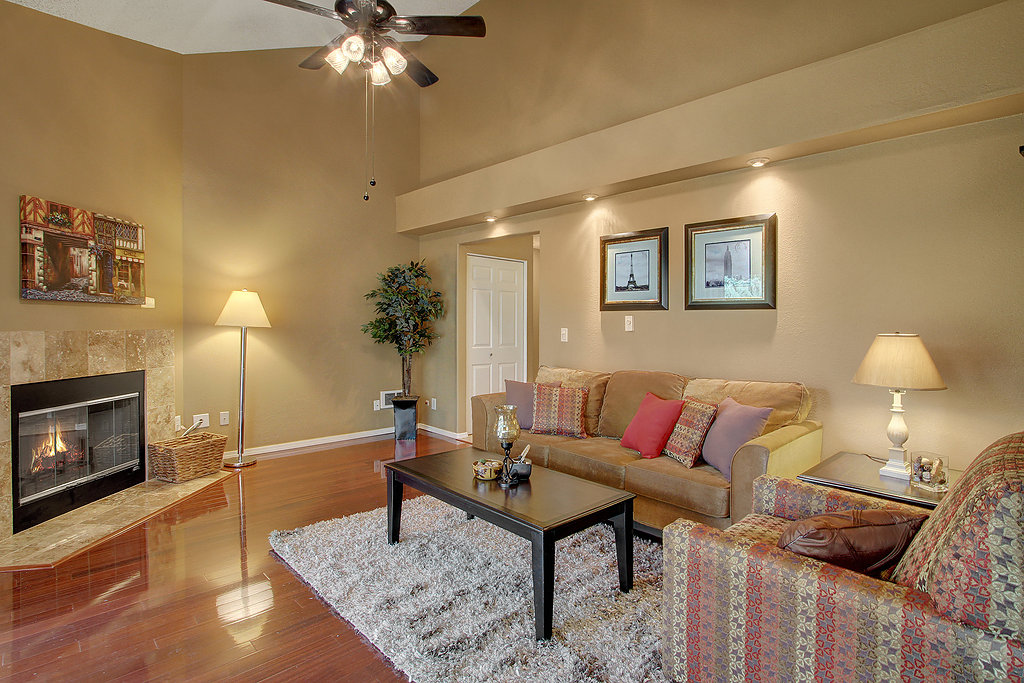 Come see this amazingly updated top floor unit. The travertine entry leads to cherry flooring in the kitchen, dinning & living rooms. Vaulted ceiling & wood burning fireplace highlight the large living room. The kitchen features cherry shaker cabinets, slab granite, & stainless appliances. Continental bath has additional vanity/sink in master. Designer paint, 6 panel doors, private patio, private laundry/utility room - you've got it all! Two parking spaces - one covered. Community clubhouse.