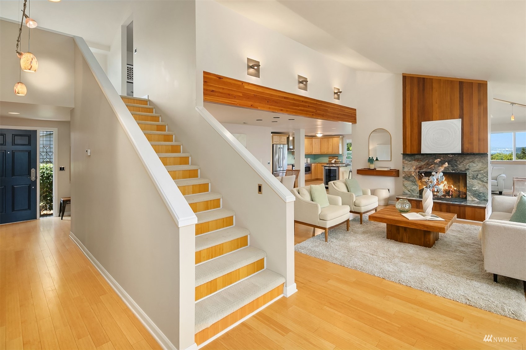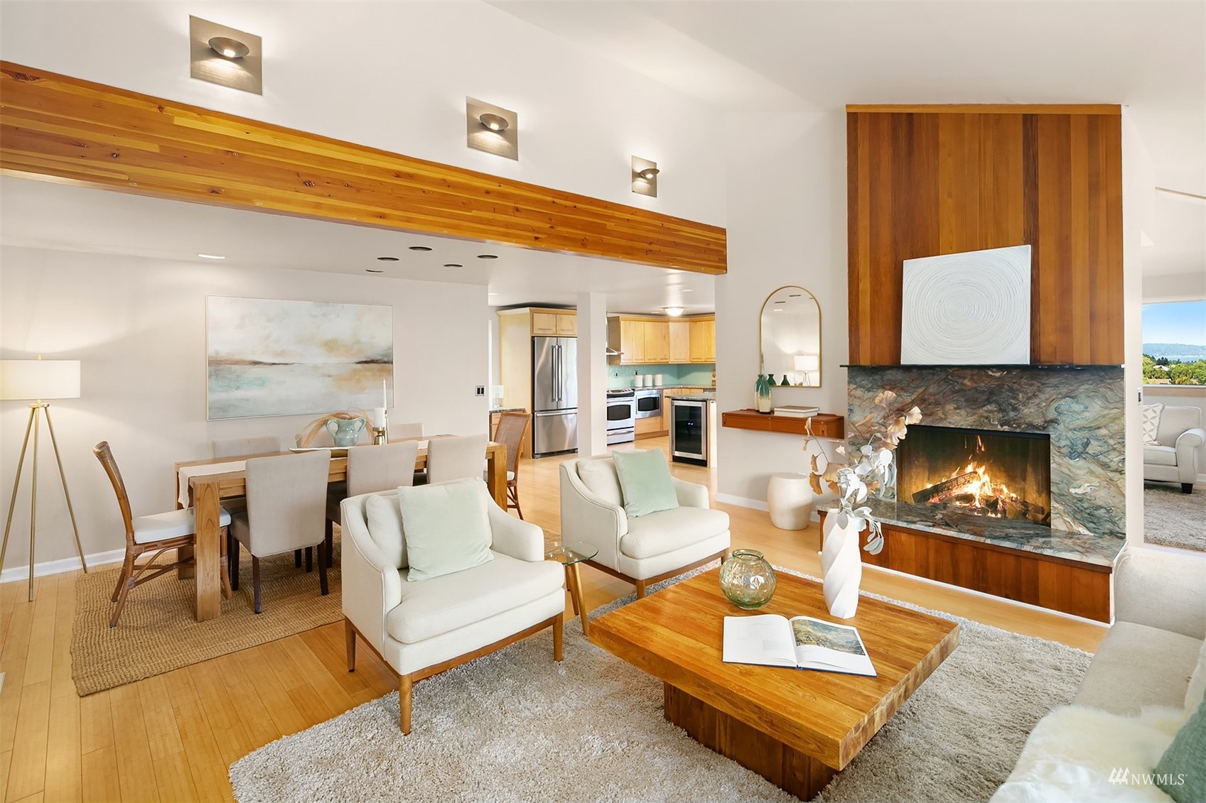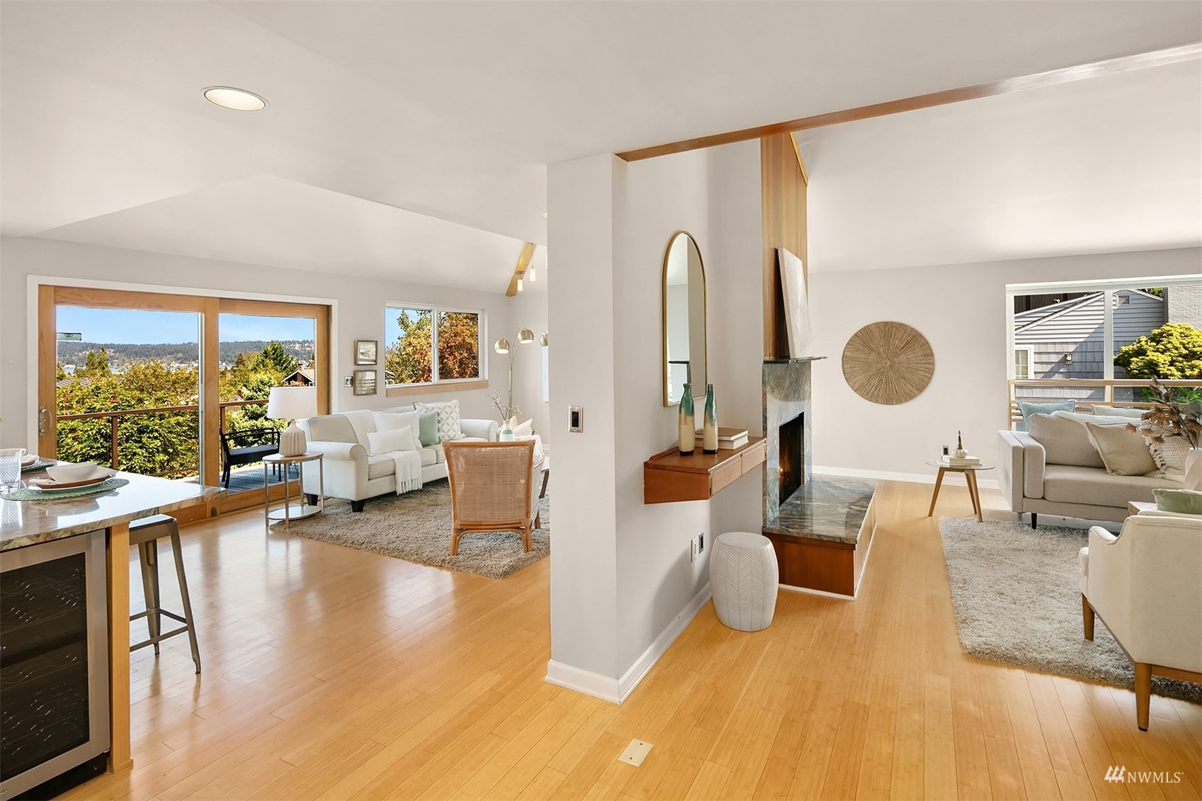 Flair & Function are the hallmarks of this surprising showstopper in NE Seattle! An unassuming exterior opens to the breathtaking open-space atmosphere of this home at the main level. This is the hub of the house w/ a signature woodburning fireplace soaring towards the vaulted ceiling & distinct yet connected spaces including the living/dining rm, kitchen, family room and lovely deck with soothing views and privacy. Finishing this floor is the powder room, primary suite & laundry space. Upstairs find a cozy landing, 2 bedrooms & a full bath. The lower level offers a bonus room. plus a complete apartment for guests, rental, or WFH space. Minutes to Children’s Hospital, UW, Burke-Gilman trail, Magnusson Park, & bus/light rail transit.