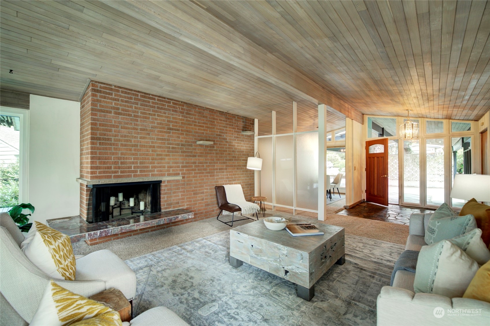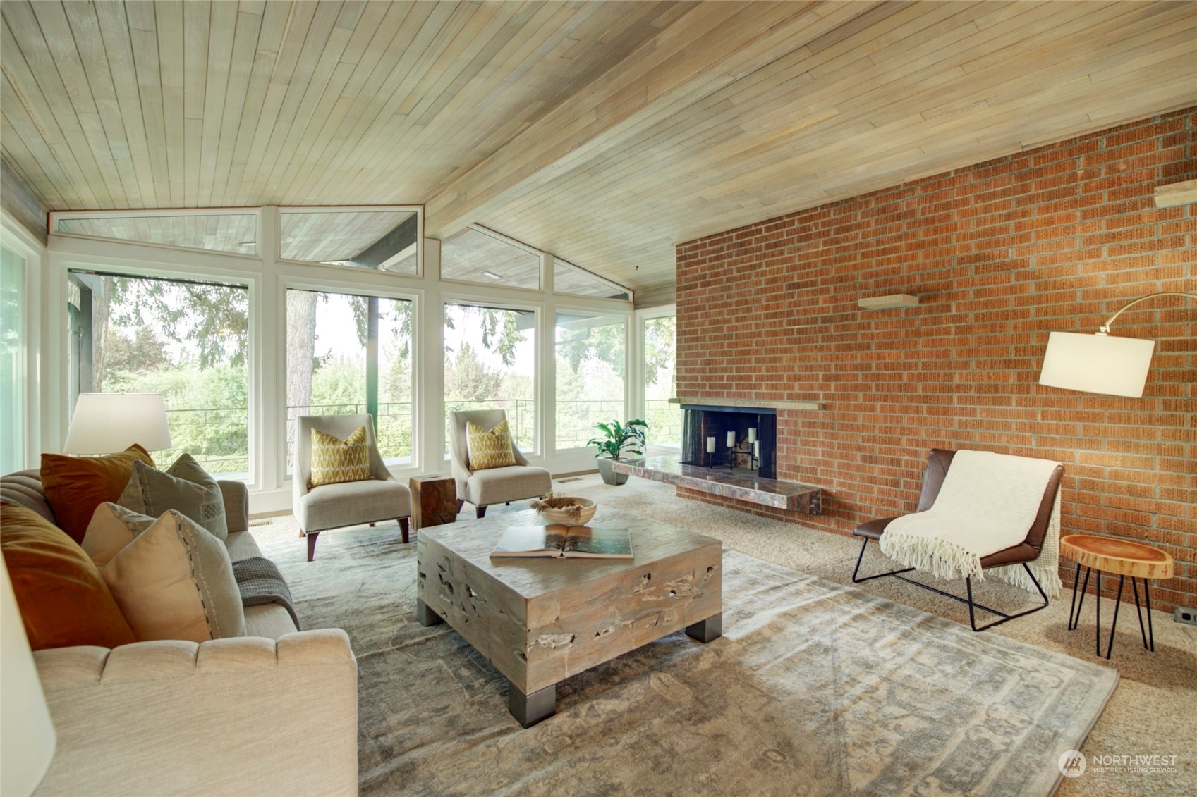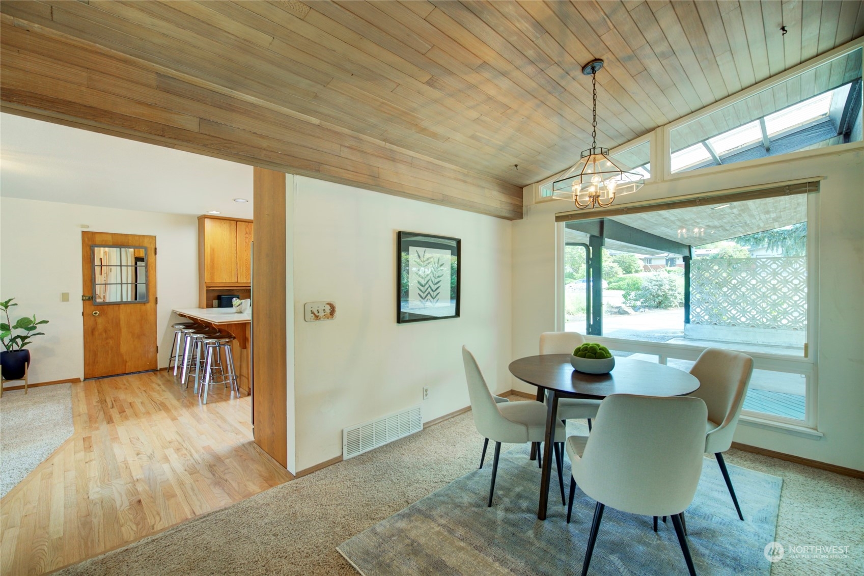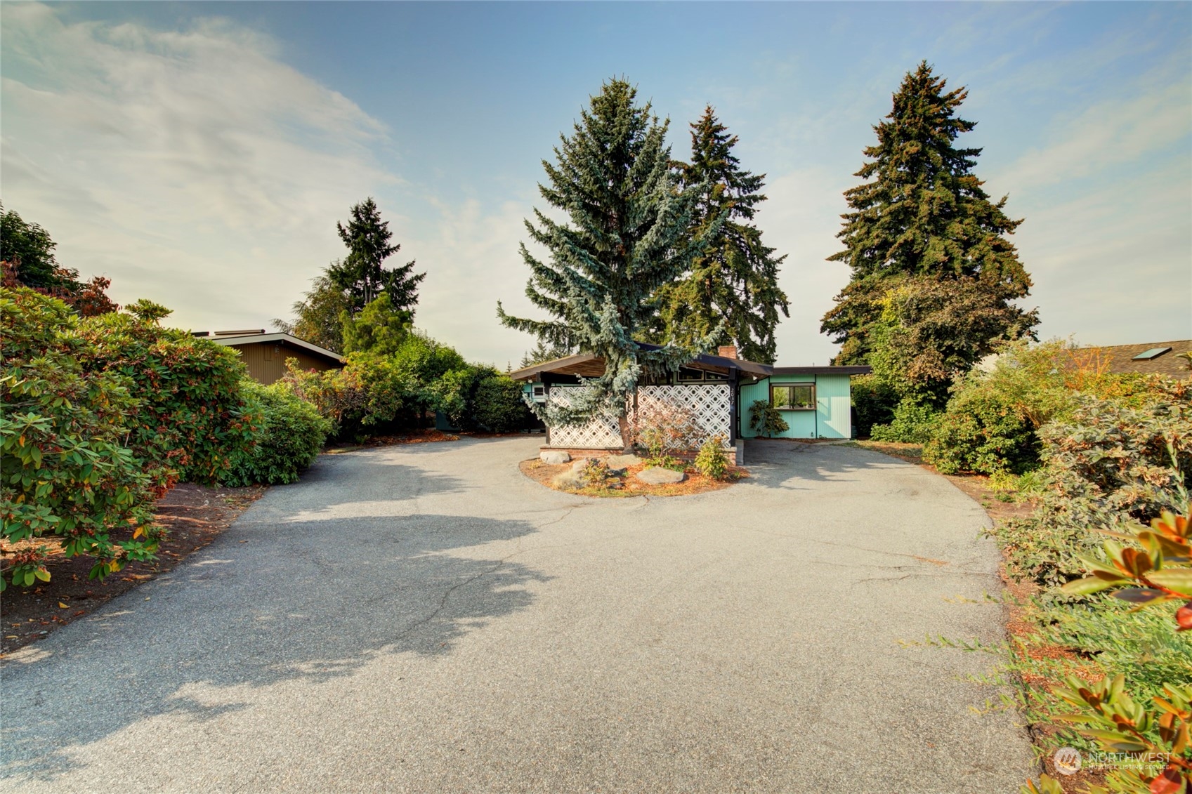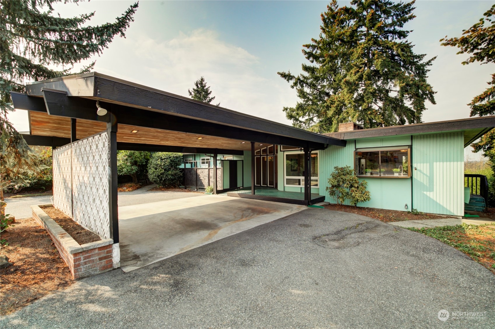 Incredible mid-century home with many of the original design features intact: huge windows, tongue and groove cedar vaulted ceilings, open floorplan with all living area on one level. Remodeled main and primary baths. Remodeled kitchen with stainless steel appliances, Corian counters, and eating bar. Hardwood floors under the carpet. Slider to large view deck and huge patio. Carport with covered front sitting area. Lovely, park-like setting on gently sloping, sunny lot with city and mountain views. Large unfinished basement area. Fantastic Woodridge location with Bellevue schools, easy access to downtown Bellevue or Factoria. This gem is ready for your vision! Two tax lots included in sale. Vacant lot not currently buildable per the City.
