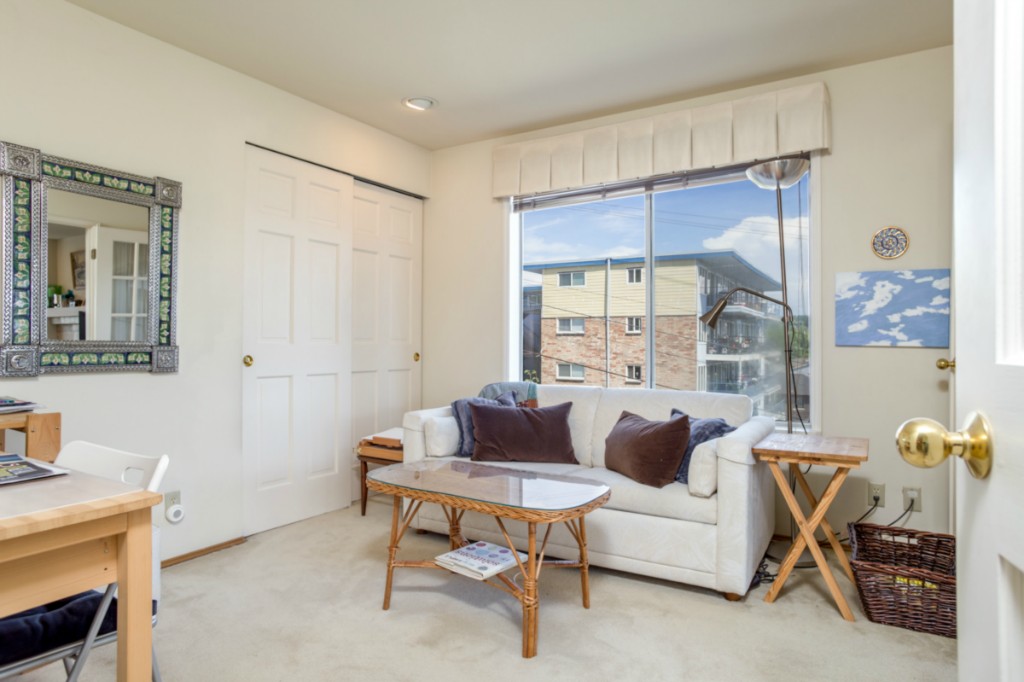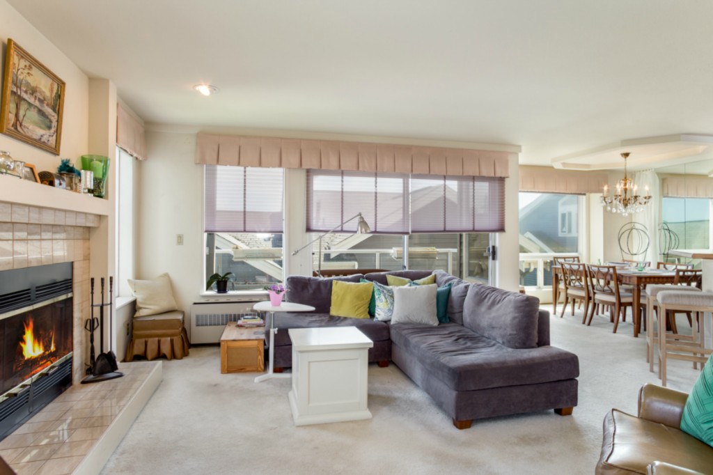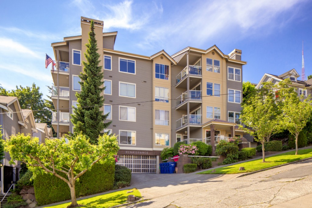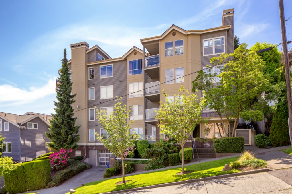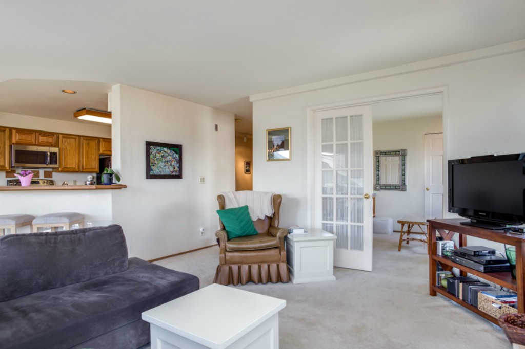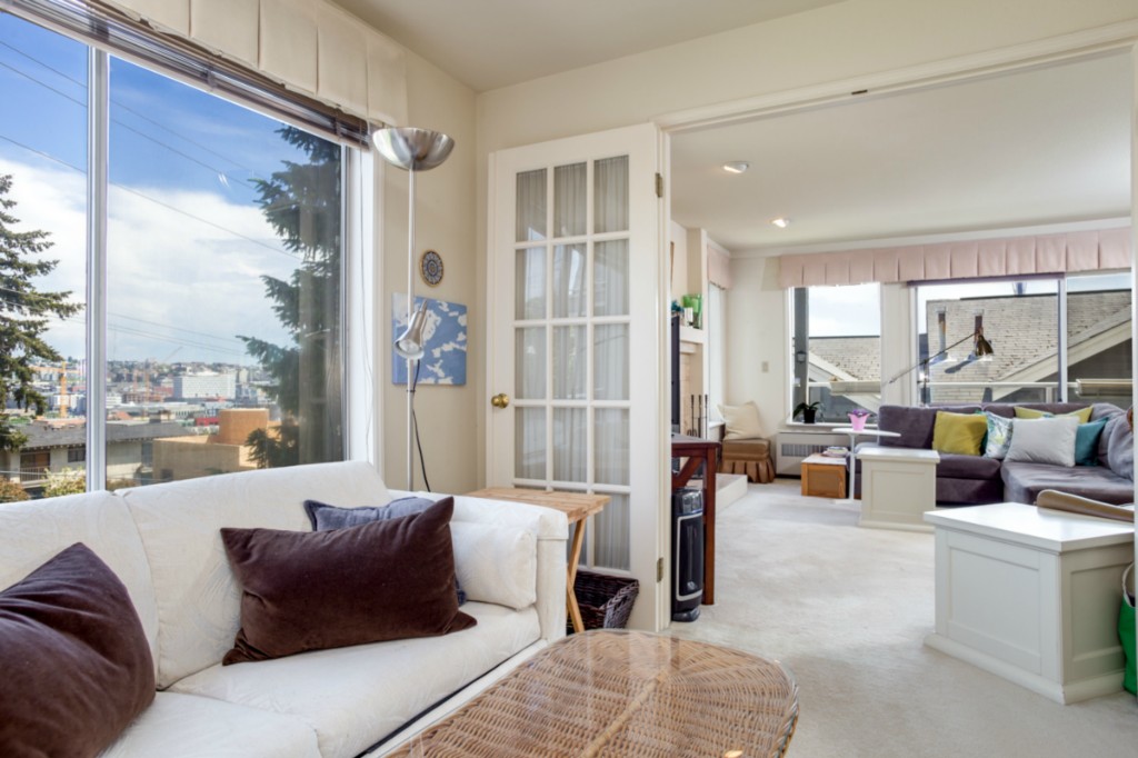 2 bedrooms, 2 full baths, great room with living, dining & fireplace; 1245 sq.ft.; master suite includes full bath and walk in closet. New appliances and pantry. French doors on 2nd bedroom expand living room or create private den/guest room. Bright interior, large picture windows and partial city views from inside and the deck. Quiet 18 condominium building in established neighborhood; elevator, designated parking, storage in garage. Lower Queen Anne location convenient to everything