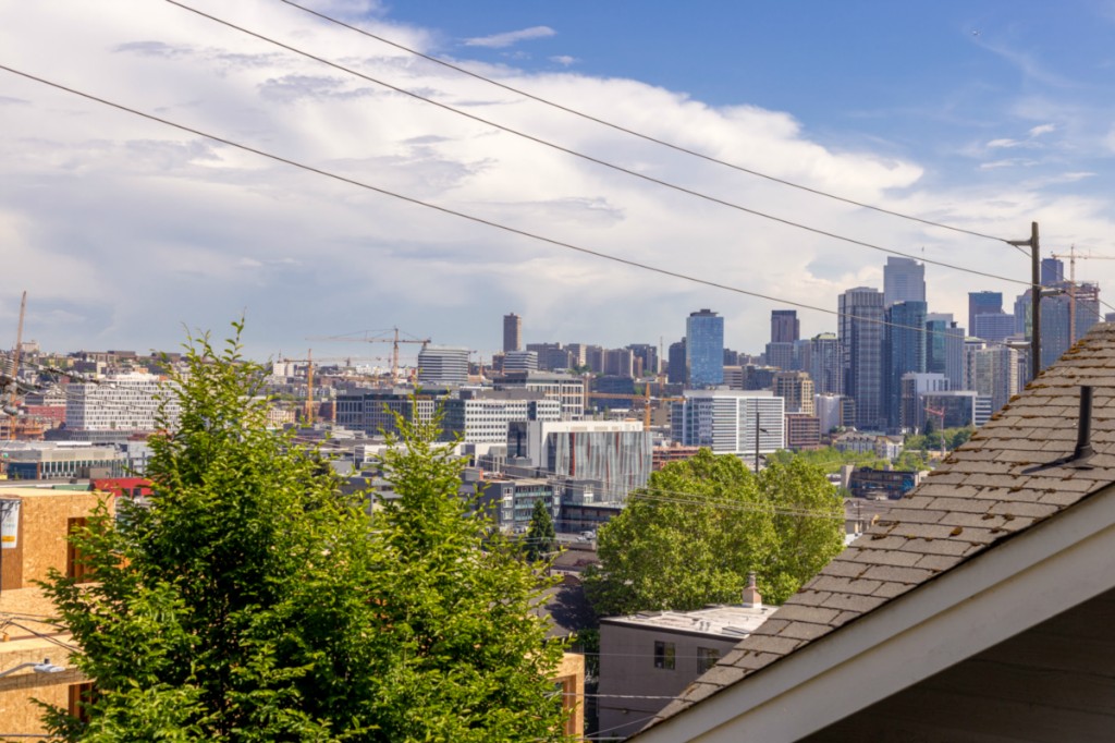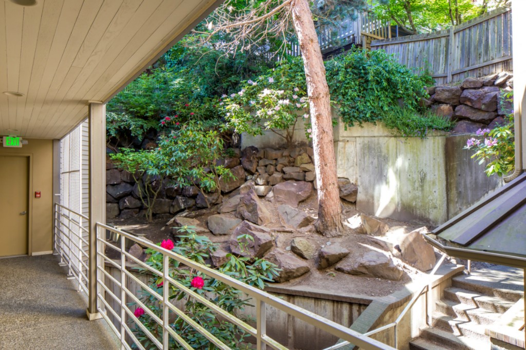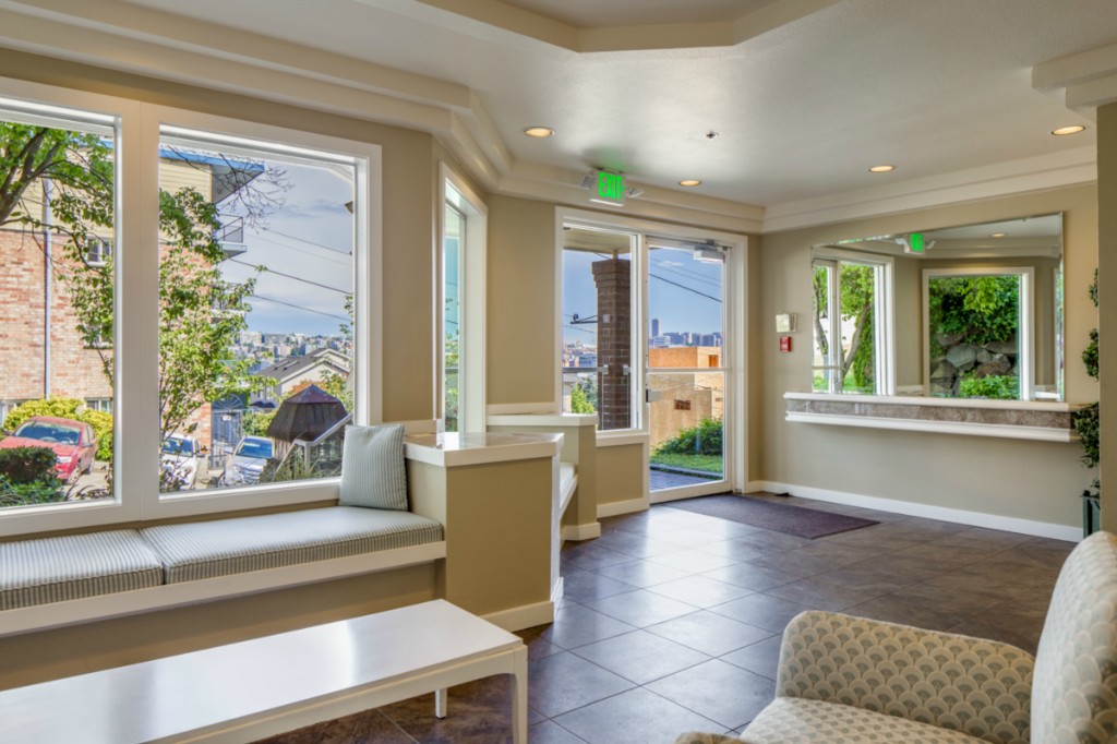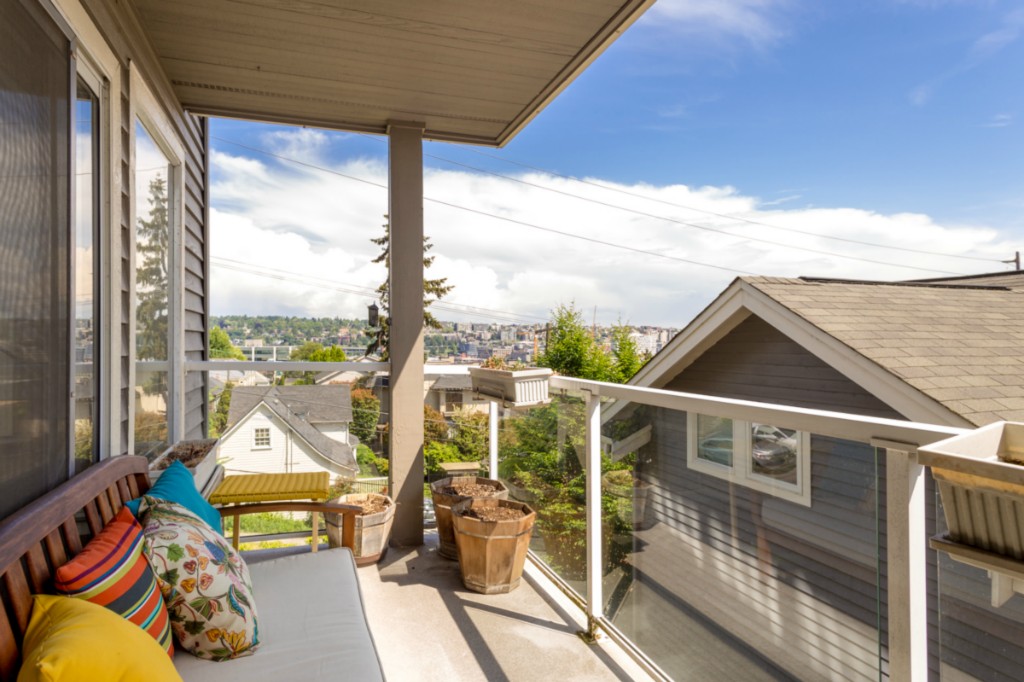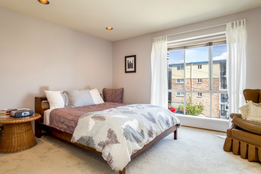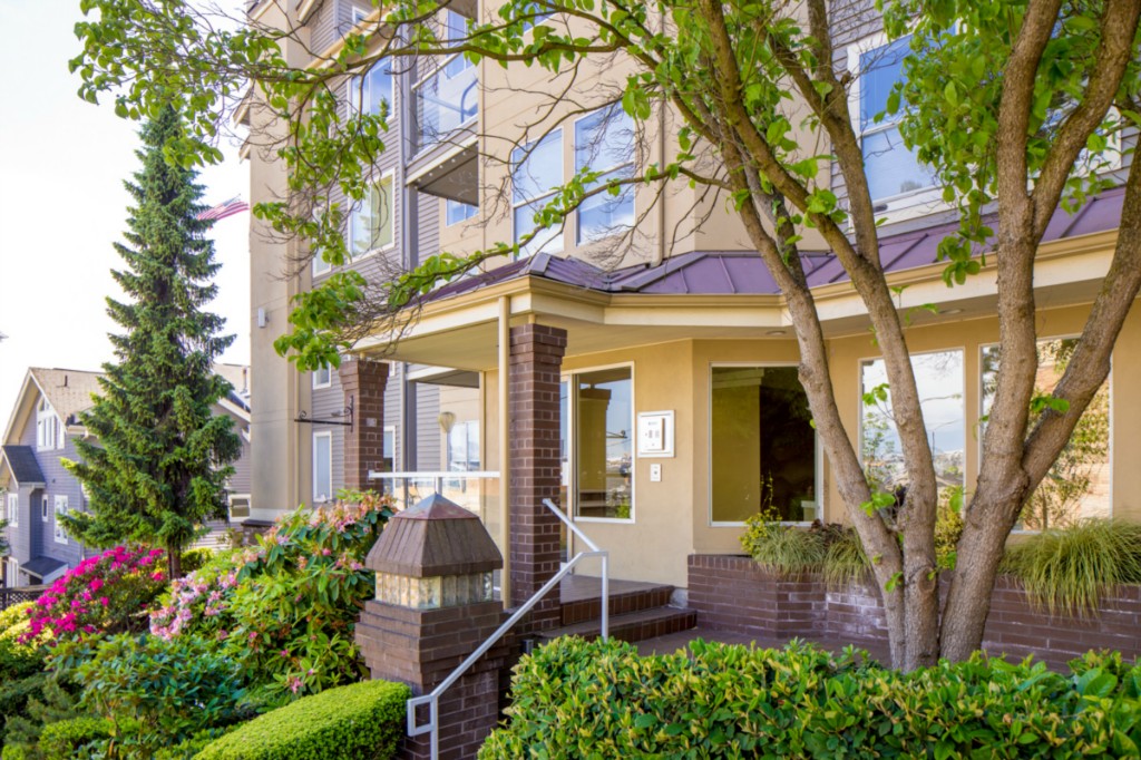 2 bedrooms, 2 full baths, great room with living, dining & fireplace; 1245 sq.ft.; master suite includes full bath and walk in closet. New appliances and pantry. French doors on 2nd bedroom expand living room or create private den/guest room. Bright interior, large picture windows and partial city views from inside and the deck. Quiet 18 condominium building in established neighborhood; elevator, designated parking, storage in garage. Lower Queen Anne location convenient to everything
