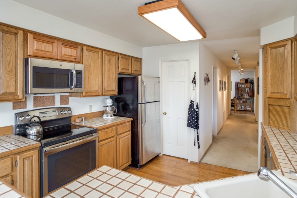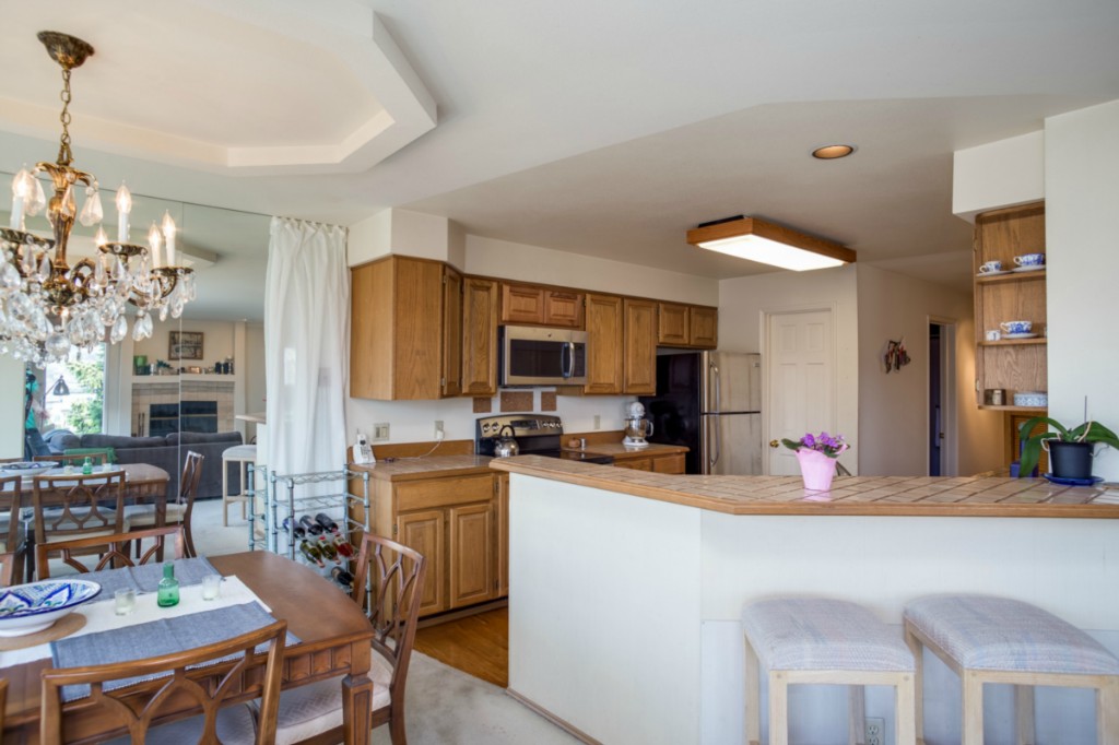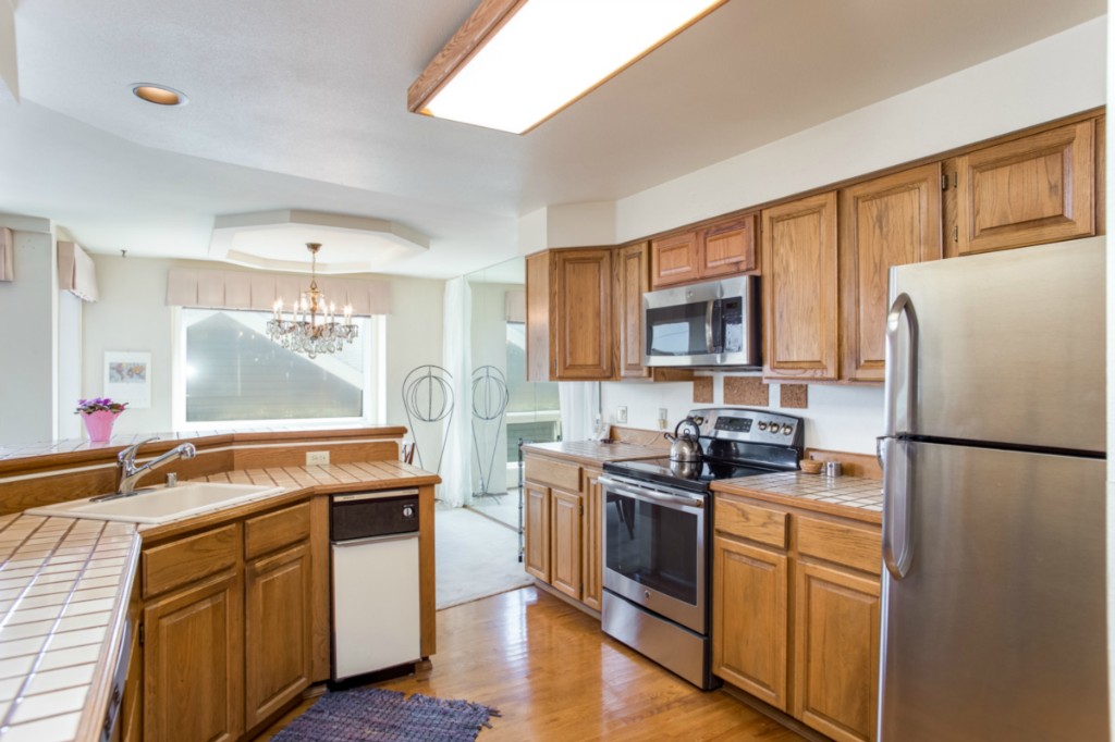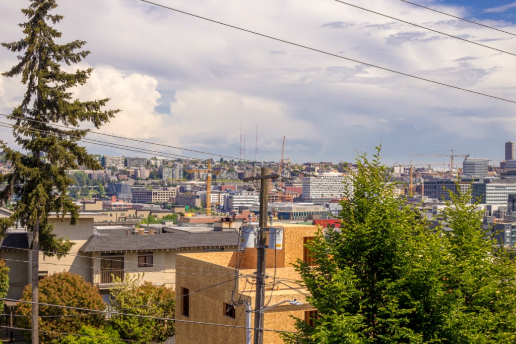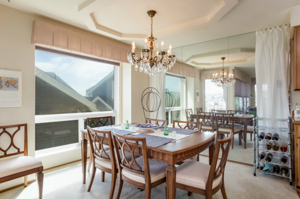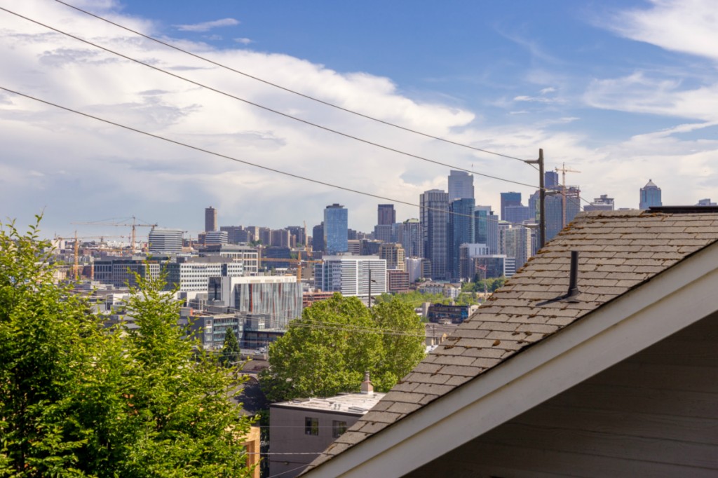 2 bedrooms, 2 full baths, great room with living, dining & fireplace; 1245 sq.ft.; master suite includes full bath and walk in closet. New appliances and pantry. French doors on 2nd bedroom expand living room or create private den/guest room. Bright interior, large picture windows and partial city views from inside and the deck. Quiet 18 condominium building in established neighborhood; elevator, designated parking, storage in garage. Lower Queen Anne location convenient to everything