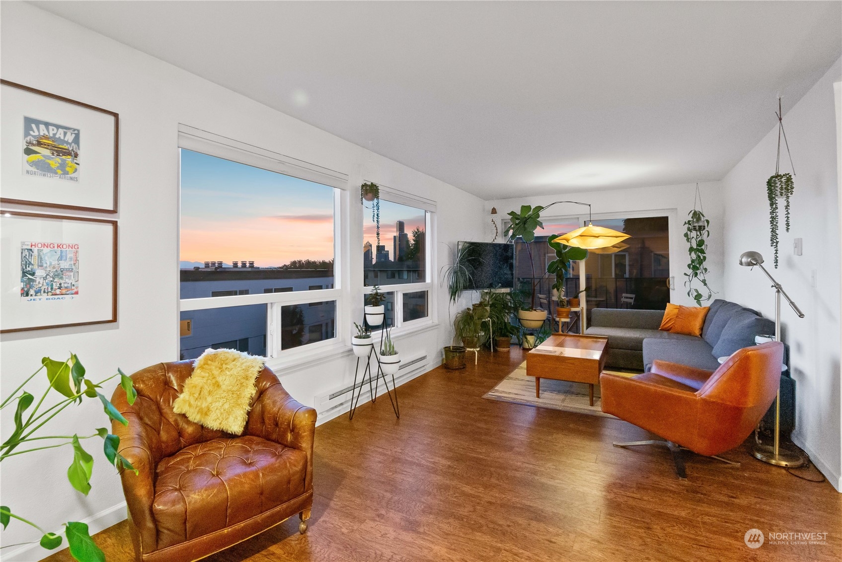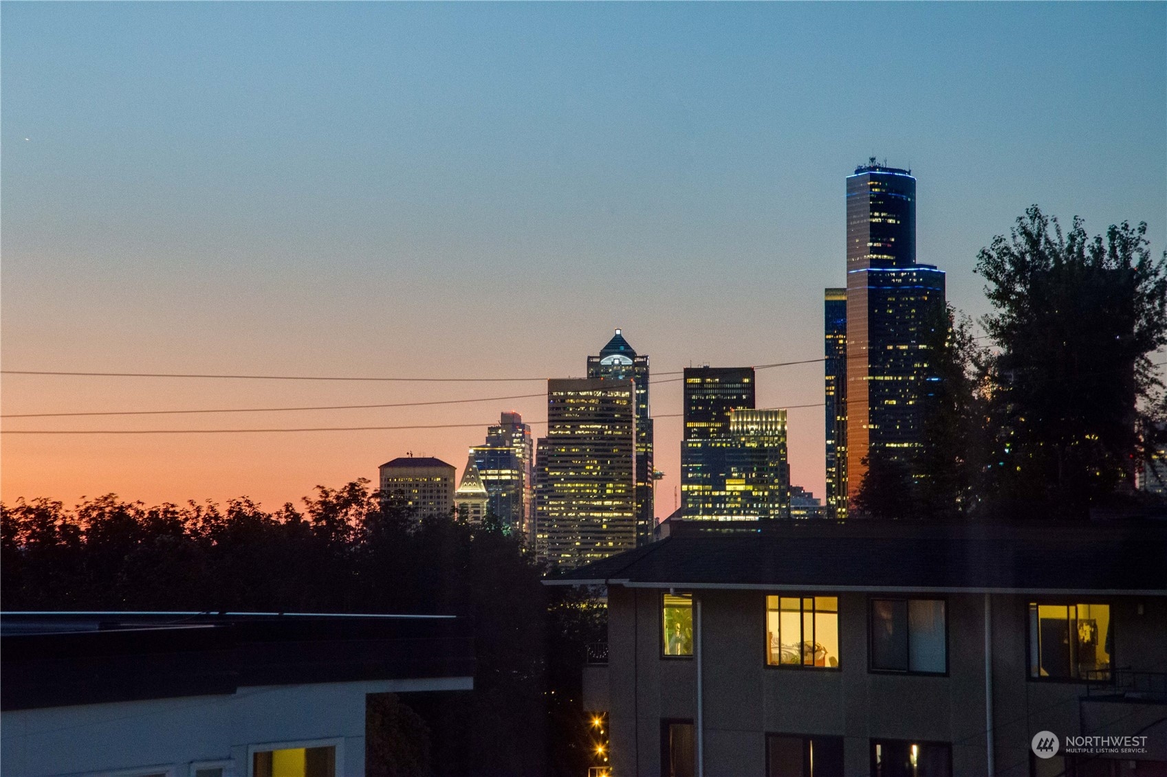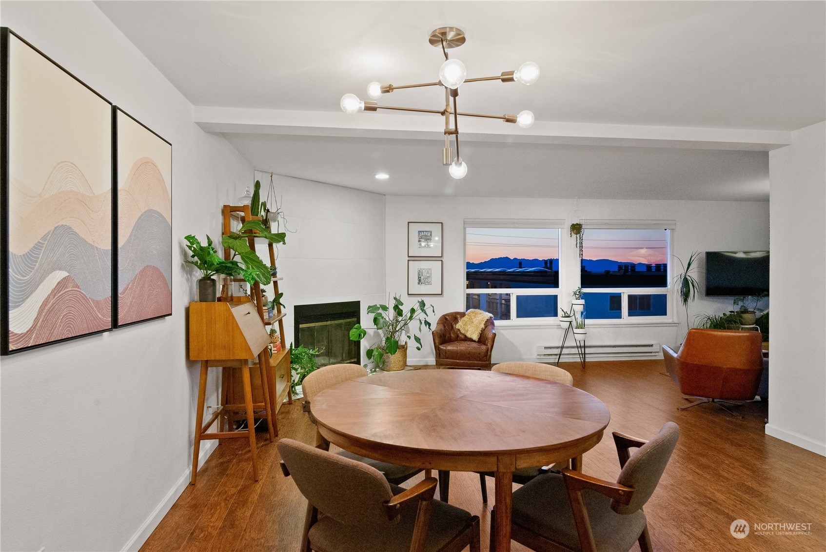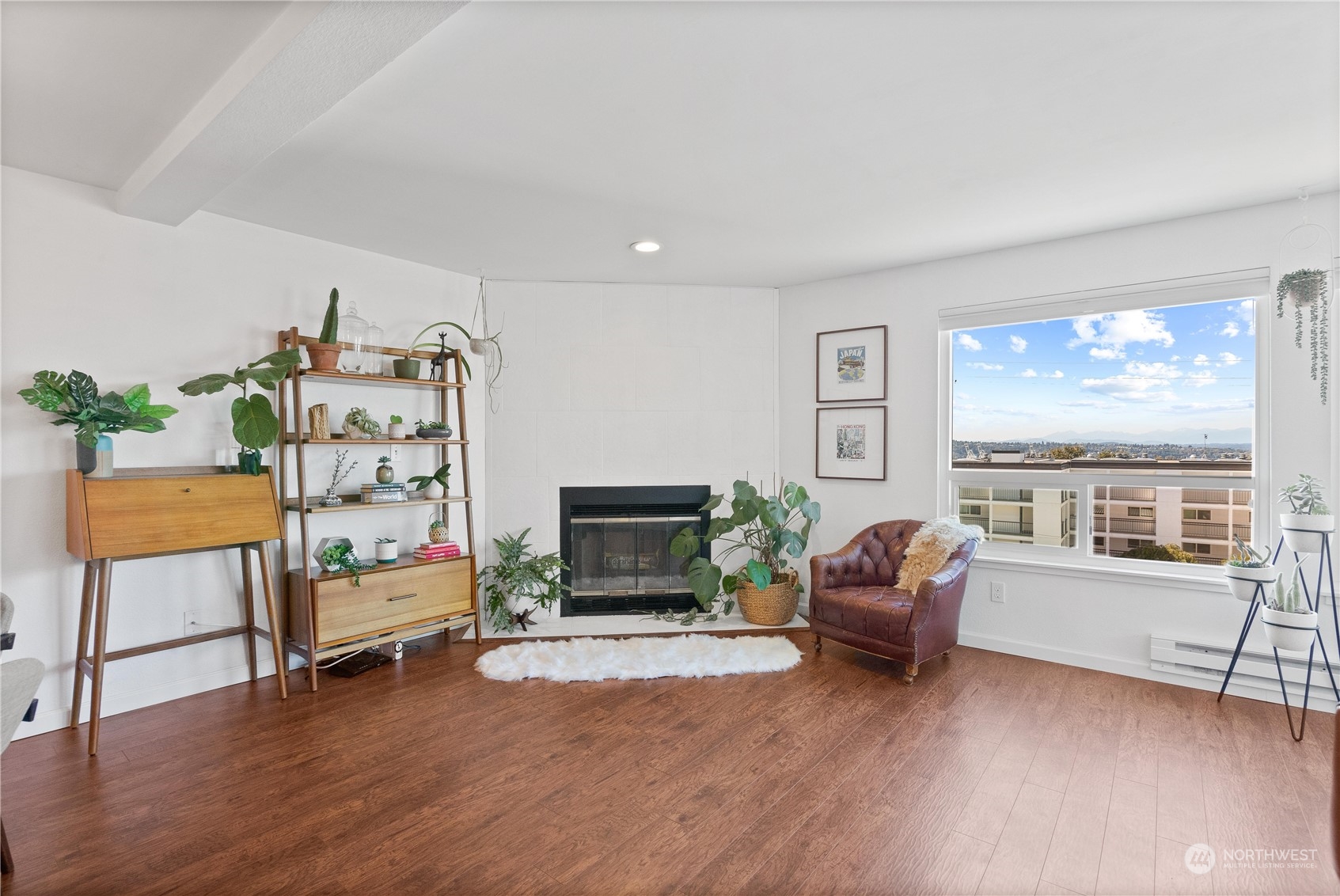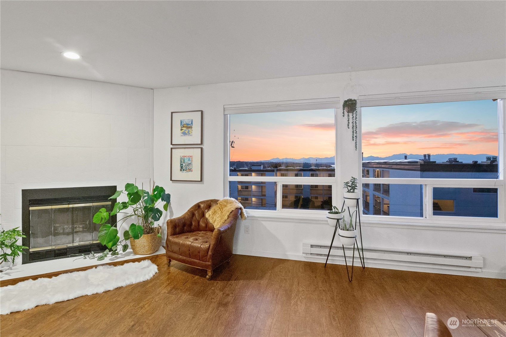 Feel the cozy wood-burning fireplace while basking in sunset glows silhouetted against the visible Olympic mountaintops! Light-filled, ultra-spacious corner end unit w/ gorgeous views of the Olympic mountains, stadium fireworks, downtown skyscrapers, peekaboo Puget Sound waters + Space Needle. Open concept living/dining, updated kitchen+baths, off-street indoor garage parking space (rare!), guest parking, laundry room, patio, storage unit, shared rec room. Desirable location: minutes drive access to I-5, I-90, bus lines 36 + 60; walk to International District, SODO, stadiums, neighborhood parks. Friendly, respectful HOA community, no rental cap, low dues, exterior/deck renovation upcoming. A must-see, unique gem in the city.