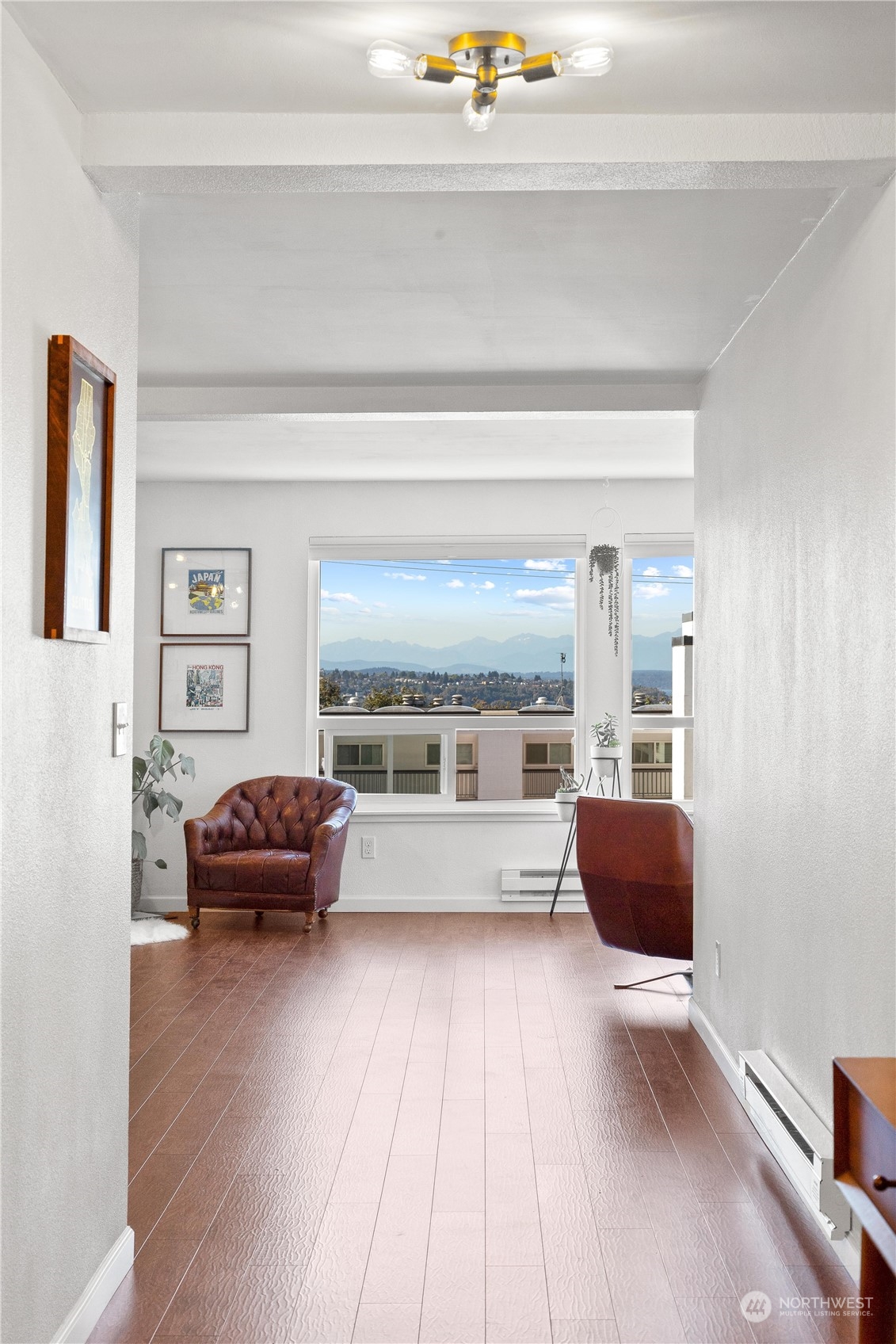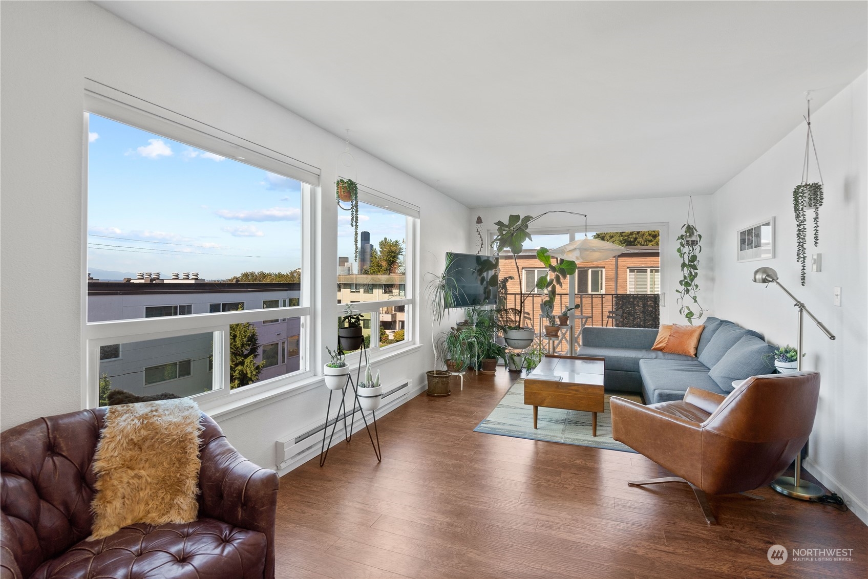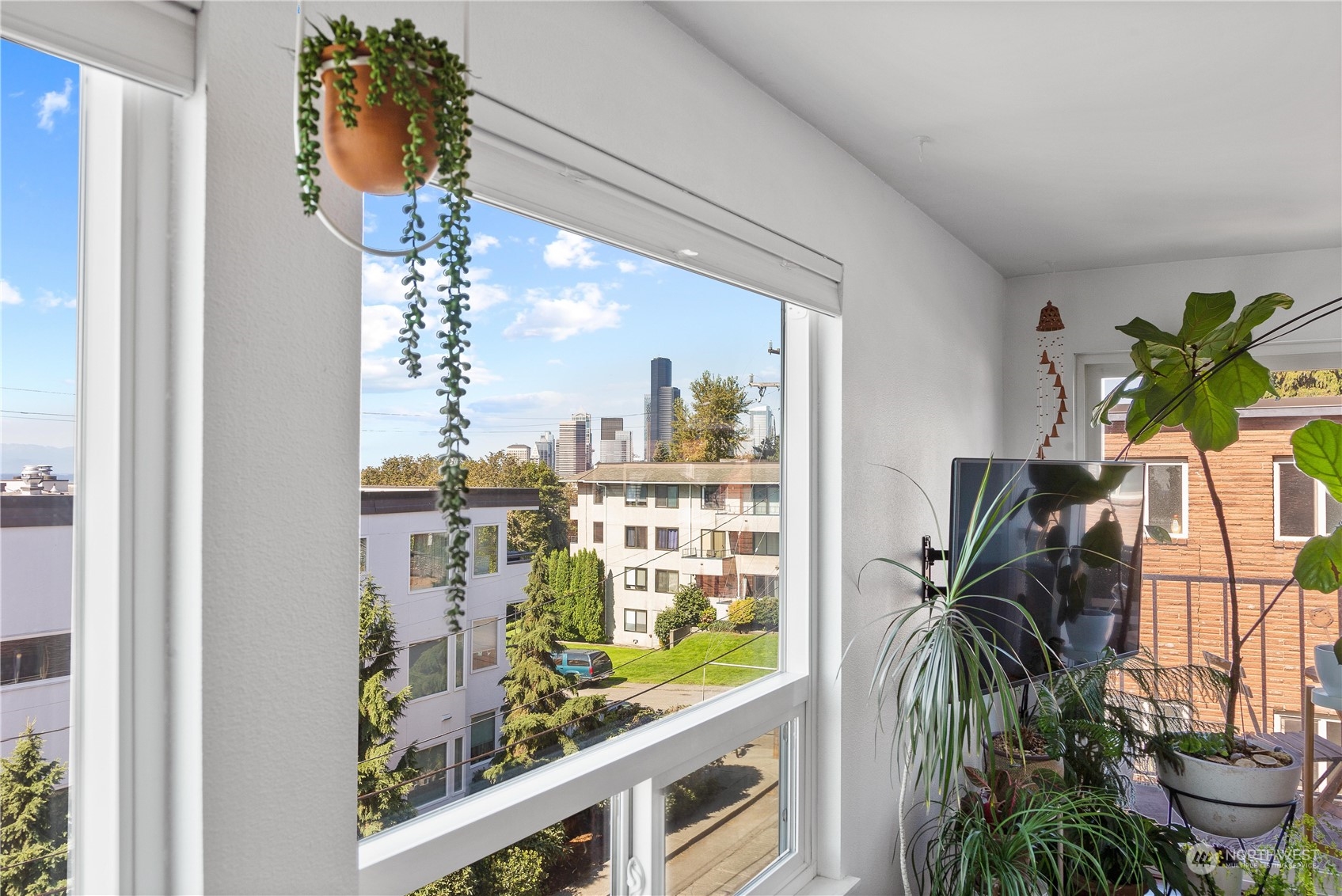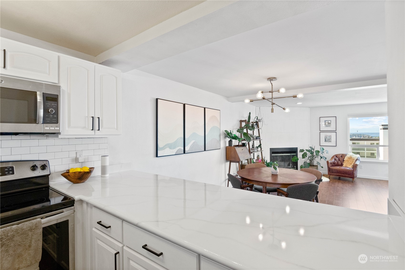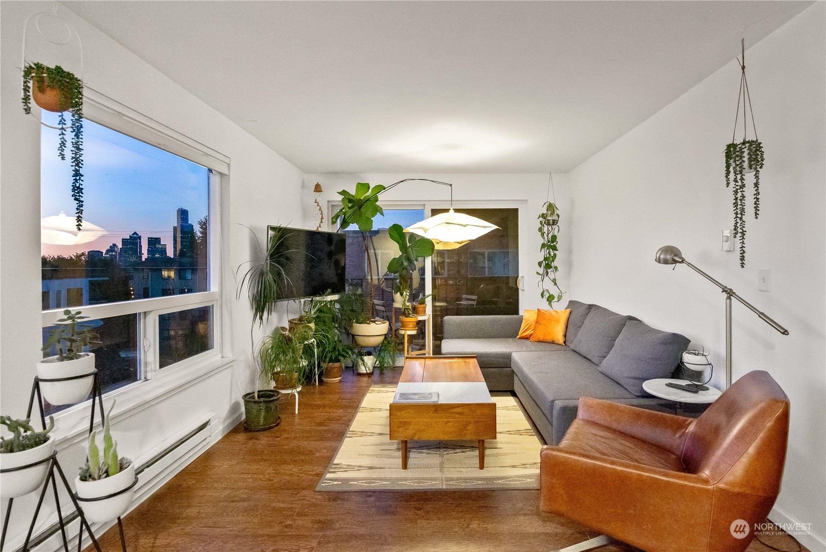 Feel the cozy wood-burning fireplace while basking in sunset glows silhouetted against the visible Olympic mountaintops! Light-filled, ultra-spacious corner end unit w/ gorgeous views of the Olympic mountains, stadium fireworks, downtown skyscrapers, peekaboo Puget Sound waters + Space Needle. Open concept living/dining, updated kitchen+baths, off-street indoor garage parking space (rare!), guest parking, laundry room, patio, storage unit, shared rec room. Desirable location: minutes drive access to I-5, I-90, bus lines 36 + 60; walk to International District, SODO, stadiums, neighborhood parks. Friendly, respectful HOA community, no rental cap, low dues, exterior/deck renovation upcoming. A must-see, unique gem in the city.