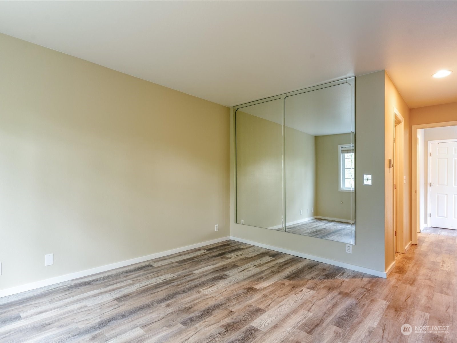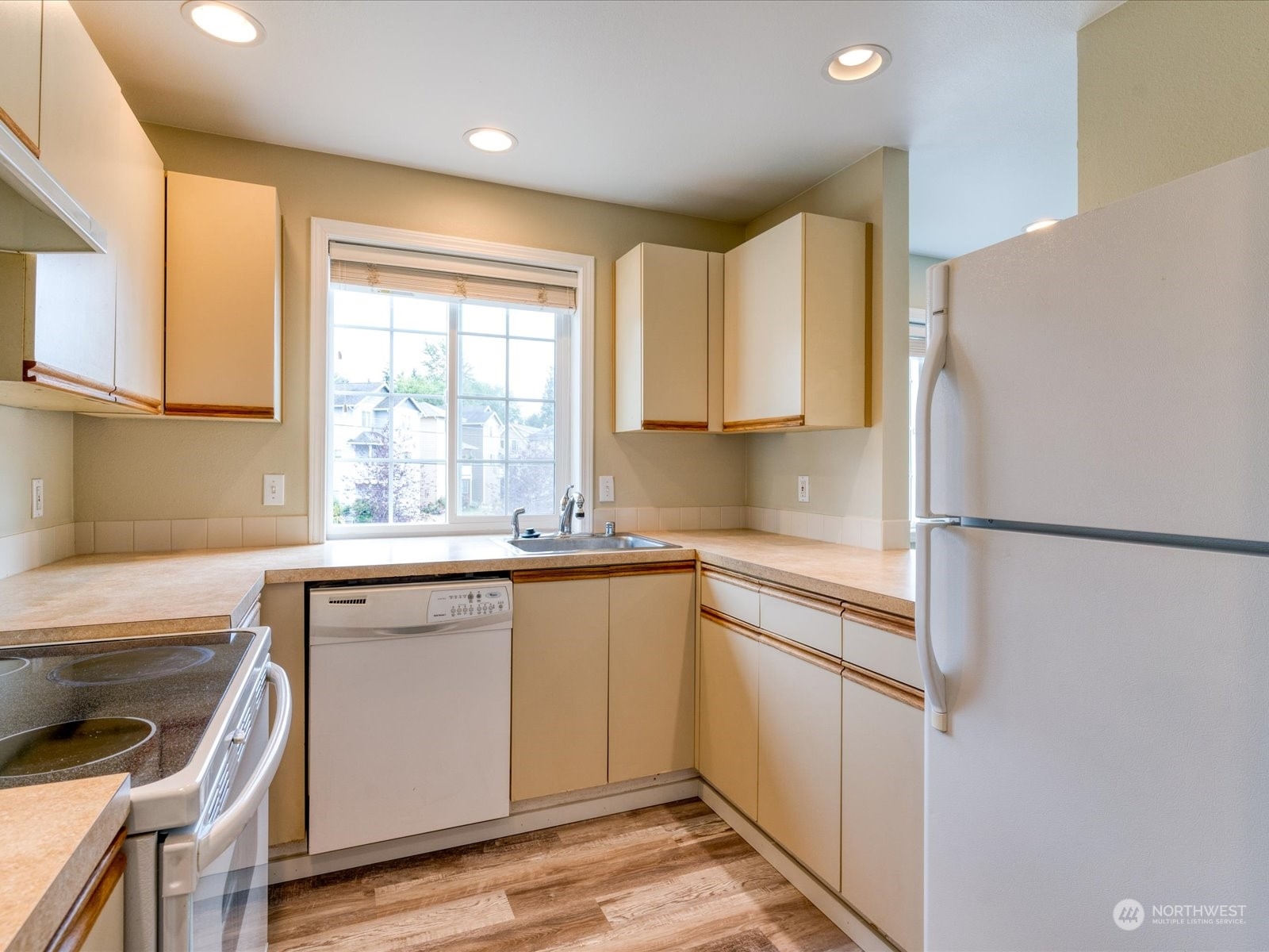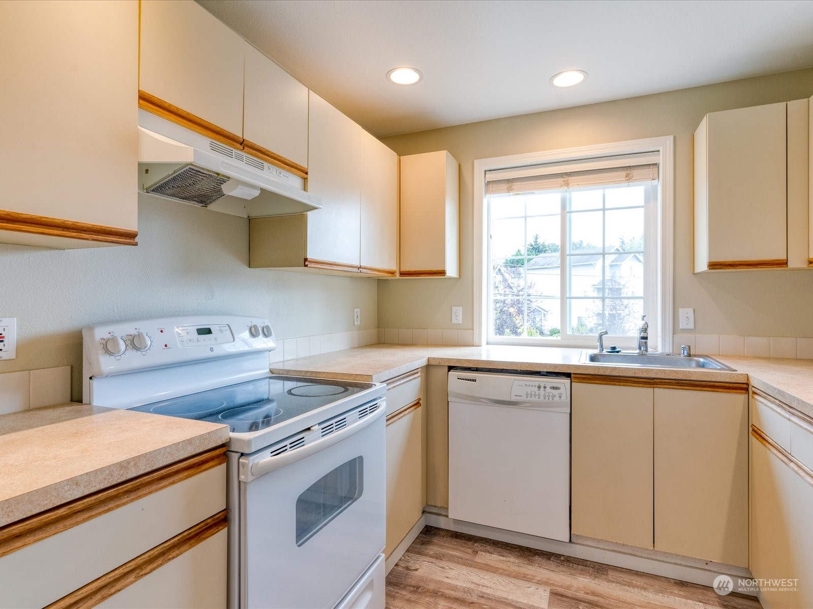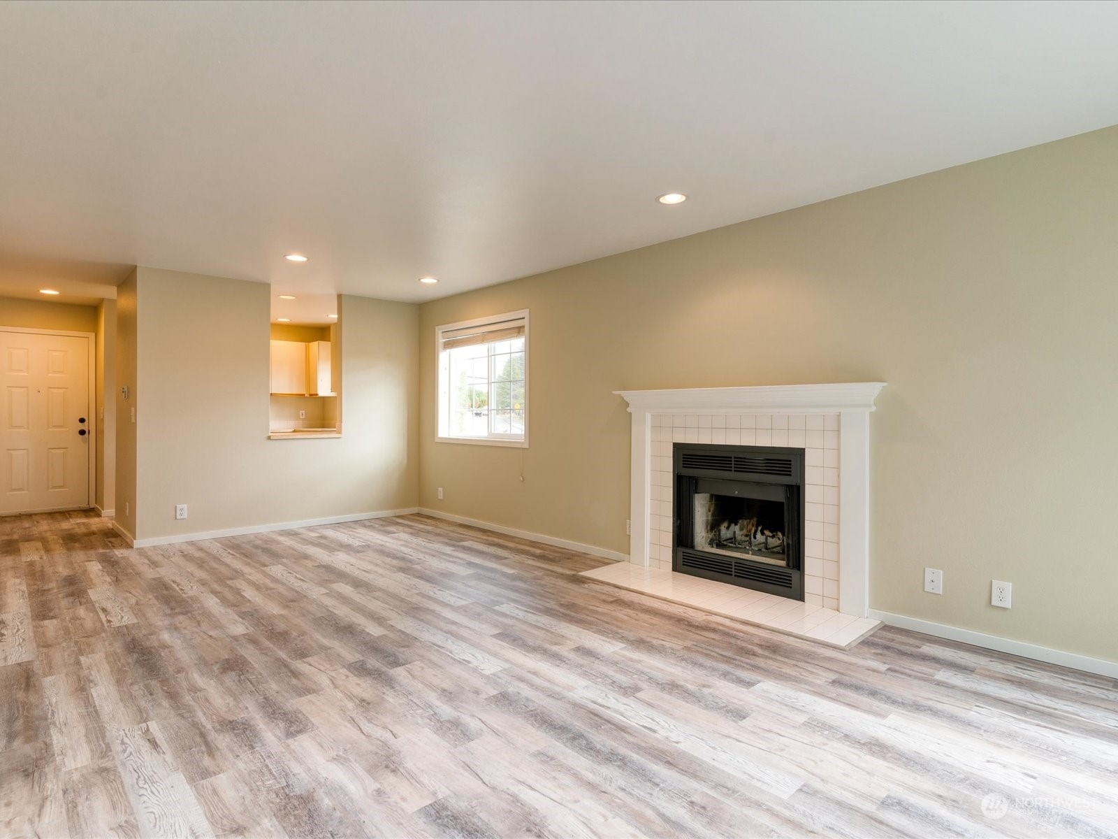 Freshly updated top floor corner unit with only one shared wall. New laminate hardwoods, paint, and trim throughout makes this place shine. The SW natural light makes it bright and the best location in the complex. There is green space below and easy access to I5 and Hwy 99.
