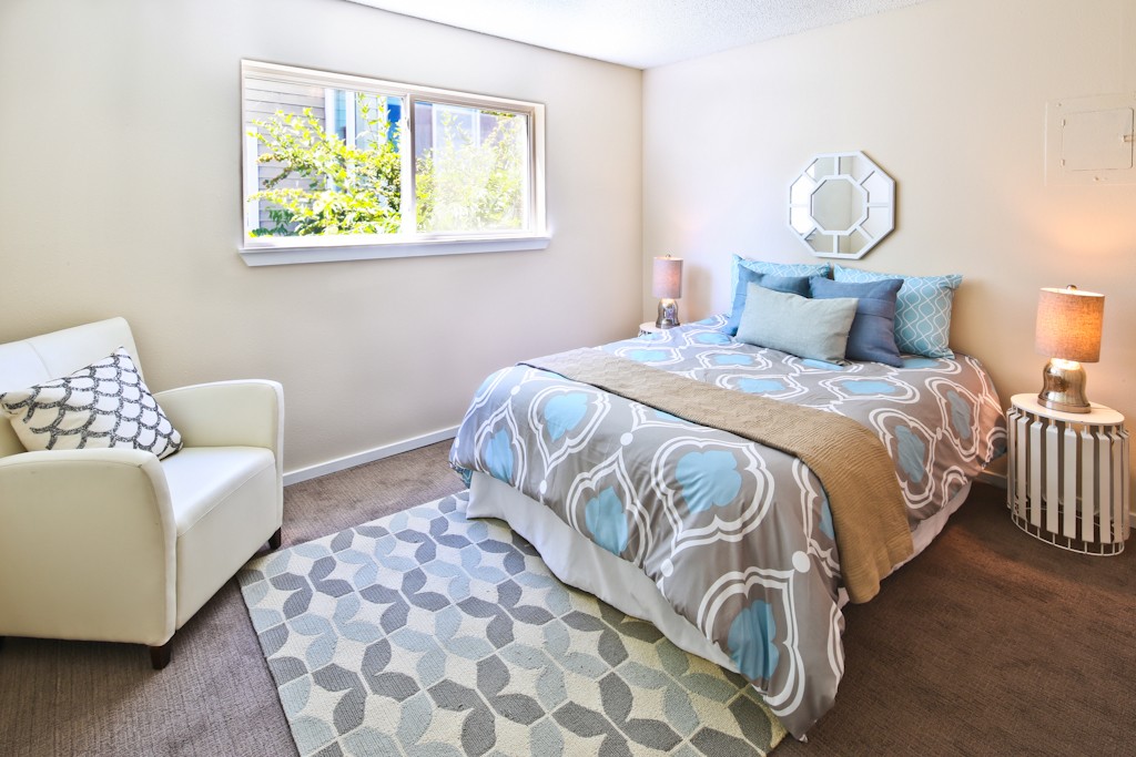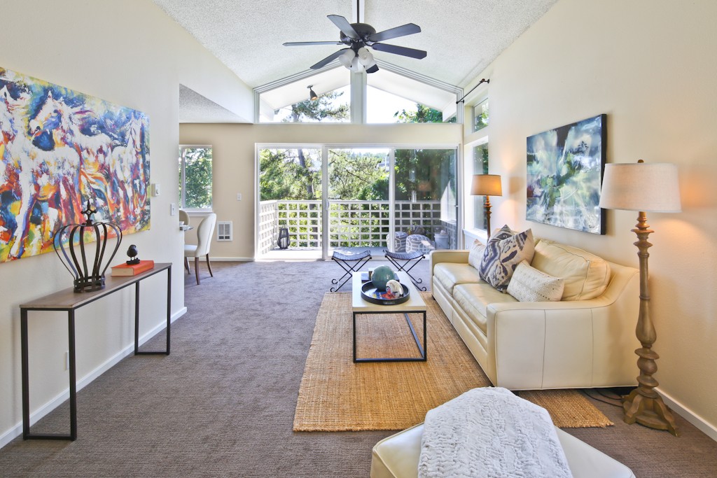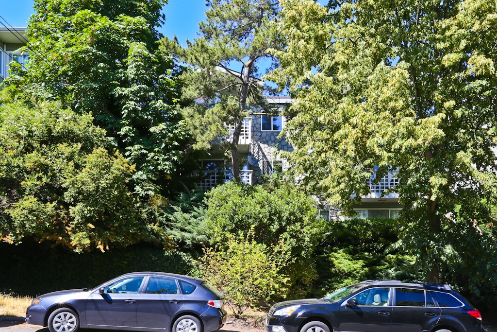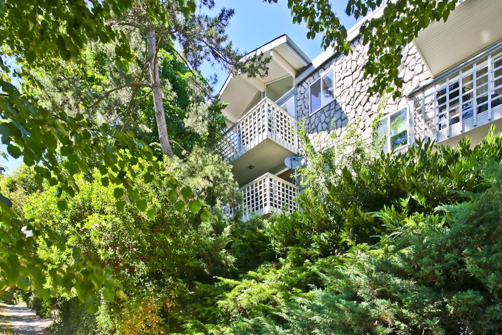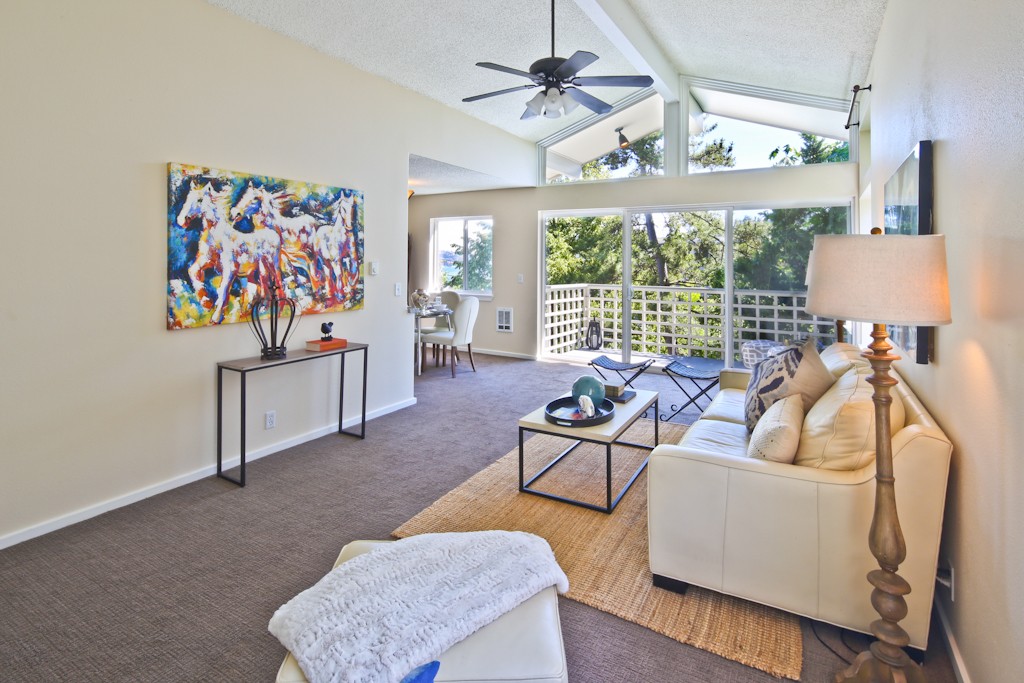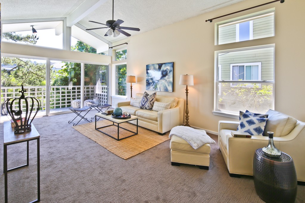 Top Floor in Fremont!! Highly desireable location with soaring, vaulted ceilings & light filled rooms opening to views of N. Lake Union, Mt. Rainier & downtown Seattle. Peaceful neighborhood with easy access to the heart of Fremont & Sunday Market, Queen Anne, the U. District & Greenlake. This unit lives large with 2 bedrooms, 1 bath, large living & dining spaces & plenty of room to entertain. Add to that great views of the Duck Dodge, BBQ's & relaxation on the spacious deck - A Gem in Fremont!