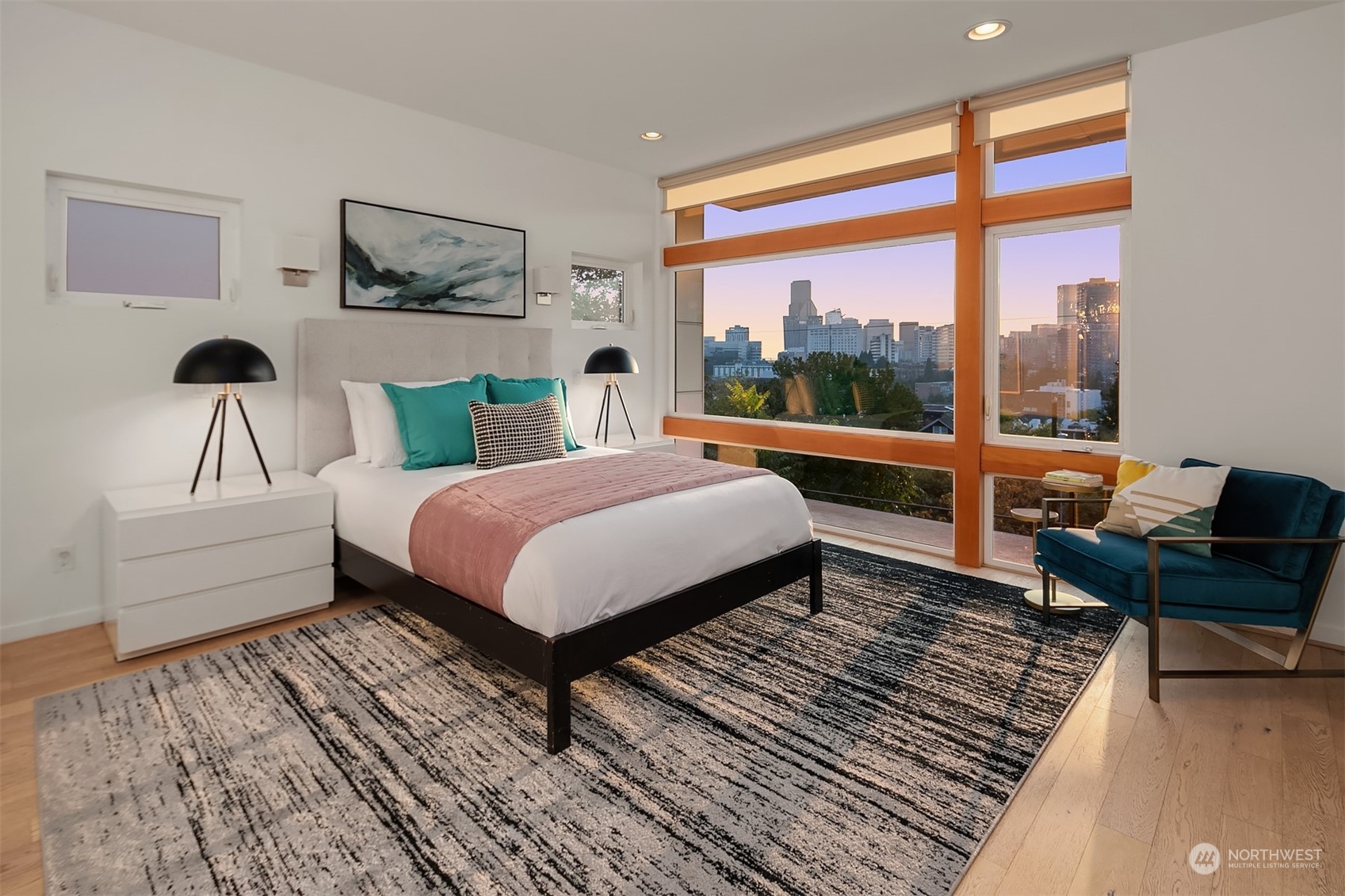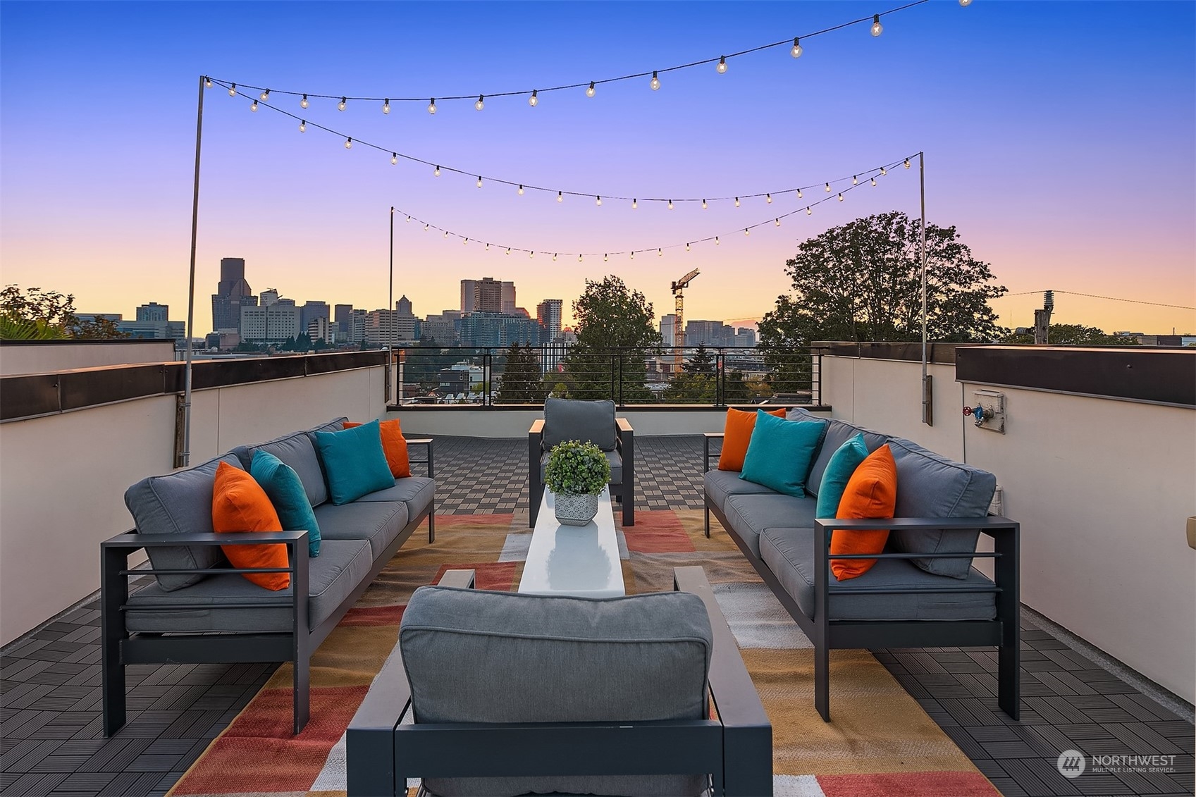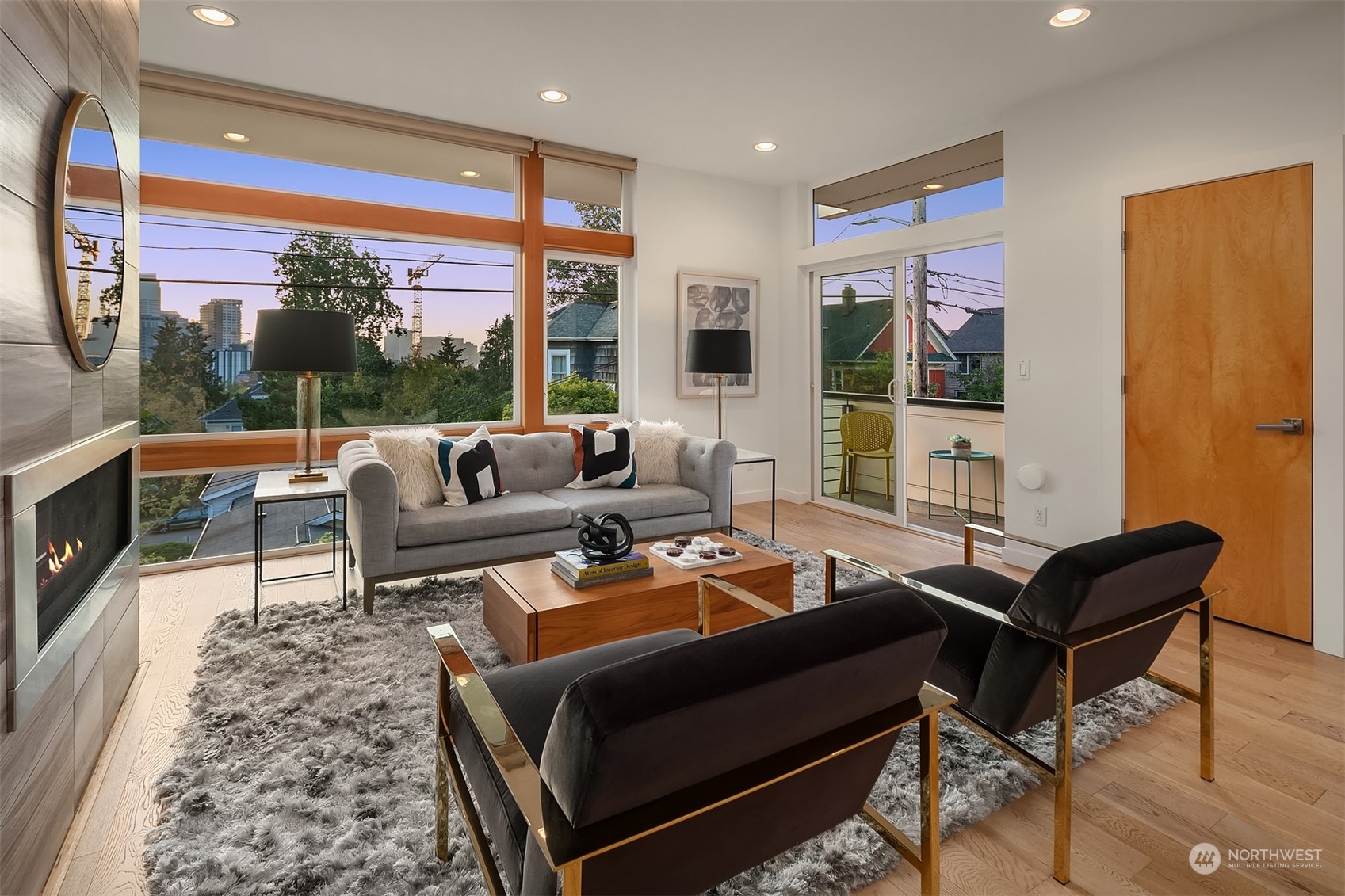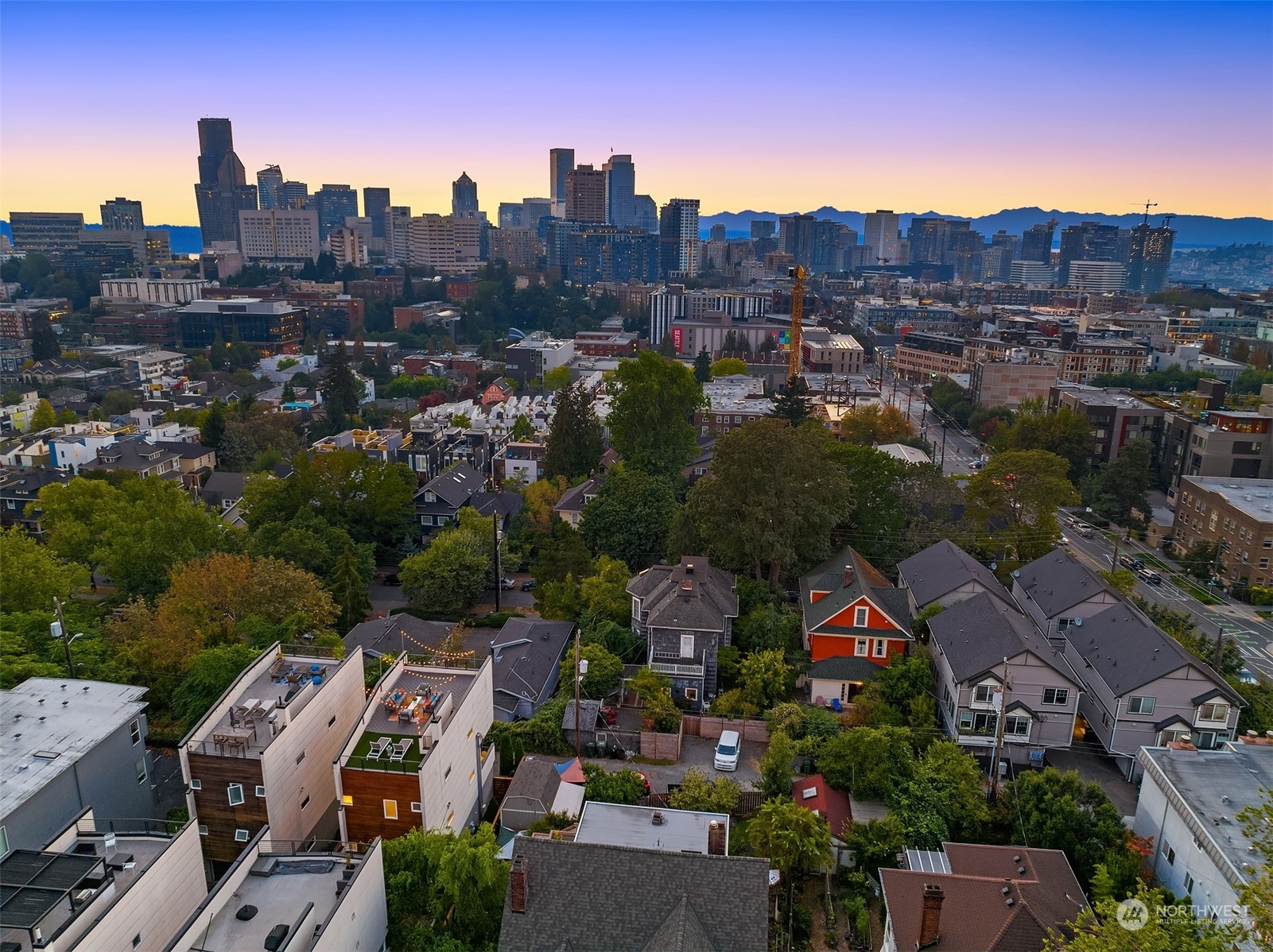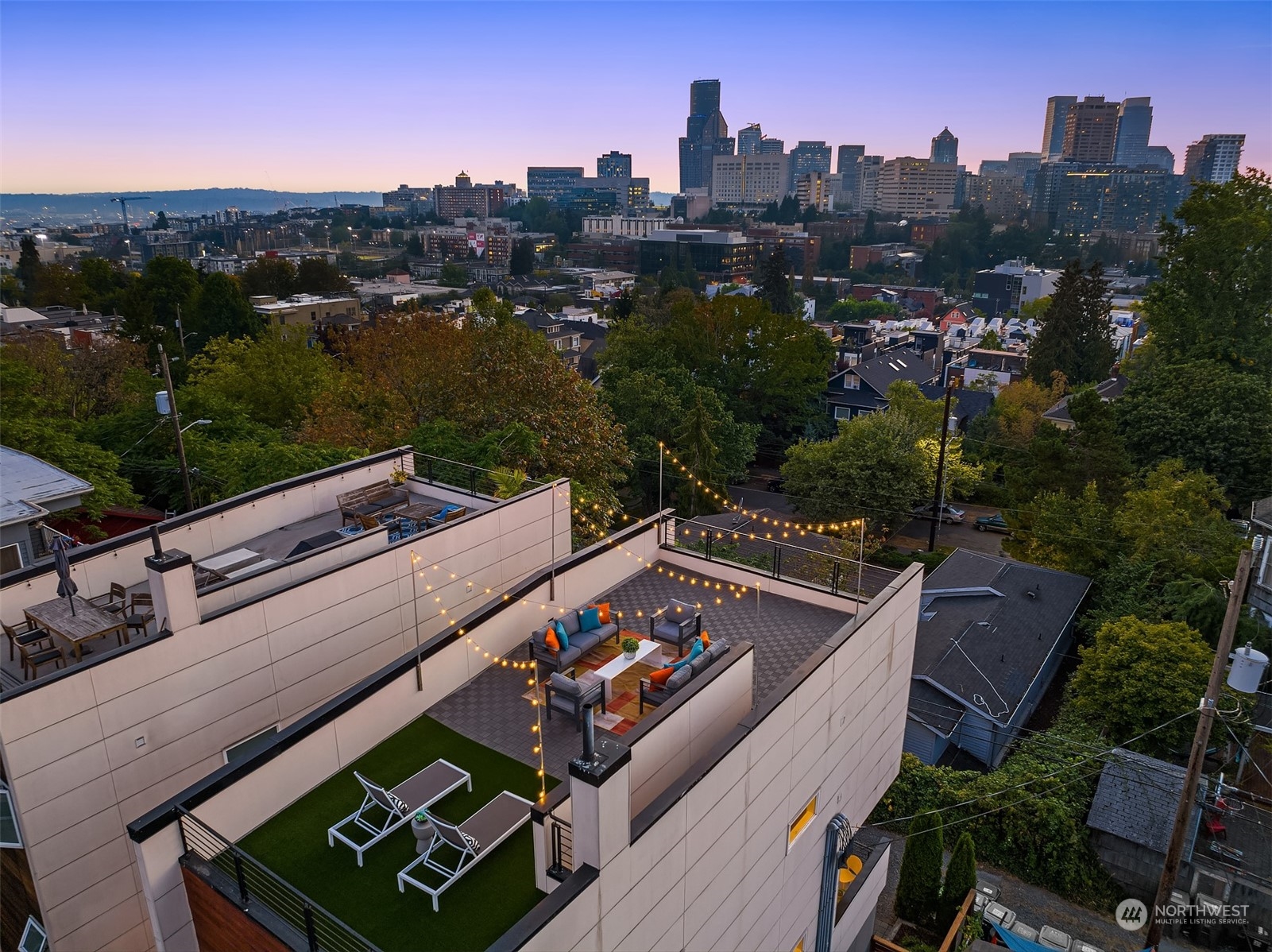 Private rooftop deck captures majestic skyline + mountain views in this modern home nestled between Capitol Hill & Central District. Natural light cascades thru walls of windows and fills open-concept layout. Discerning urbanites will appreciate thoughtful 3-level layout + contemporary design. Spacious main level boasts high ceilings and distinctive fireplace + separate dining area. Chef’s kitchen with high-end appliances, chic cabinetry and large island. Primary suite features walk-in closet + spa-like bath with dual-sink vanity and rain shower. Lower-level bonus room with ensuite bath can be ideal guest suite or home office. Attached garage + rare additional off-street parking, and abundant storage throughout. No HOA dues.
