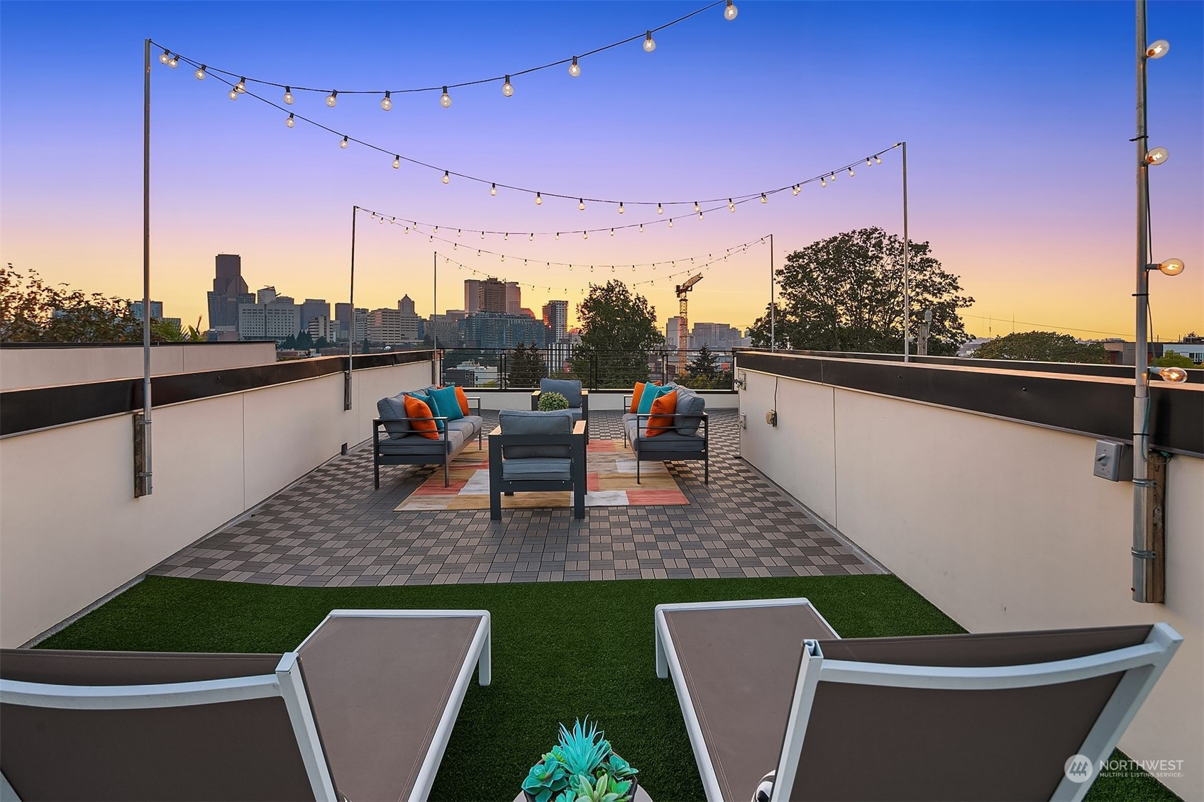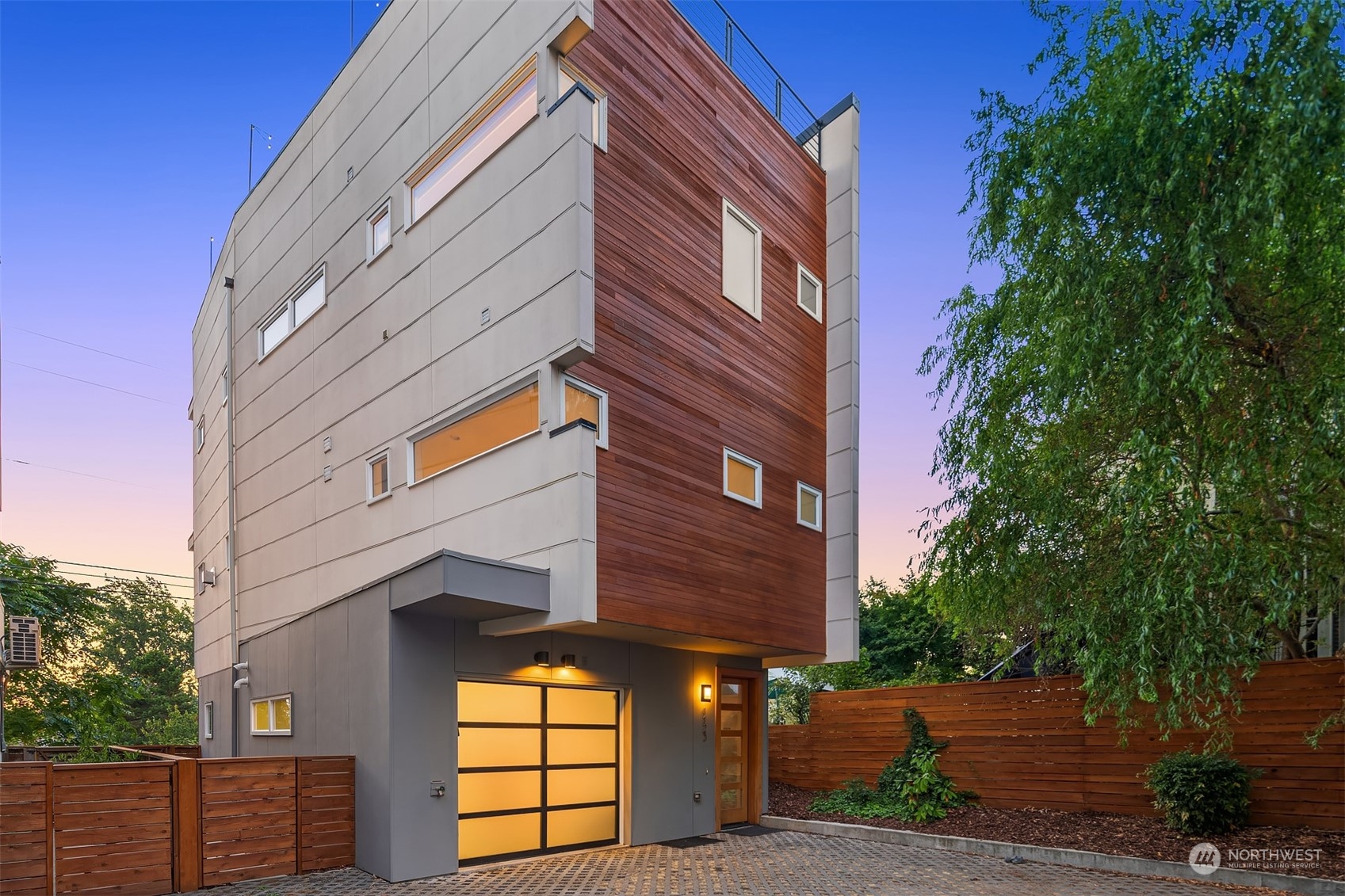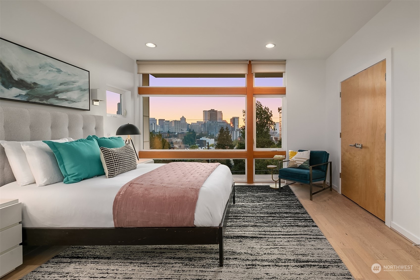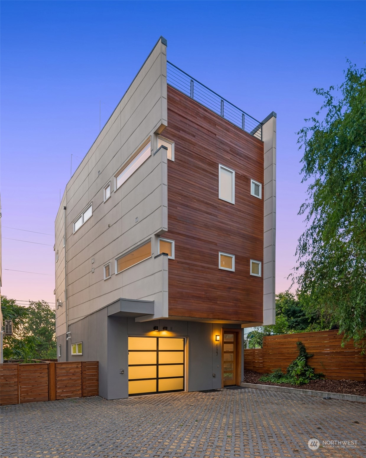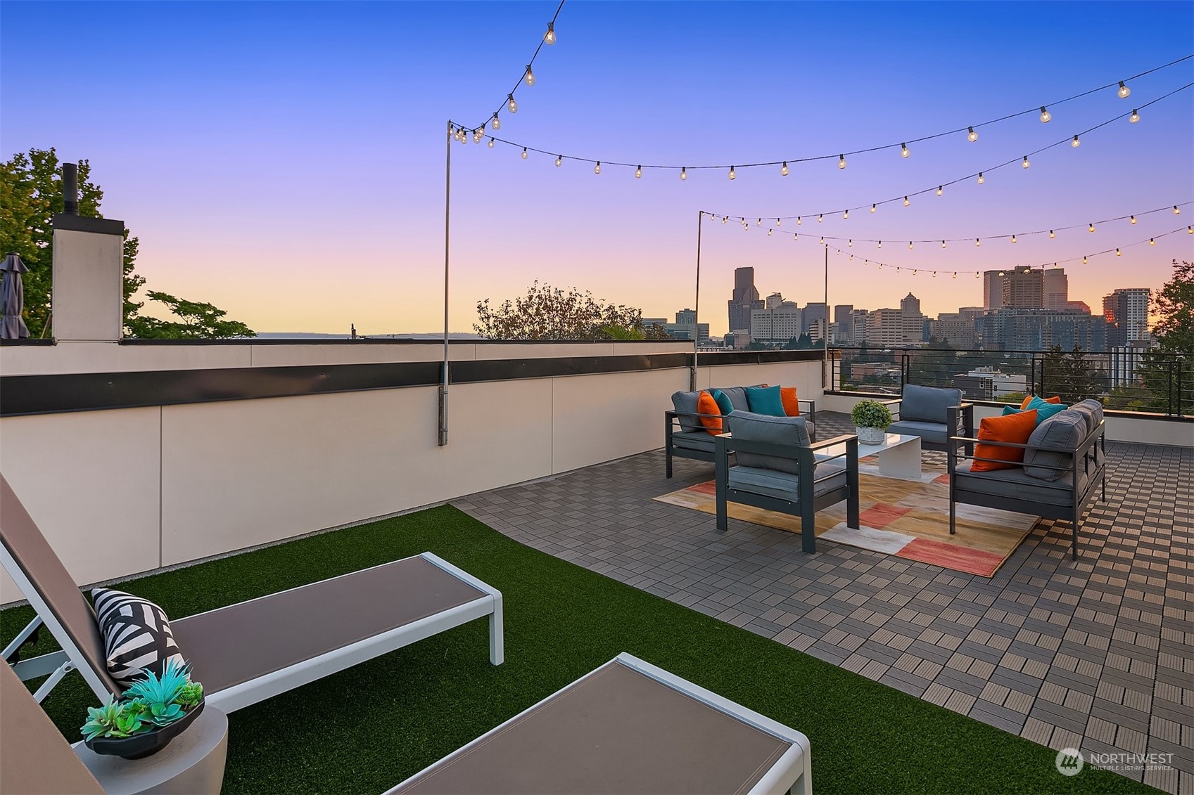 Private rooftop deck captures majestic skyline + mountain views in this modern home nestled between Capitol Hill & Central District. Natural light cascades thru walls of windows and fills open-concept layout. Discerning urbanites will appreciate thoughtful 3-level layout + contemporary design. Spacious main level boasts high ceilings and distinctive fireplace + separate dining area. Chef’s kitchen with high-end appliances, chic cabinetry and large island. Primary suite features walk-in closet + spa-like bath with dual-sink vanity and rain shower. Lower-level bonus room with ensuite bath can be ideal guest suite or home office. Attached garage + rare additional off-street parking, and abundant storage throughout. No HOA dues.