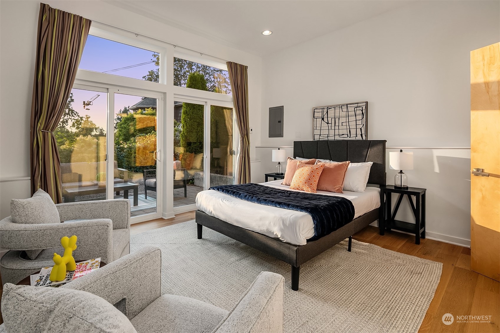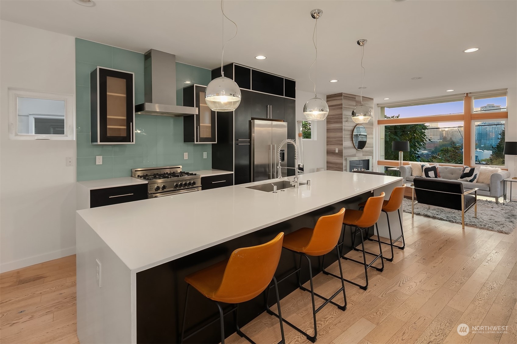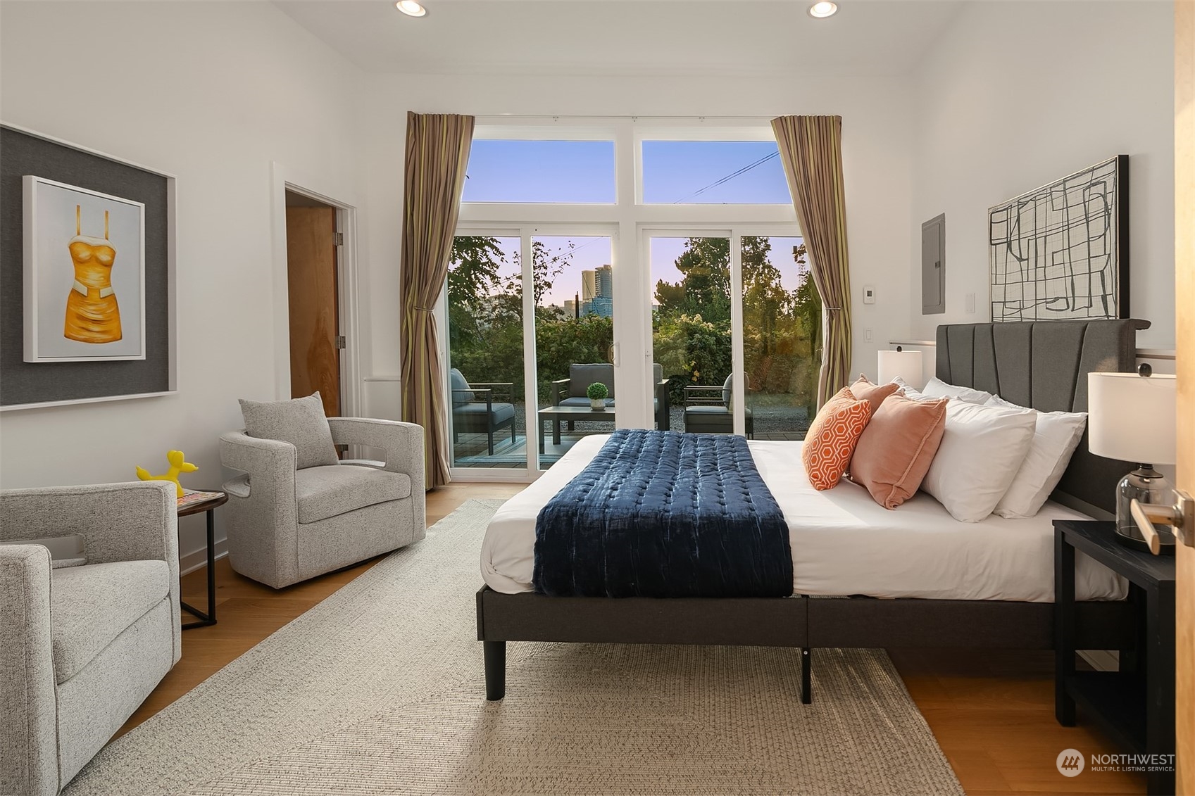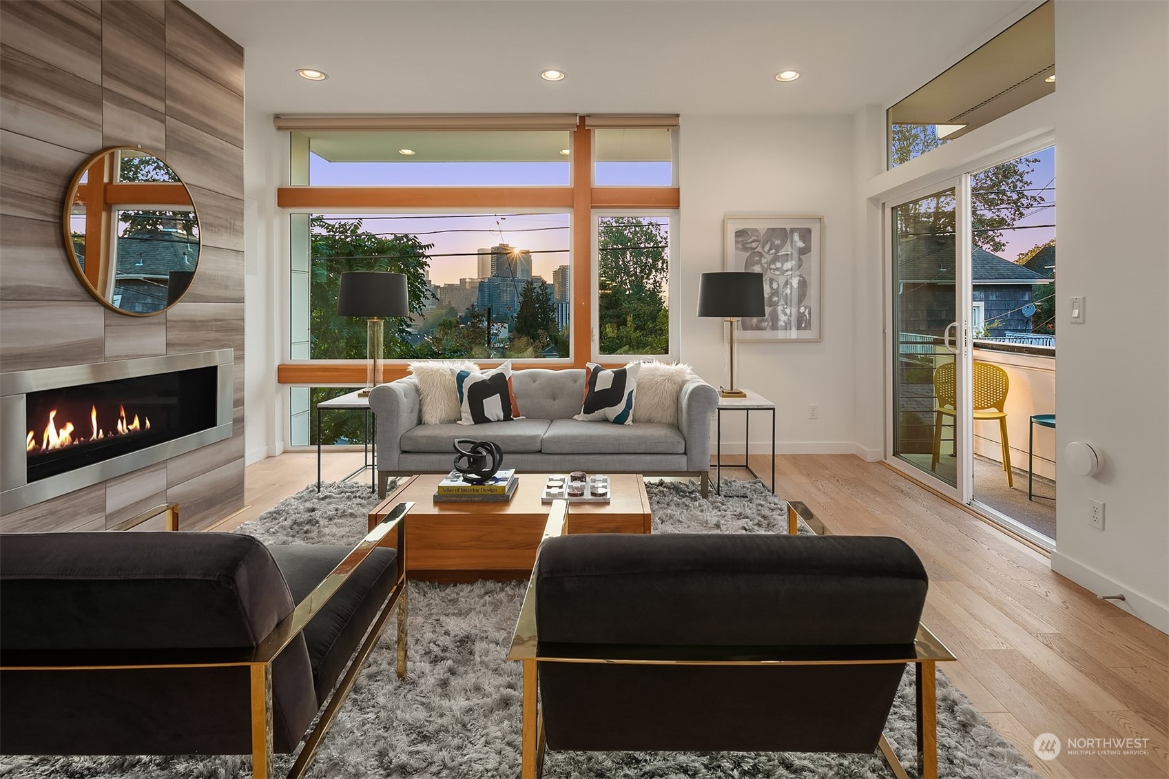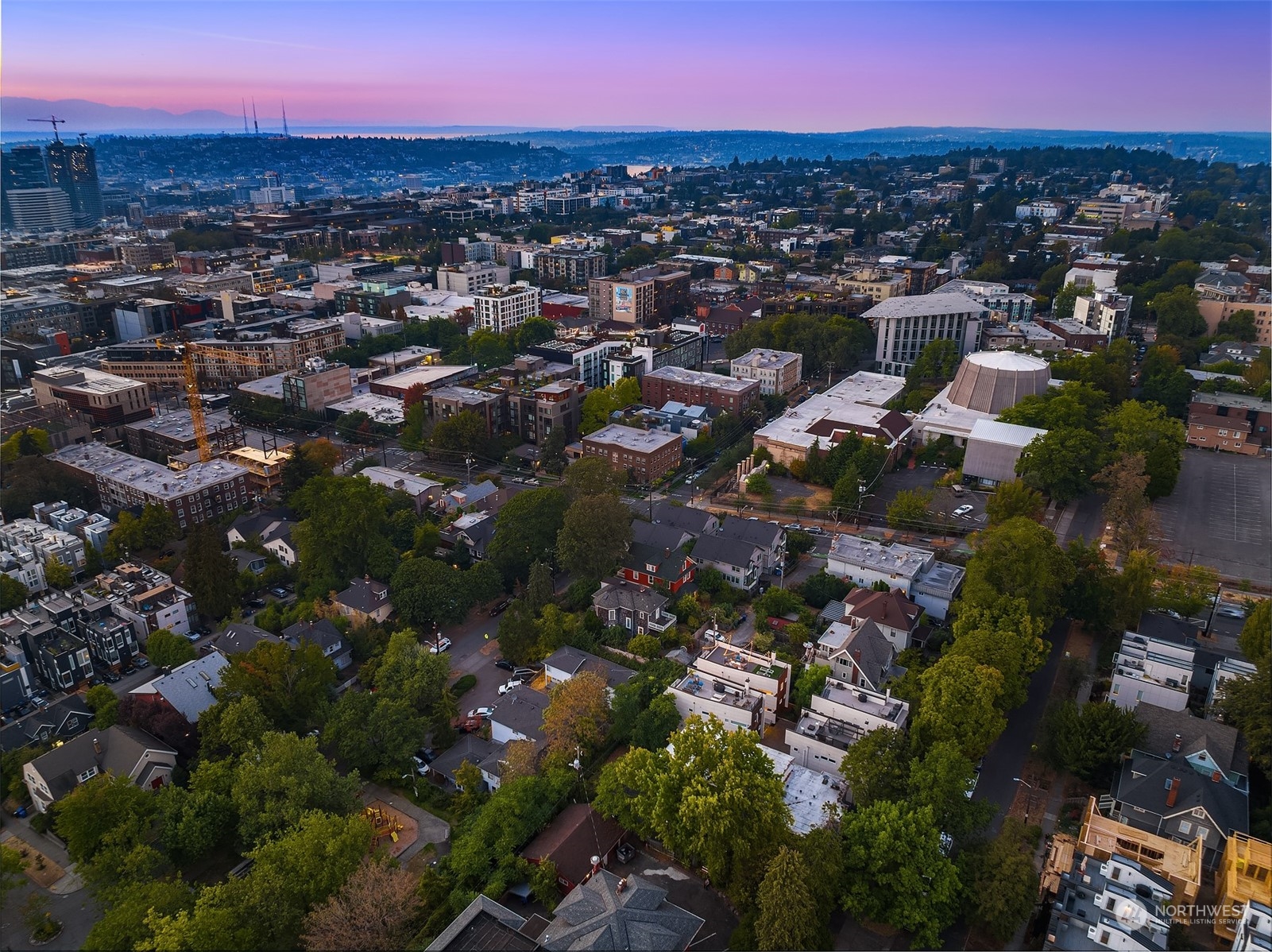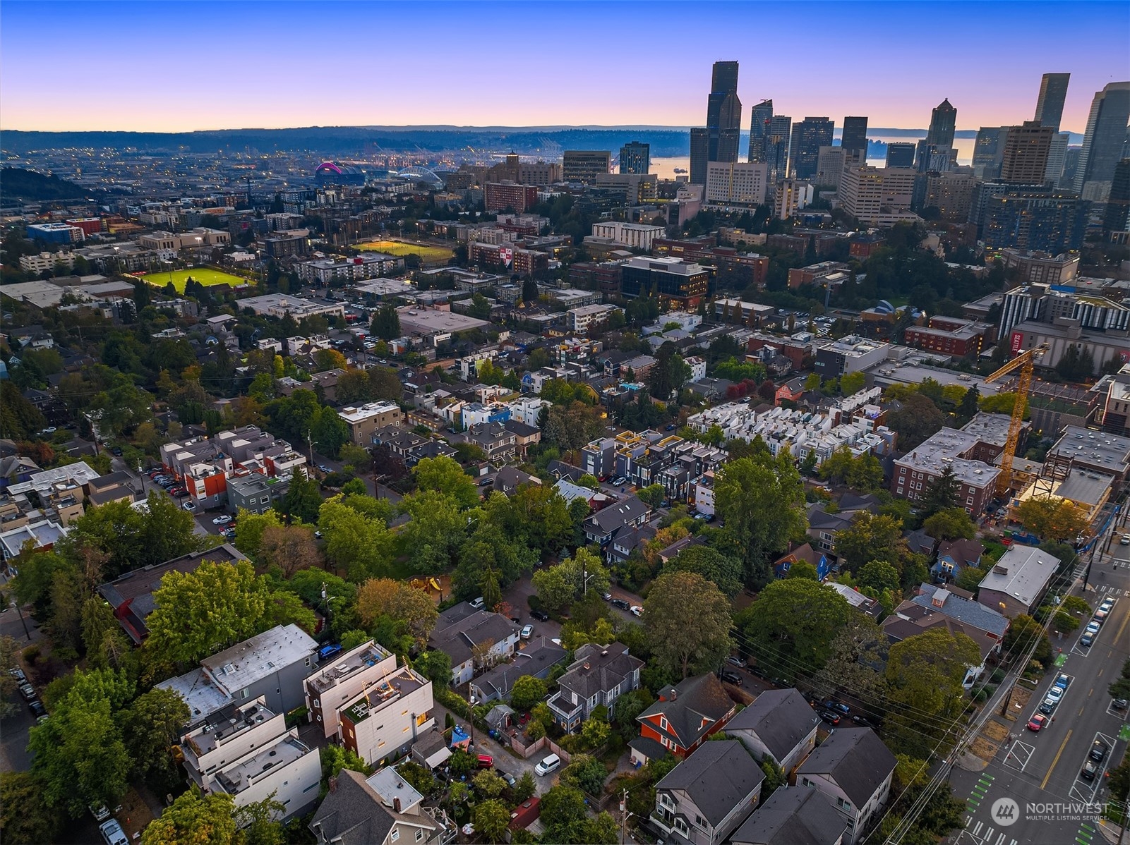 Private rooftop deck captures majestic skyline + mountain views in this modern home nestled between Capitol Hill & Central District. Natural light cascades thru walls of windows and fills open-concept layout. Discerning urbanites will appreciate thoughtful 3-level layout + contemporary design. Spacious main level boasts high ceilings and distinctive fireplace + separate dining area. Chef’s kitchen with high-end appliances, chic cabinetry and large island. Primary suite features walk-in closet + spa-like bath with dual-sink vanity and rain shower. Lower-level bonus room with ensuite bath can be ideal guest suite or home office. Attached garage + rare additional off-street parking, and abundant storage throughout. No HOA dues.