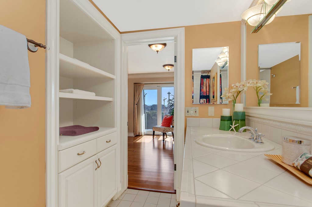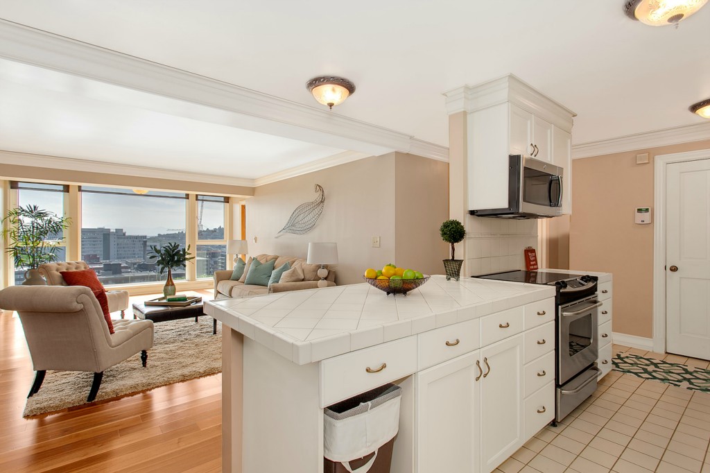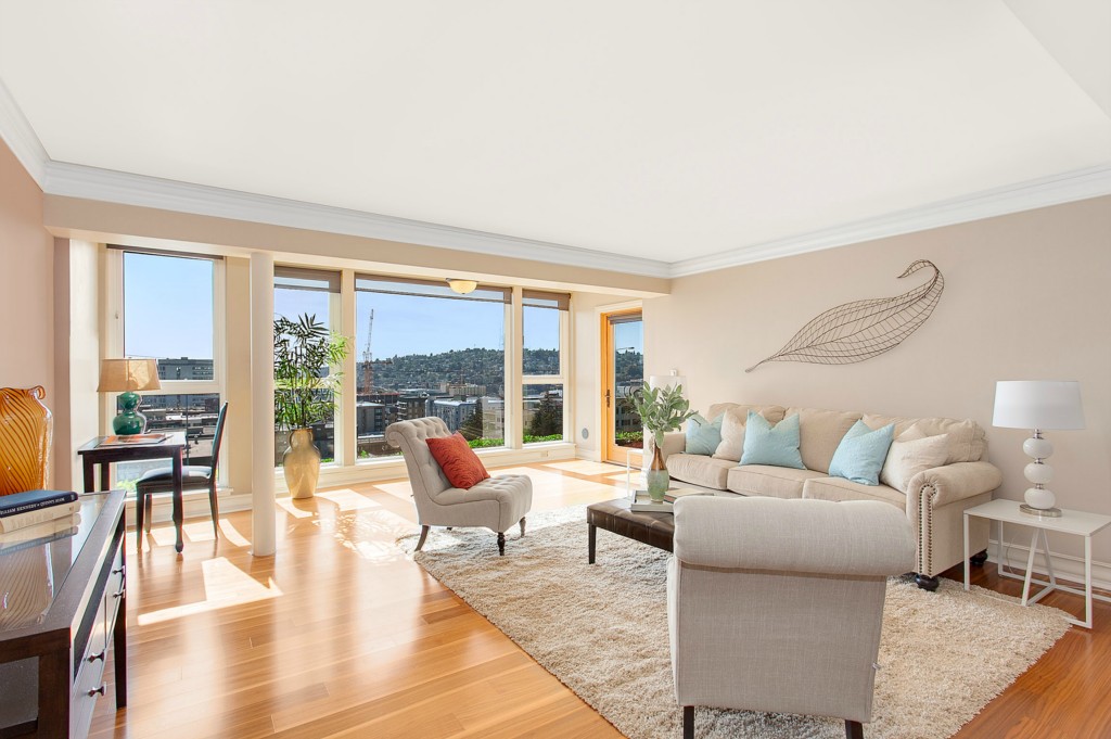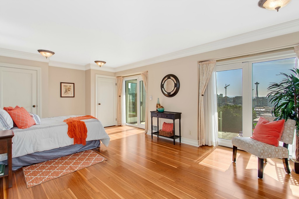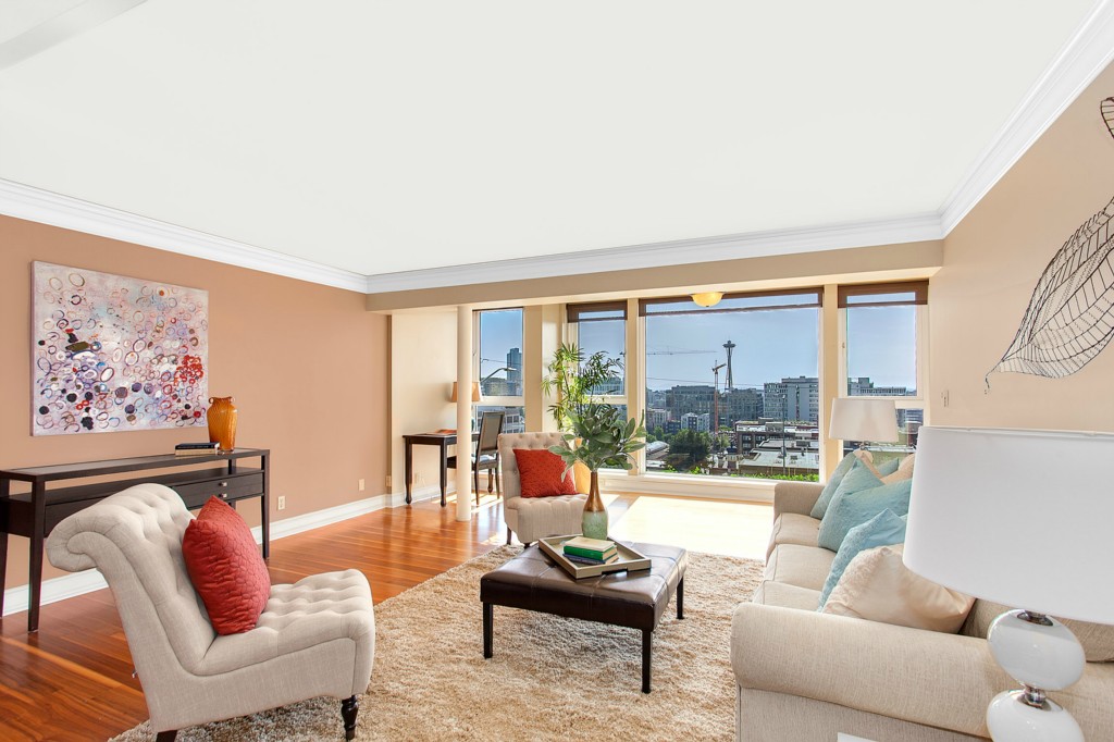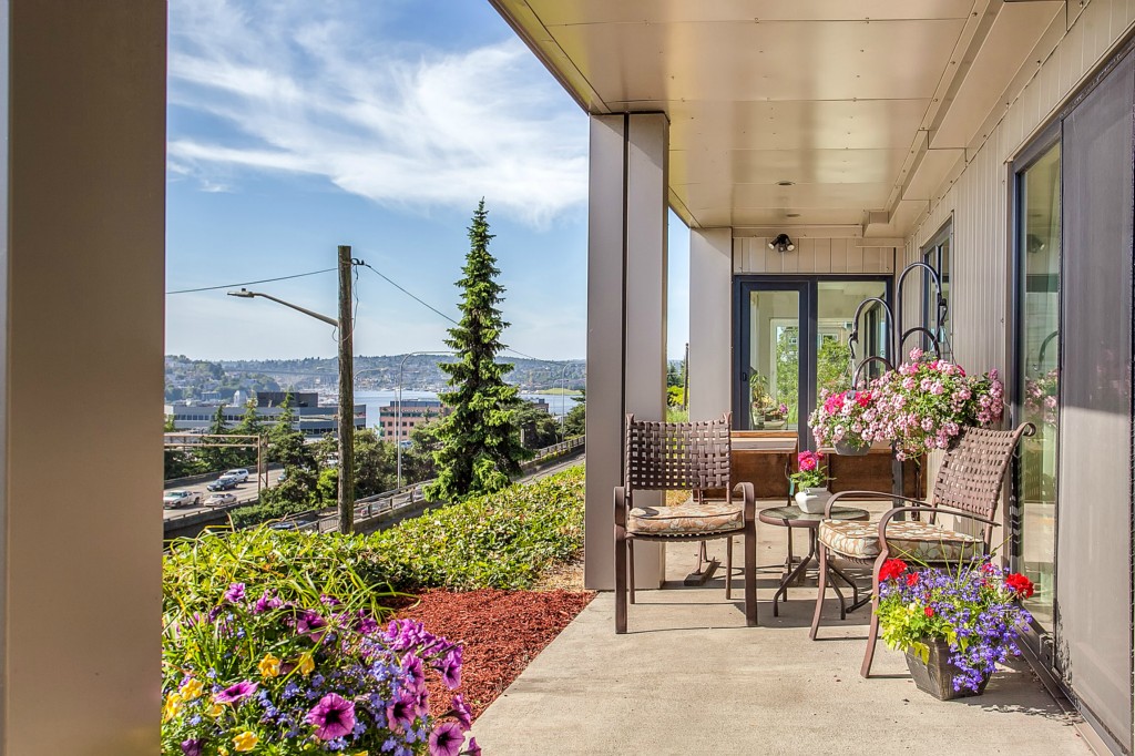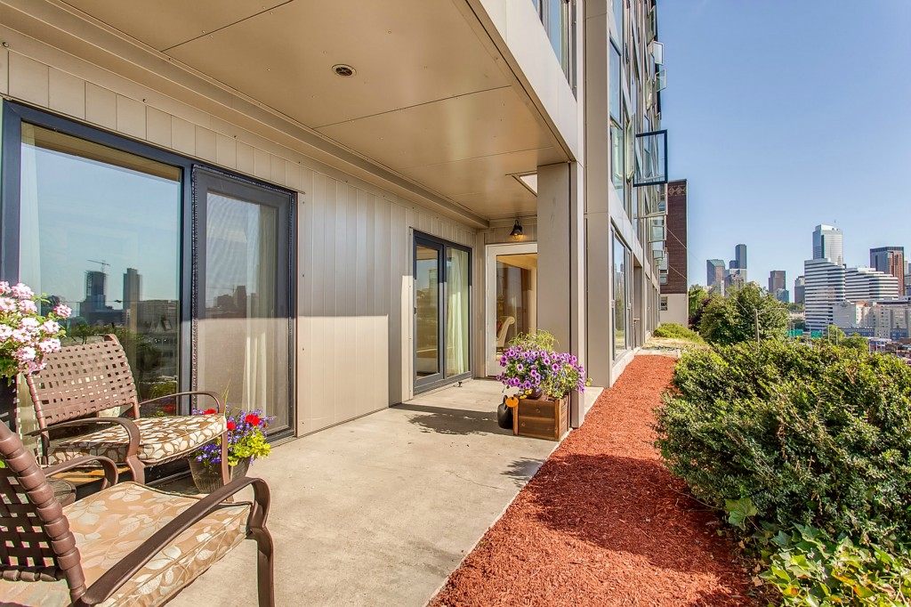 Immaculately updated Capitol Hill condo with sweeping views of downtown, Lk Union & Olympics. Formerly a 2 bdrm, this unit was redesigned into a one-of-a-kind 1 bdrm master suite w/ private garden veranda. Real walnut floors, imported tile countertops, custom closets, new appliances, air conditioning, jetted tub & more. Covered parking included. Central Capitol Hill location is perfect for easy downtown & SLU commutes. 94 Walk Score means the abundant shops & restaurants are just minutes away.