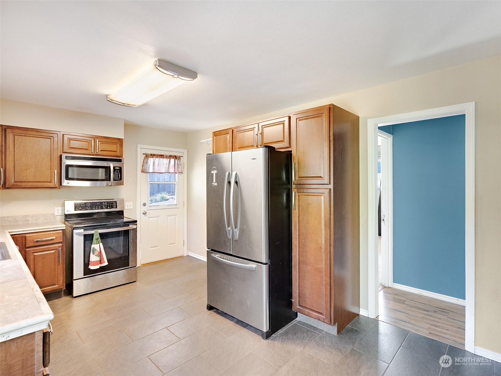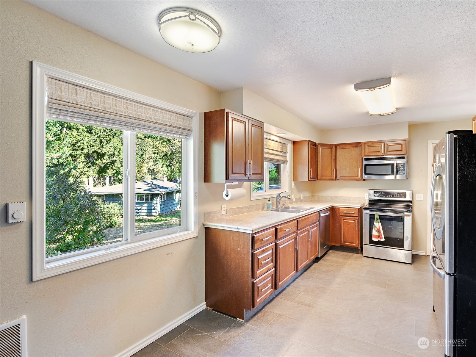 Spacious 4 bedroom, 2 bath home on almost 1/3 acre! Kitchen has updated cabinetry, stainless appliances and tile flooring. Living room (on main) with laminate floors and lots of light. Lower level w/ 2 additional living/flex spaces, laundry room, 2 bedrooms and full bath. See recent measurement for the full floor plan. Enjoy coffee on the back deck overlooking mature trees. Carport, 33’ x 11’ attached workshop, and extended driveway - plenty of room for toys. Convenient location, 4 mins to shopping, 45 mins to PDX airport. All appliances stay. 0% down USDA eligible!