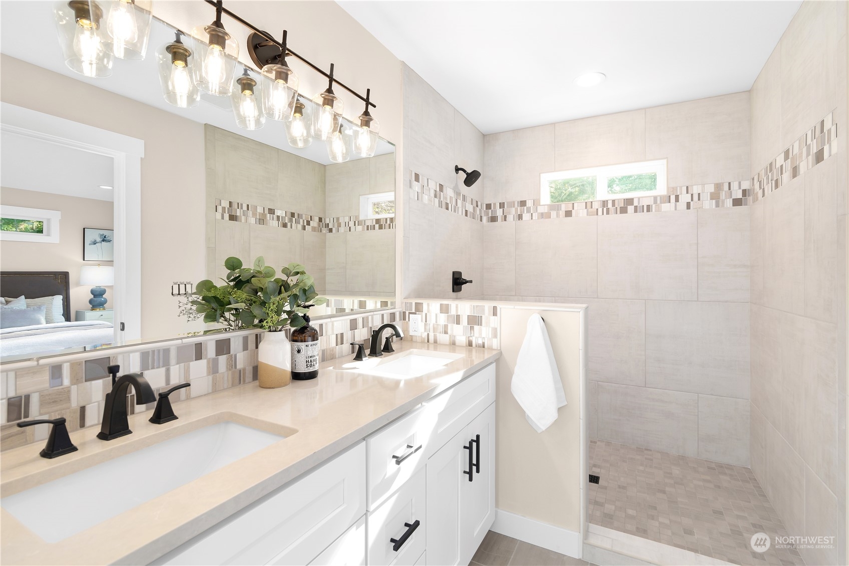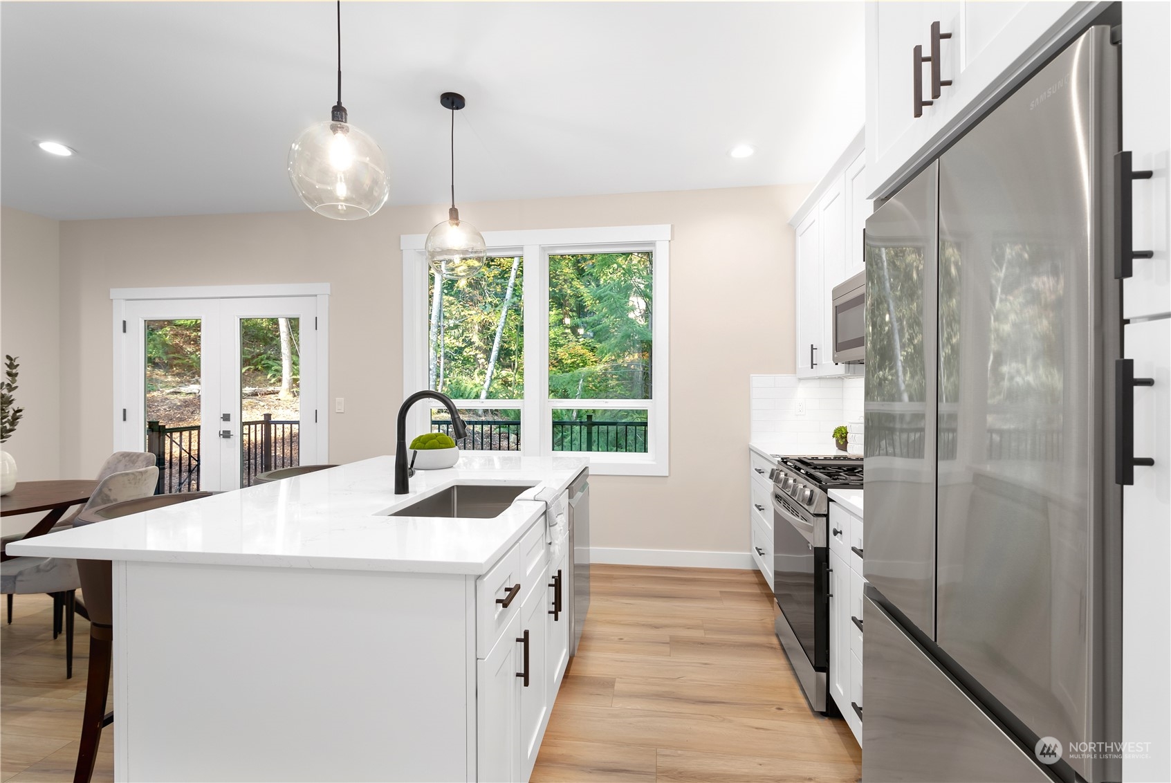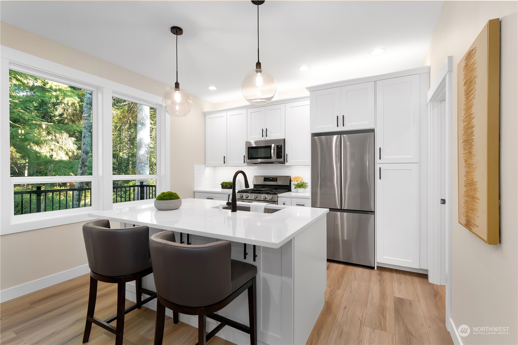 Welcome to your brand NEW home in Sudden Valley! This home offers a luxury experience with high-end finishes, walk-in pantry, air conditioning, and upgraded packages throughout. Beautifully designed and move-in ready. The spacious primary bedroom opens to a large ensuite w/ walk-in tile shower, quartz counters, tile floor & massive walk-in closet! Kitchen has quartz counters, SS appliances, soft close drawers & eat-in island. Upstairs you'll find 2 additional bedrooms with access to their own full bath. Open up your backdoor to a fully gated deck with greenbelt and seasonal creek to the right, serene nature and walking distance to local trails/parks (one of which is the largest park in Sudden Valley, Beaver Ridge)!