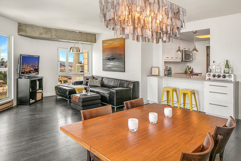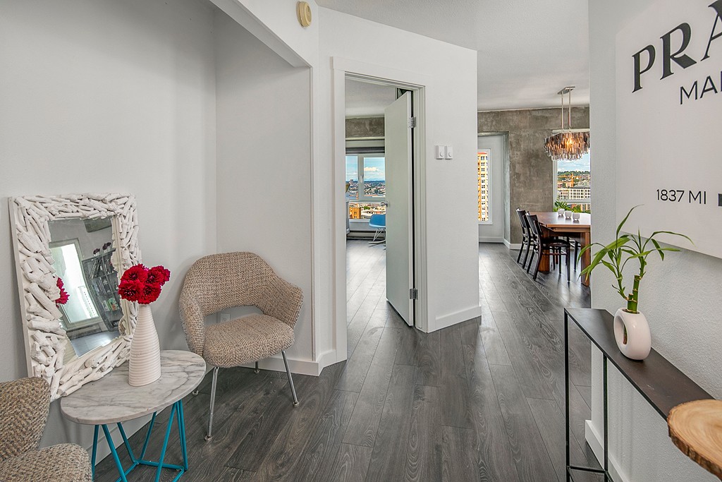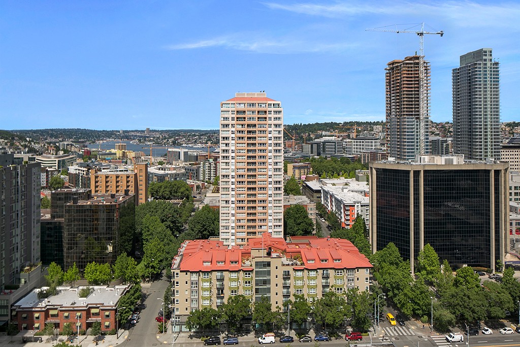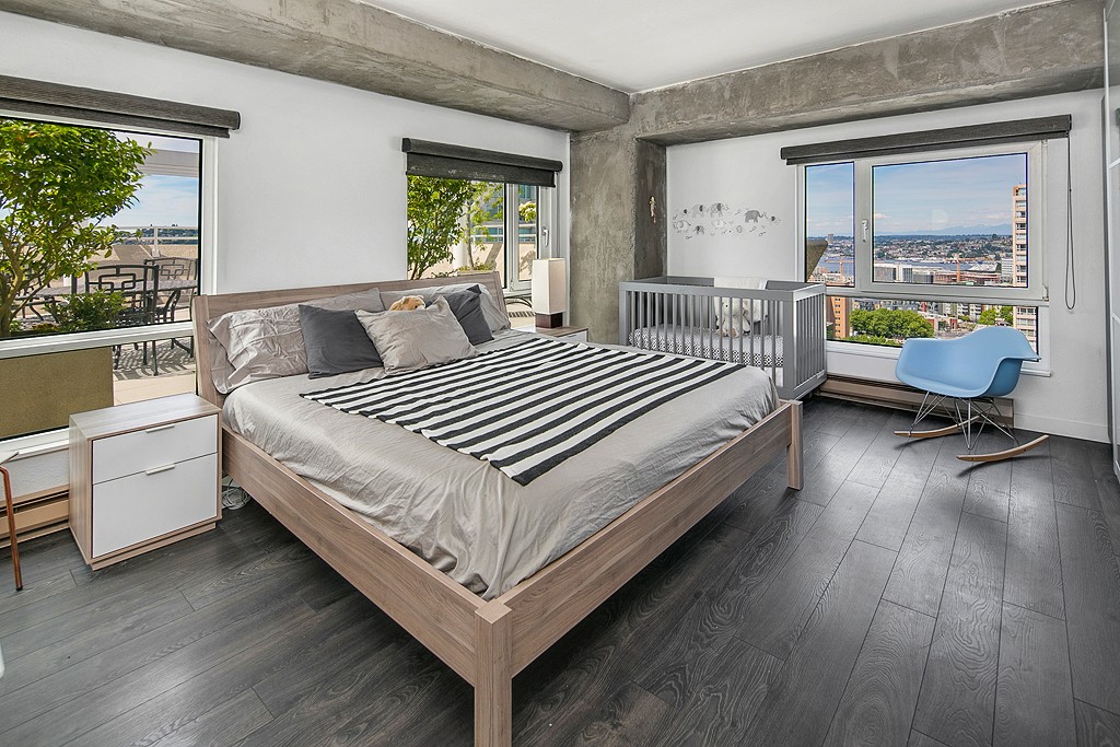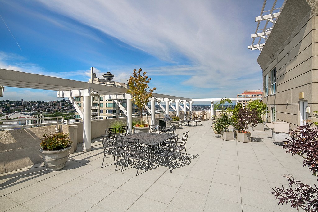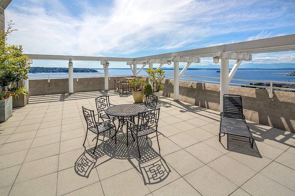 Elliott Bay, Mountain & City Views from this uniquely situated & private Penthouse condo at desirable residential Arbor Place! Only 2 PH share this quiet floor, flanked by Expansive View Terrace. Sophisticated palette of modern whites, Dove grey engineered flooring, Architectural exposed concrete columns. Newly installed Chefs kitchen & bath. Stylish rustic door detail artfully shields laundry. Lg Master, frosted glass front closet systems. Low HOA of $ 681.00 Walk to location, 24-7 Concierge