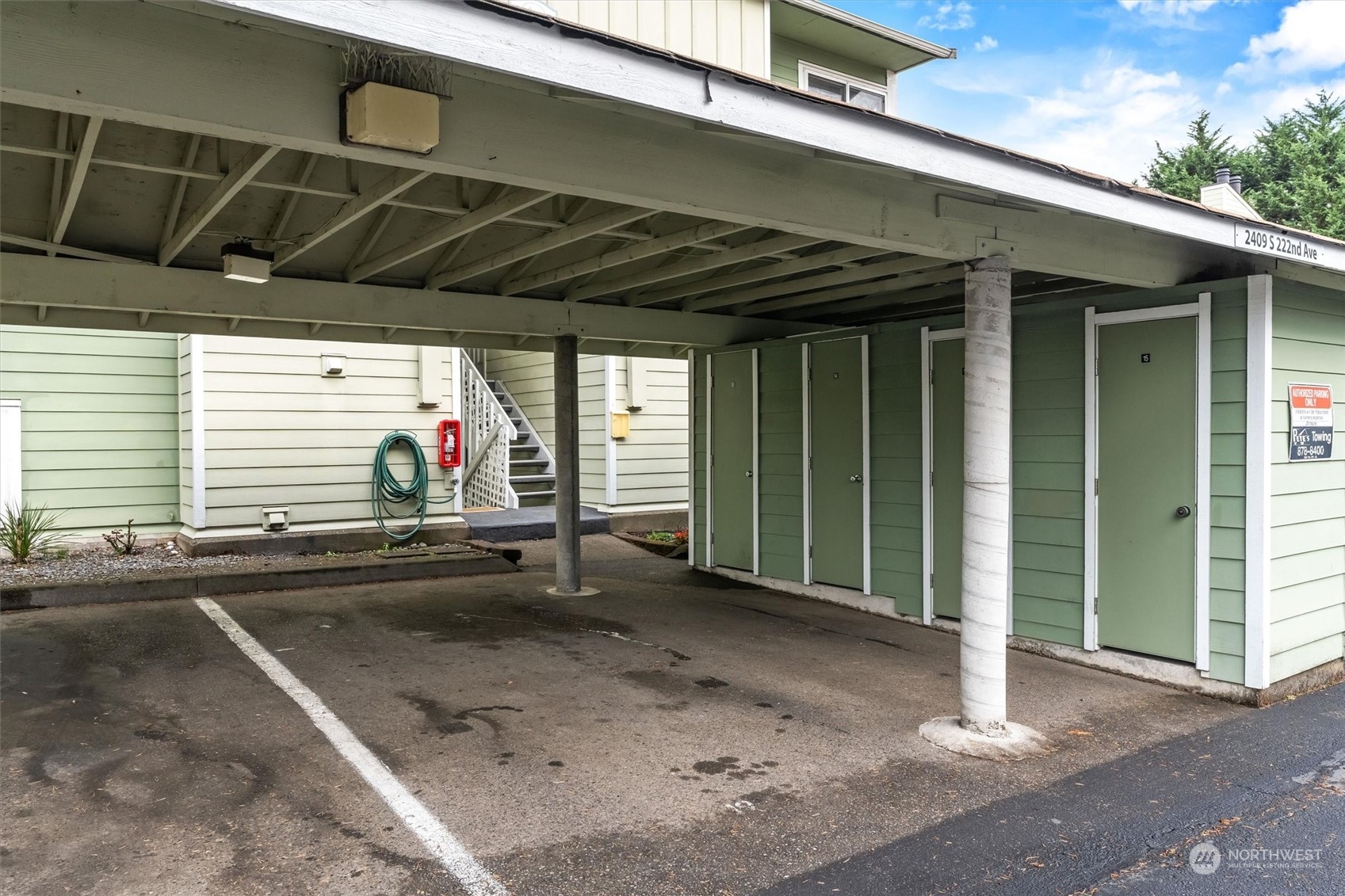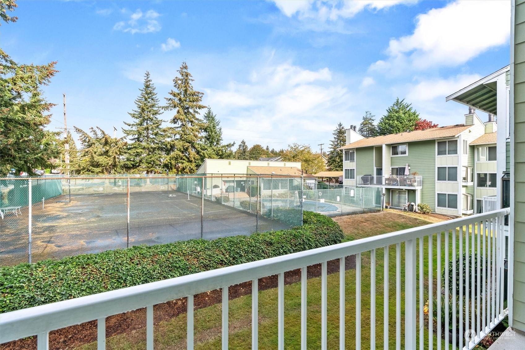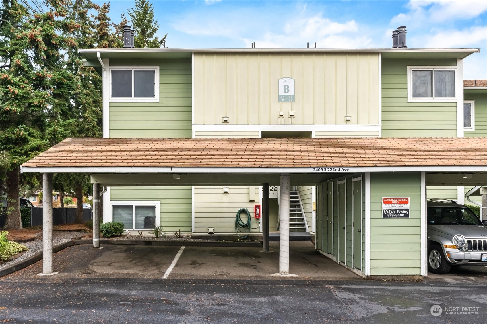 *GRANT ELIGIBLE* Situated in the corner & on the top floor, this 2 story home lives privately. 1,138 sqft includes 2 bedrooms & 1.5 bathrooms. Recent updates: new cabinets, carpet, baseboards & interior paint! The main level has the kitchen w/ ample storage & counter space + a passthrough window to the open living area where there’s dining & a comforting fireplace in the living room. Convenient half bath on the main level, too. Plus, the private covered balcony overlooking the community athletic courts & pool! Both spacious bedrooms are upstairs, as is the large bathroom w/ double sinks & laundry room w/ full-size washer & dryer. Home comes w/ a designated, covered parking spot & storage. The community has a clubhouse, hot tub & sauna too.