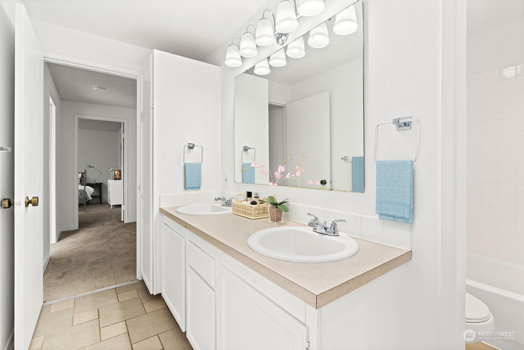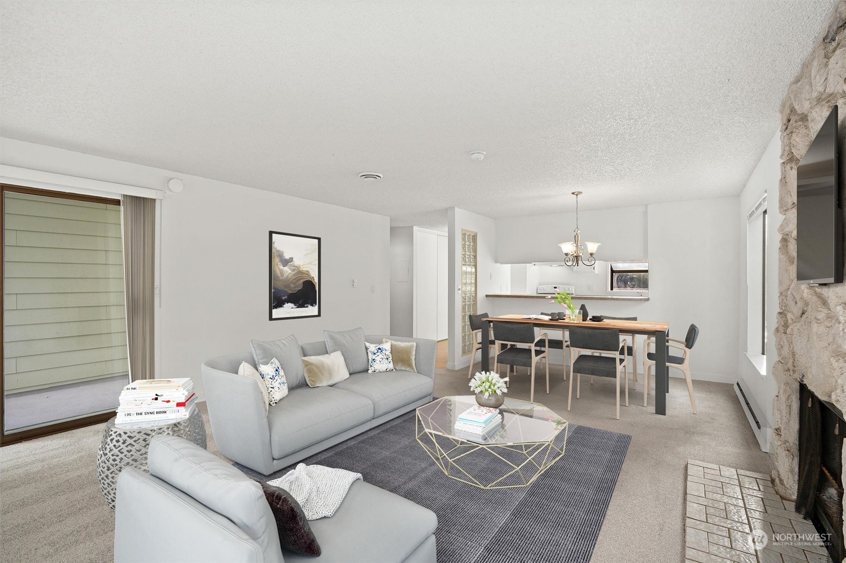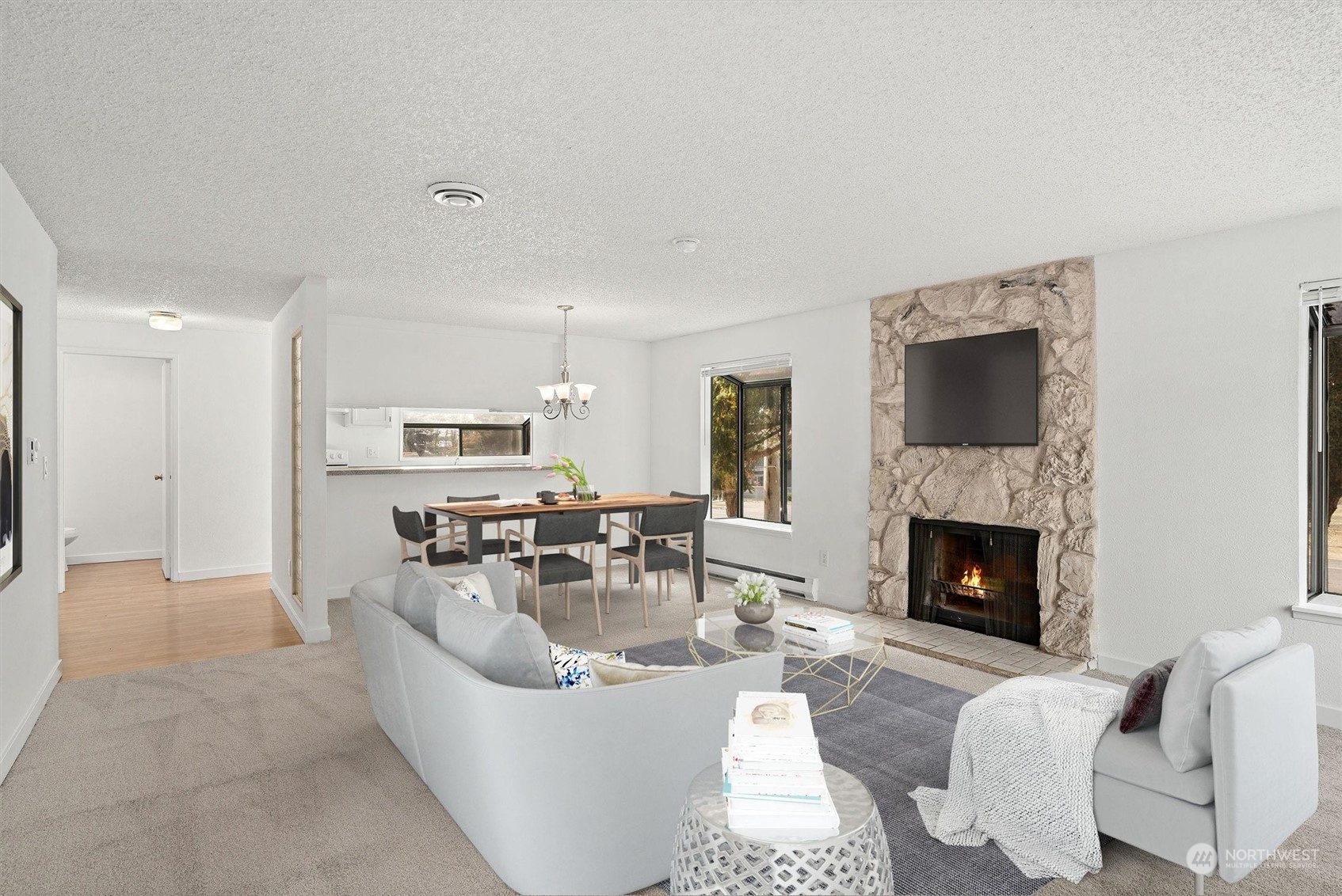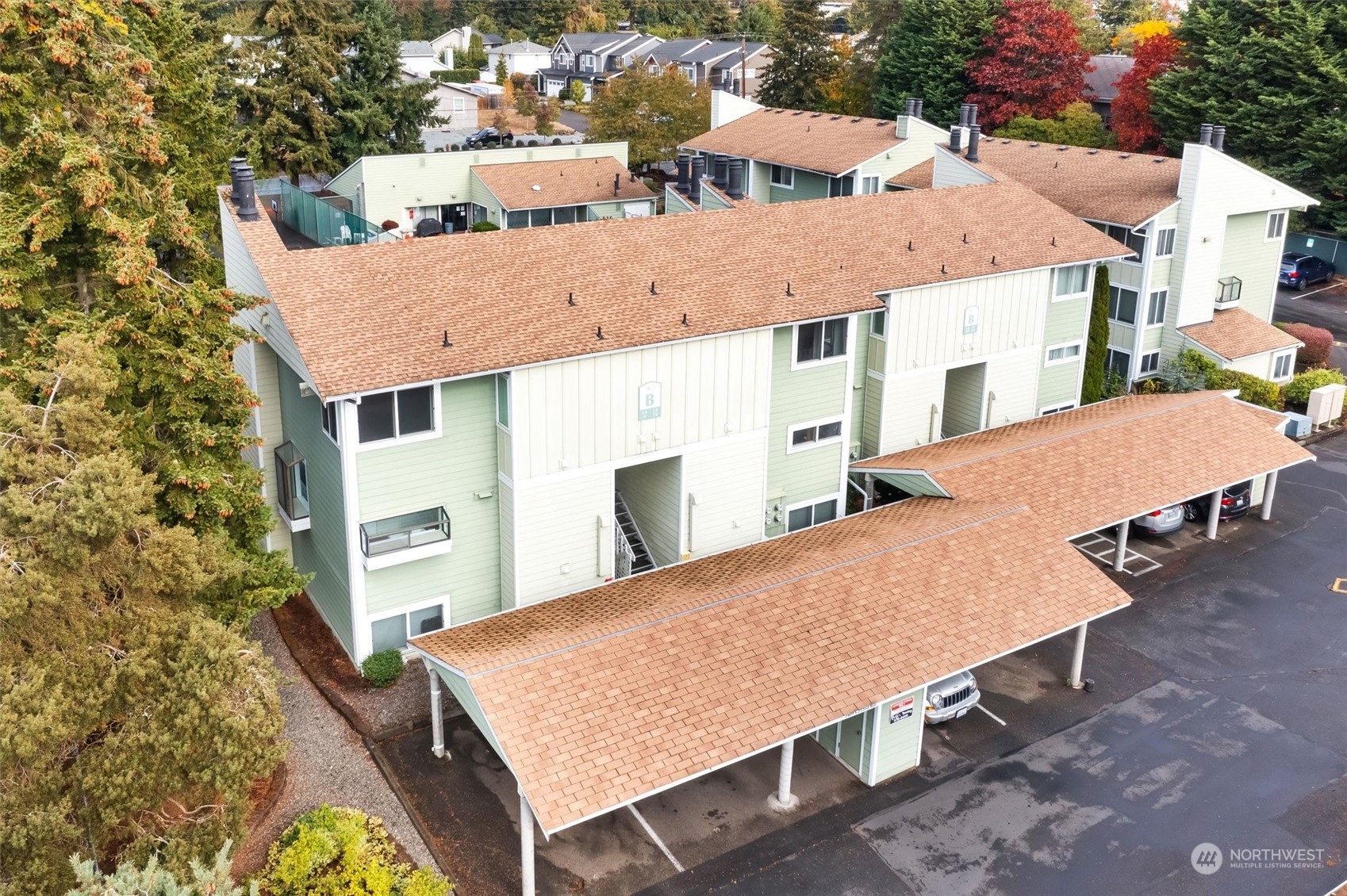 *GRANT ELIGIBLE* Situated in the corner & on the top floor, this 2 story home lives privately. 1,138 sqft includes 2 bedrooms & 1.5 bathrooms. Recent updates: new cabinets, carpet, baseboards & interior paint! The main level has the kitchen w/ ample storage & counter space + a passthrough window to the open living area where there’s dining & a comforting fireplace in the living room. Convenient half bath on the main level, too. Plus, the private covered balcony overlooking the community athletic courts & pool! Both spacious bedrooms are upstairs, as is the large bathroom w/ double sinks & laundry room w/ full-size washer & dryer. Home comes w/ a designated, covered parking spot & storage. The community has a clubhouse, hot tub & sauna too.