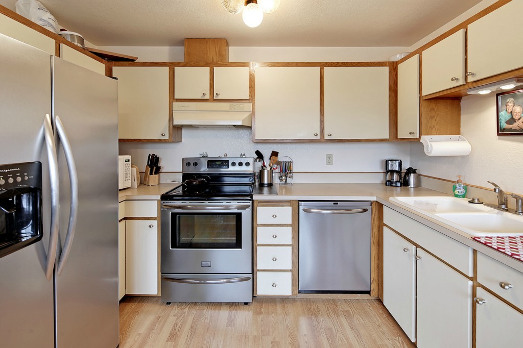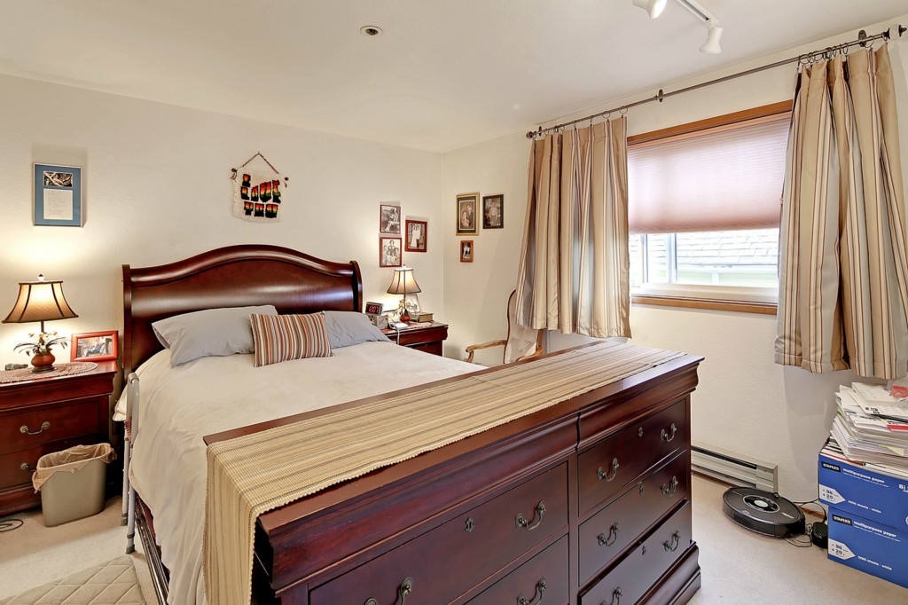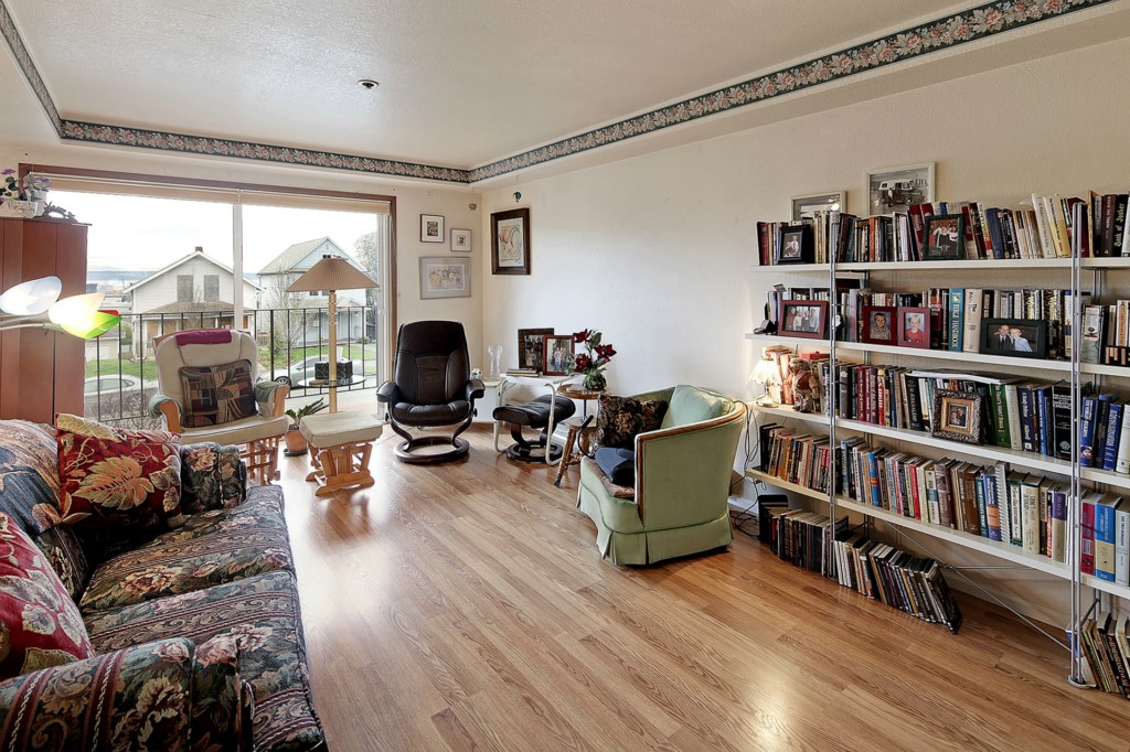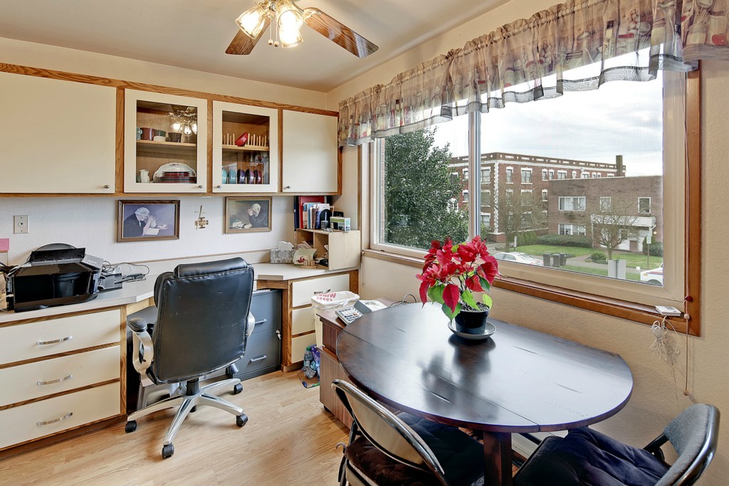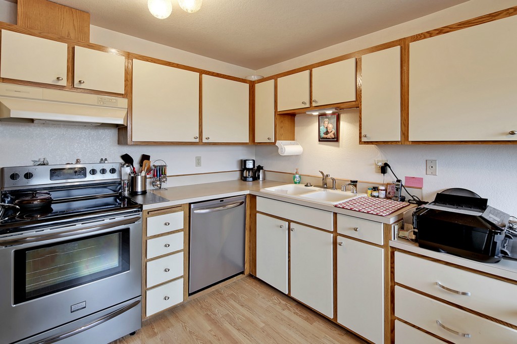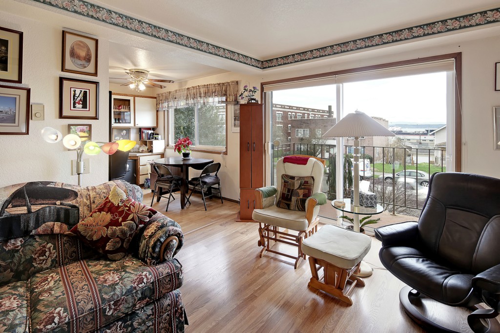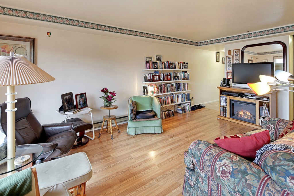 This home is in wonderful condition and is ready to enjoy. It has a pleasant, open outlook that includes a view of the mountains and the sound. Spacious living room with laminate flooring and doors to the balcony. Enjoy the view from the dining area and kitchen, which has stainless appliances and generous work space. Good sized master bedroom with adjacent full bath featuring a tub and separate shower. Lots of storage in unit, plus storage room in basement. Elevator building and great location.