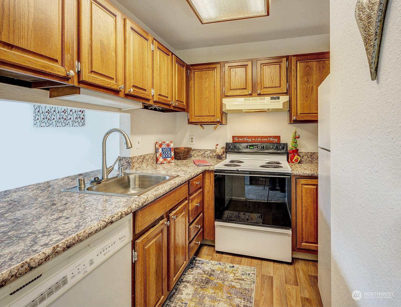 Great neighborhood. Edmonds 2 bedroom 1 ½ bath townhouse with 1034 sq.ft, extra bonus area, carport parking, and located in popular Golden Leaves Condominiums. Unit has security entrance, all new carpet and paint, newer windows, open floor plan, updated kitchen w/ new countertops, sink, and floor coverings, nice sitting bar, updated fixtures throughout, remodeled ½ bath powder room downstairs, private deck with storage, open staircase with skylight, updated full bath upstairs, good sized bedrooms with large closets, bonus area/office/craft room off the utility room, assigned carport parking space and extra parking. Complex has cabana room with hot tub, sauna, and exercise area. Nice complex has new roof in 2020. Home warranty included!