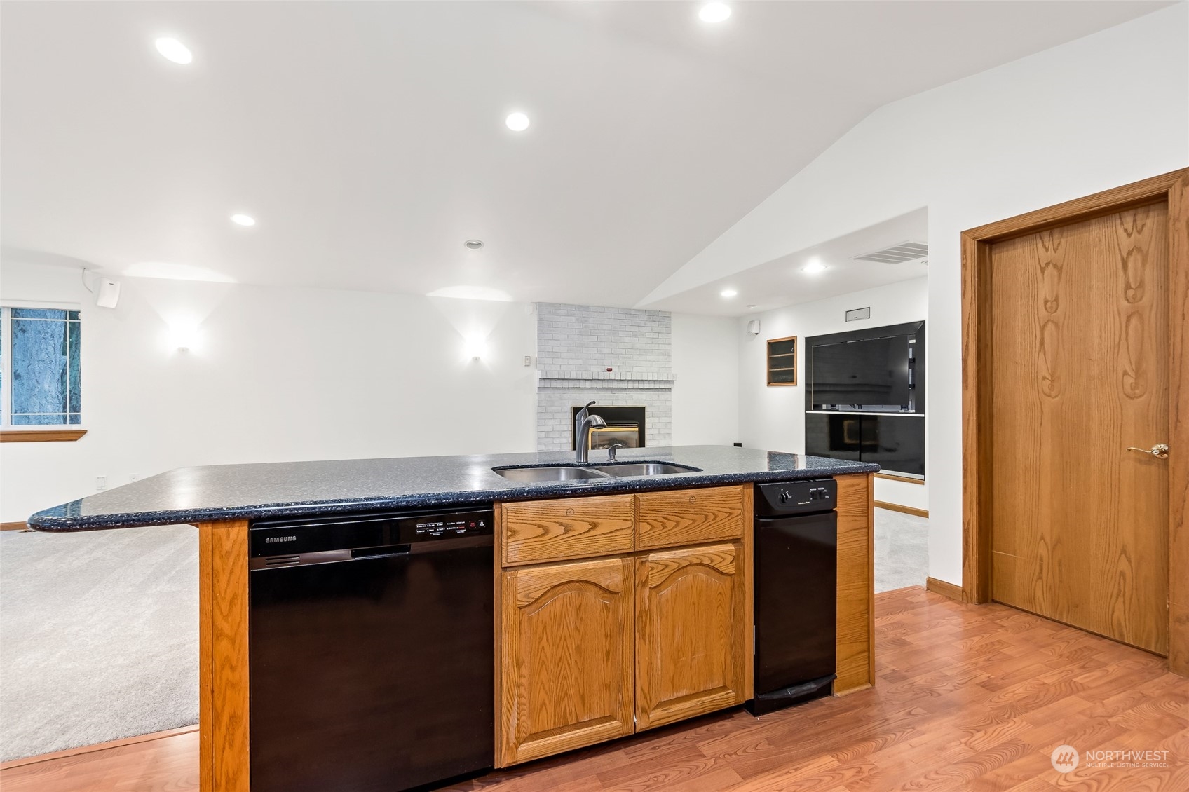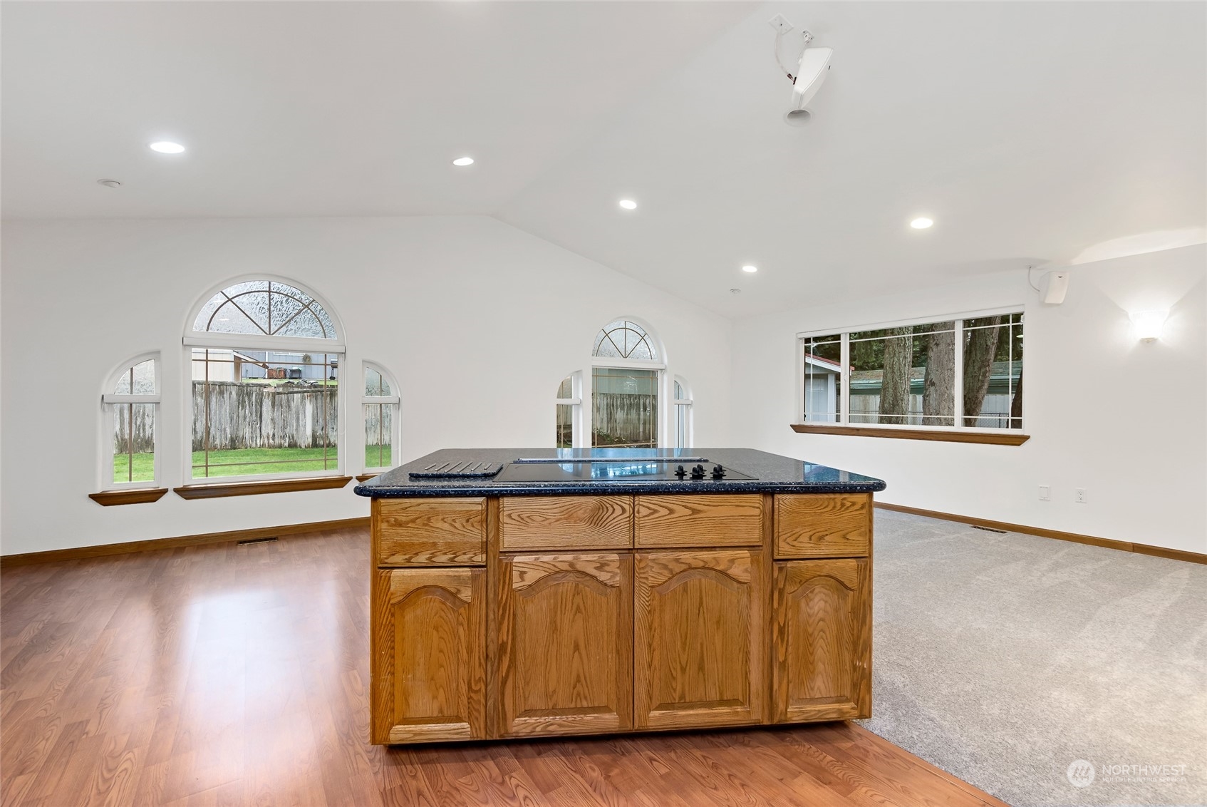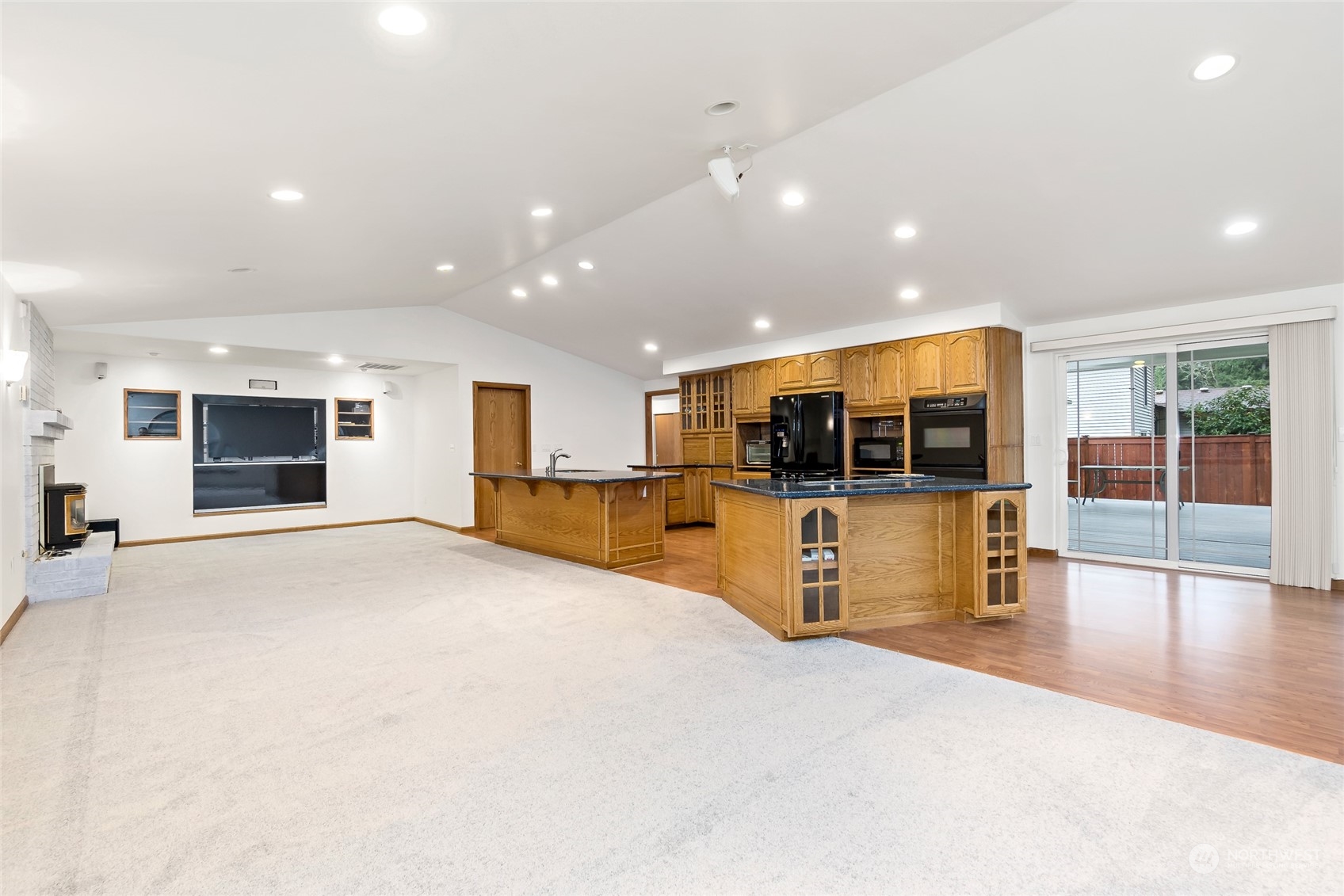 BEAUTIFUL 1876 sqft spacious rambler w/open concept in small quiet friendly neighborhood that features 3 bdrms 2 bthrm w/primary suite w/ext dr to back deck, new carpet throughout, cathedral ceilings,heat pump & a/c,Surround sound system,flat screen TV,custom oak cabinetry w/lots of storage which includes dble ovens,2 islands w/eating space,cook top range w/dn draft ventilation, kitchen sink,dishwasher,trash compactor & garbge disposal,Central vac system. Snuggle up to a warm cozy propane fire insert-also includes formal dinning & living rm. Outside features include,newer roof,leafGuard gutters,covered deck w/outdr spkrs,covrd carport,custom blt 14x14 shed w/loft & cabinetry, fully fenced backyard, hm wired for gen,gen included. RV parking.