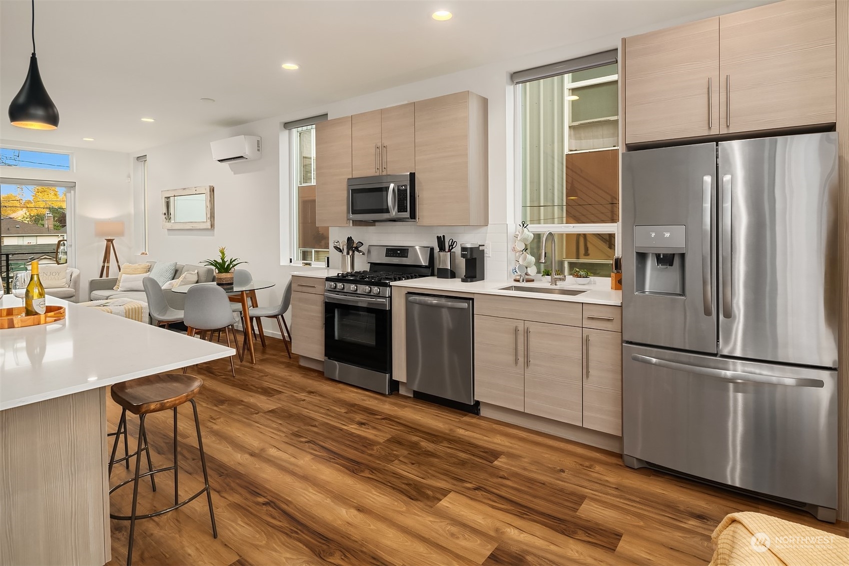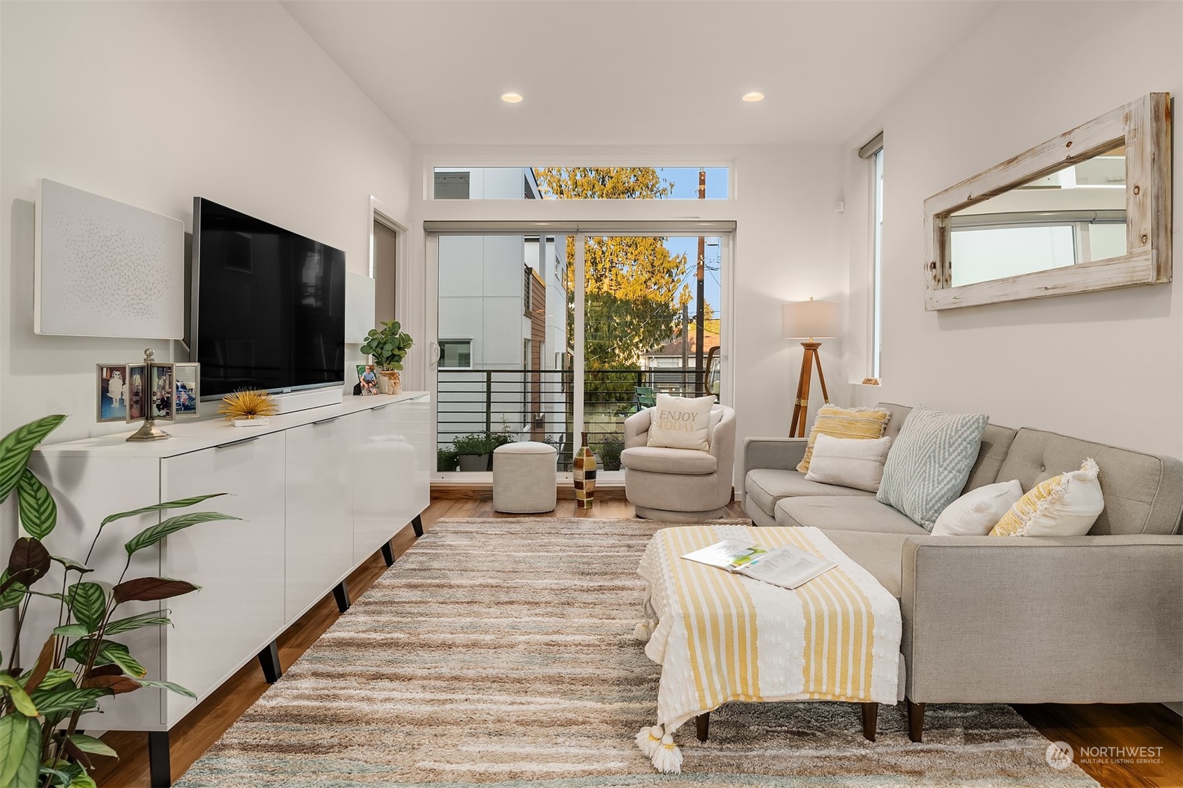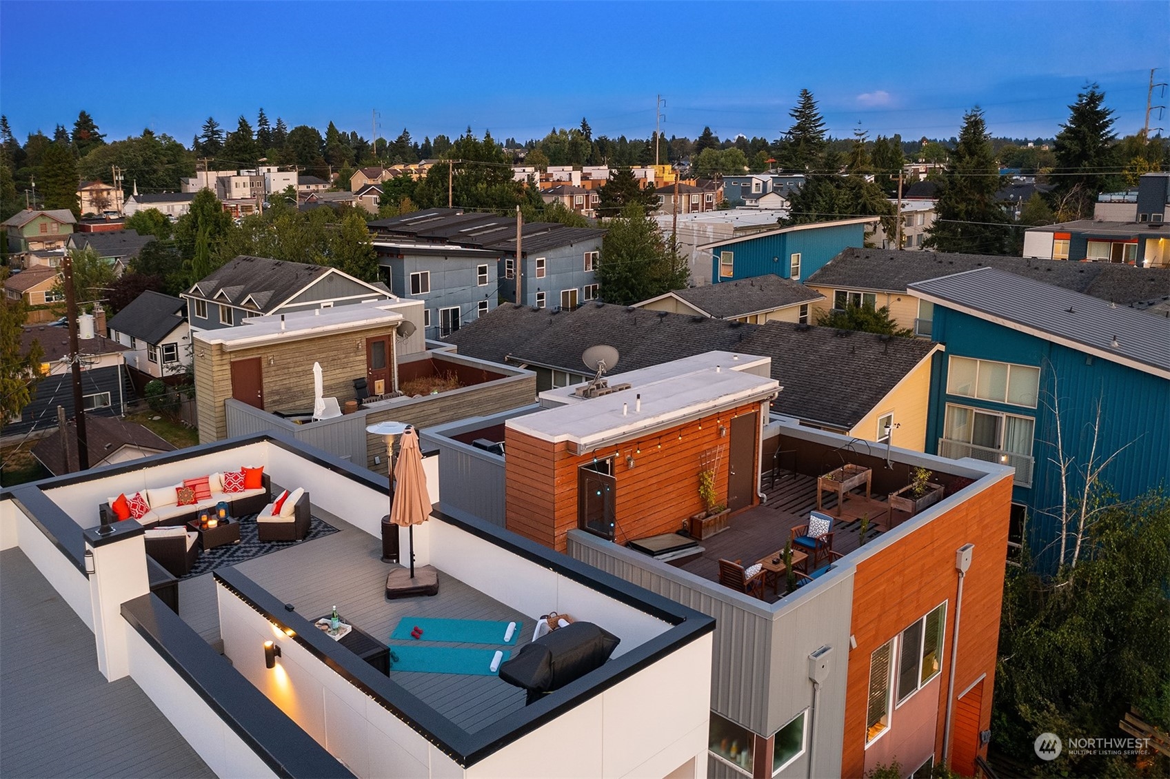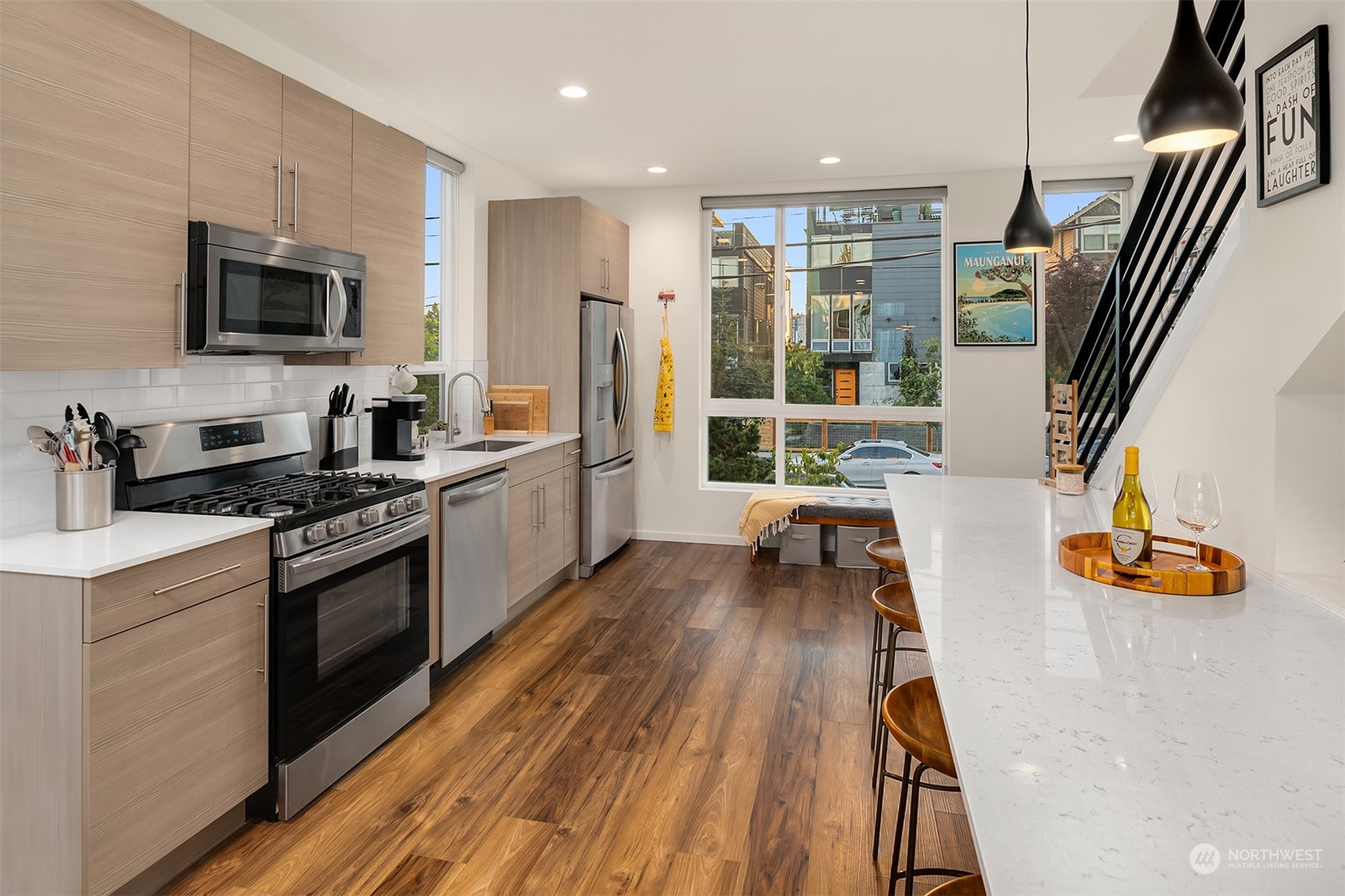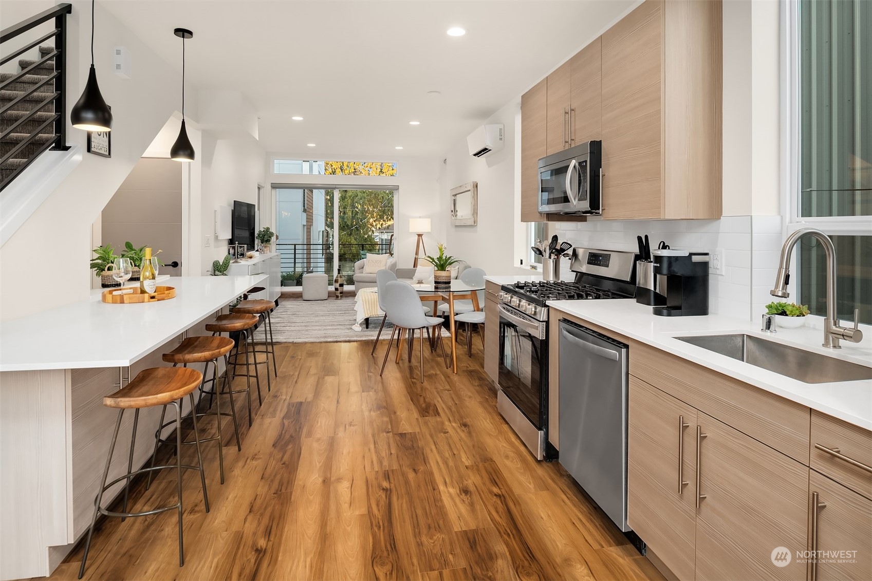 BETTER THAN NEW HOME by ecoBuilders, EASY ACCESS GARAGE, Additional exterior space & 1 YEAR WARRANTY INCLUDED!! Contemporary 2 bed/den/1.5 bath end unit with natural light on three sides. Open living space with oversized bar and extra cabinet storage topped with quartz counters, gas cooking and SS appliances. A powder room, balcony and custom shades complete this space. The entry level boasts a home office and access to the garage with extra storage. Pet owners will love the fully fenced courtyard. The 2nd level includes 2 bedrooms, an oversized bath with double vanity, large walk-in shower and access to the rooftop deck finished with Trex decking. Ring security system & LG front load washer/dryer included. Option to purchase furnished!