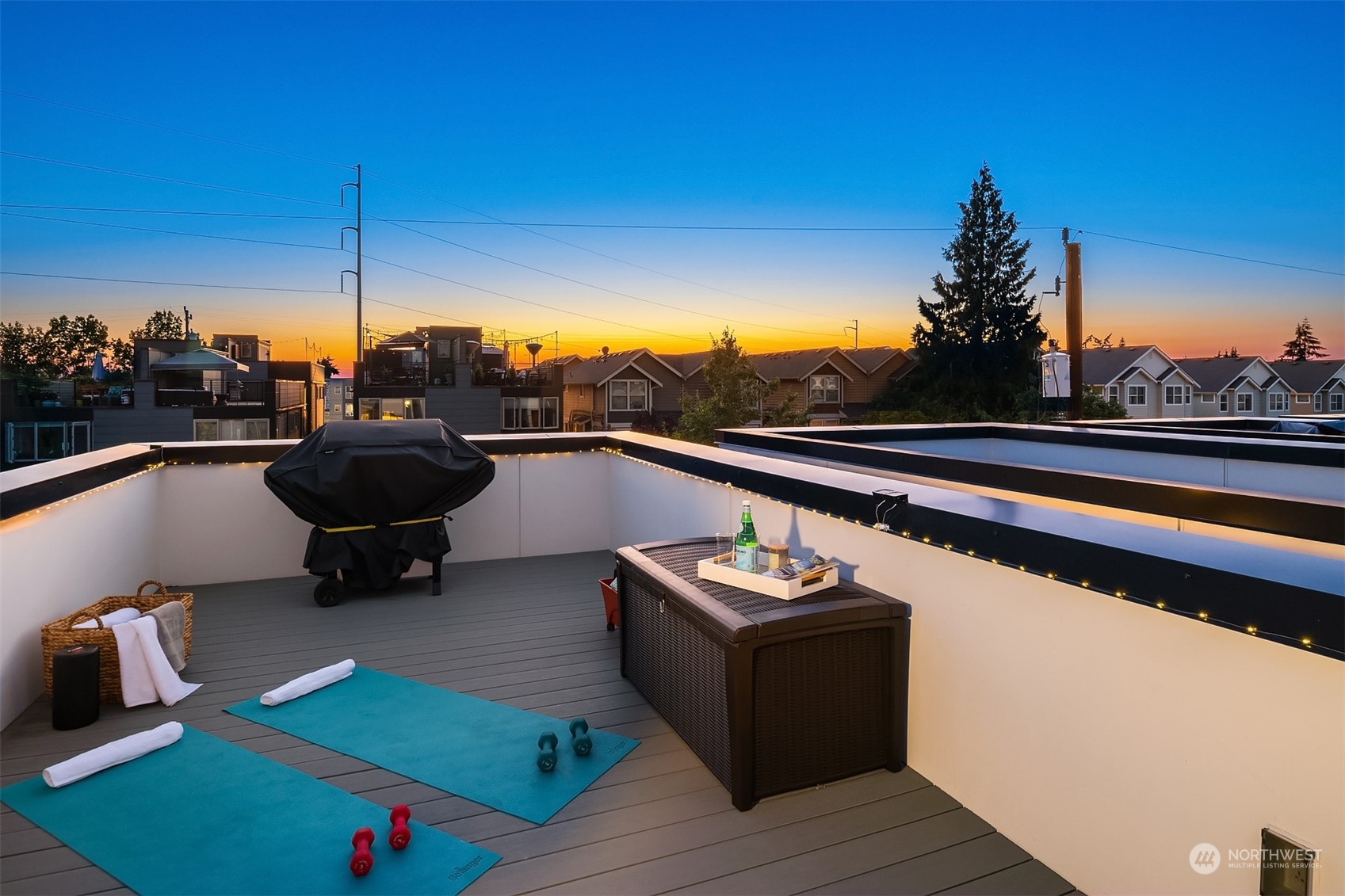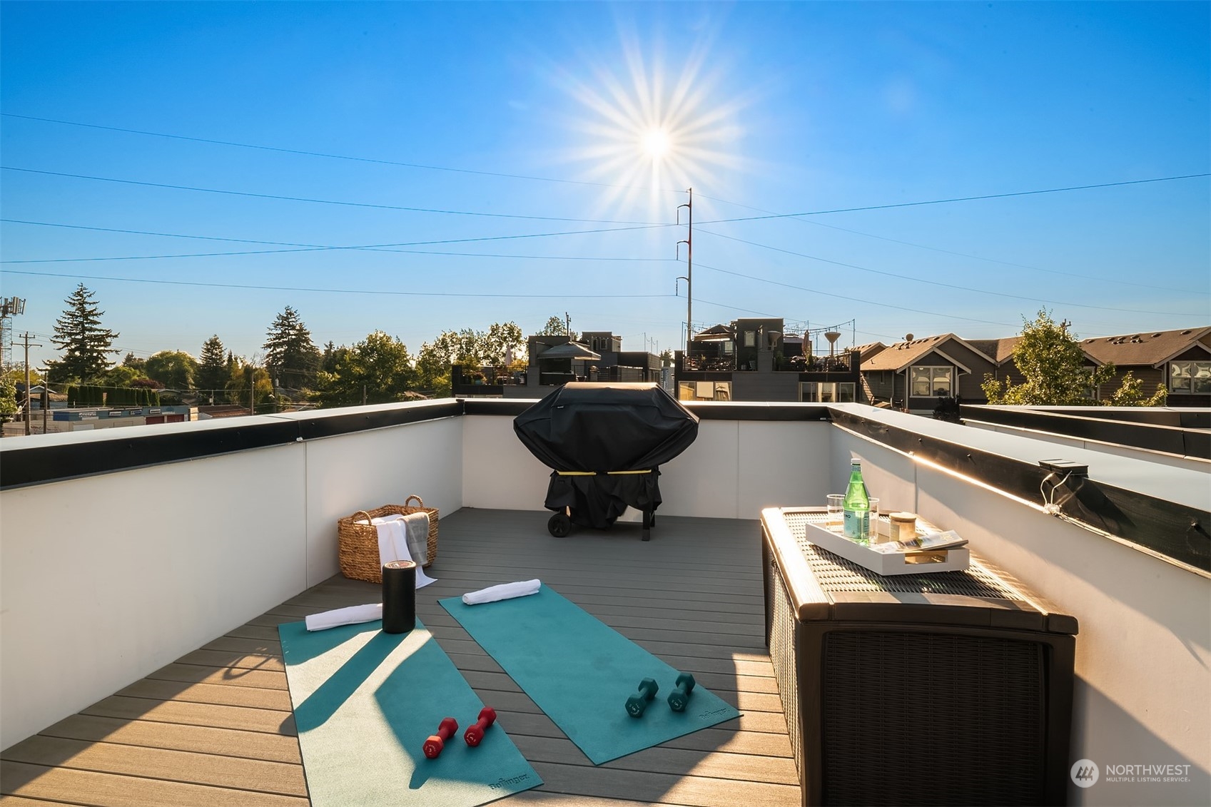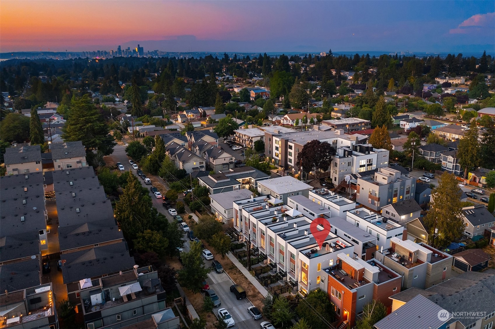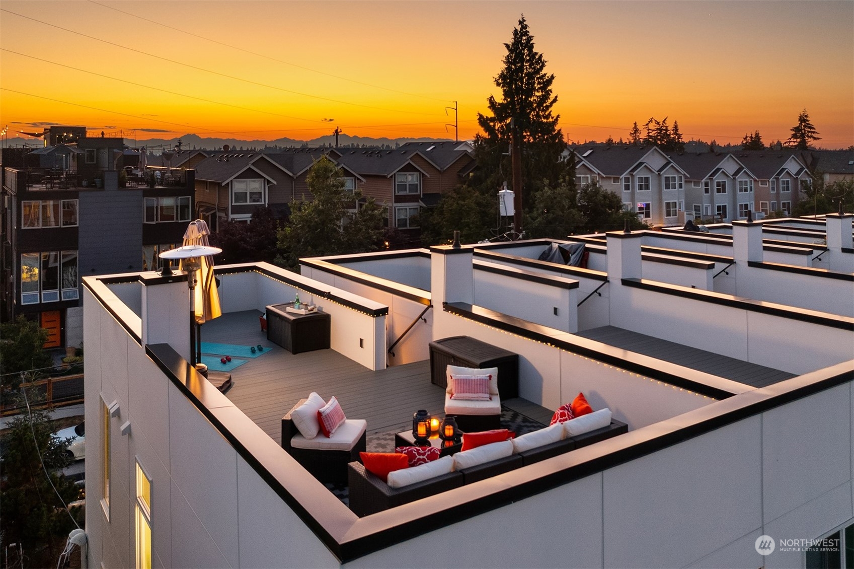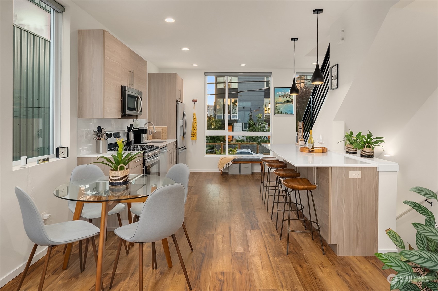 BETTER THAN NEW HOME by ecoBuilders, EASY ACCESS GARAGE, Additional exterior space & 1 YEAR WARRANTY INCLUDED!! Contemporary 2 bed/den/1.5 bath end unit with natural light on three sides. Open living space with oversized bar and extra cabinet storage topped with quartz counters, gas cooking and SS appliances. A powder room, balcony and custom shades complete this space. The entry level boasts a home office and access to the garage with extra storage. Pet owners will love the fully fenced courtyard. The 2nd level includes 2 bedrooms, an oversized bath with double vanity, large walk-in shower and access to the rooftop deck finished with Trex decking. Ring security system & LG front load washer/dryer included. Option to purchase furnished!